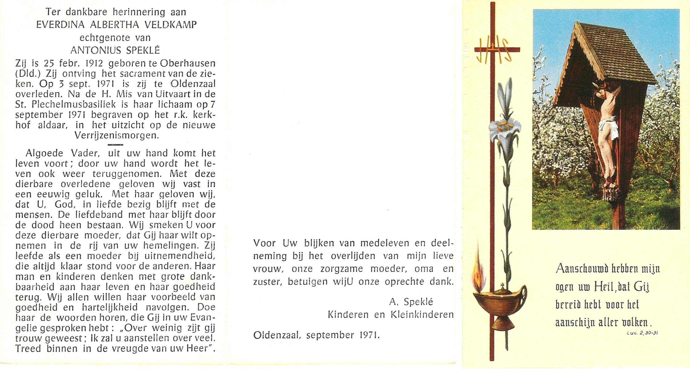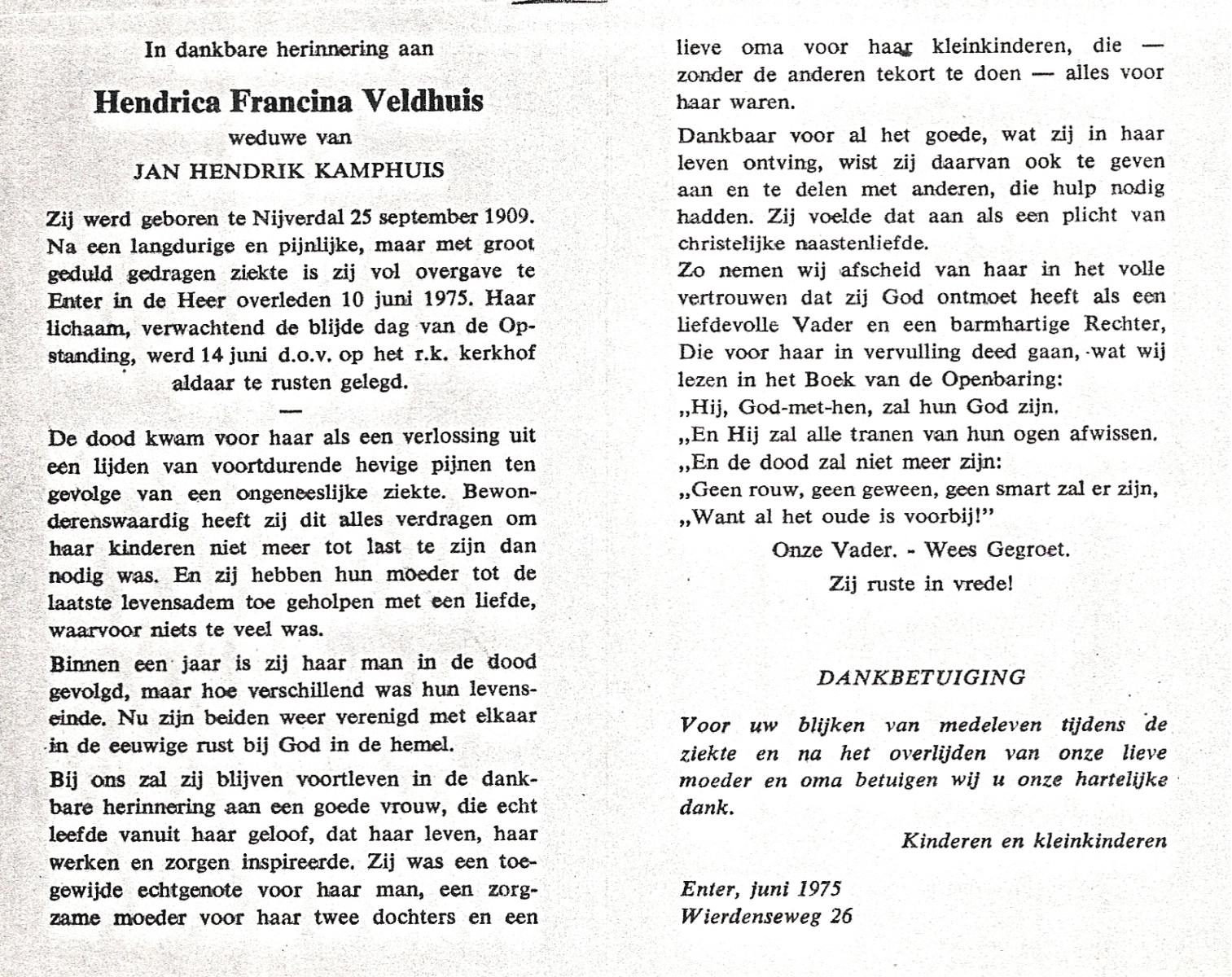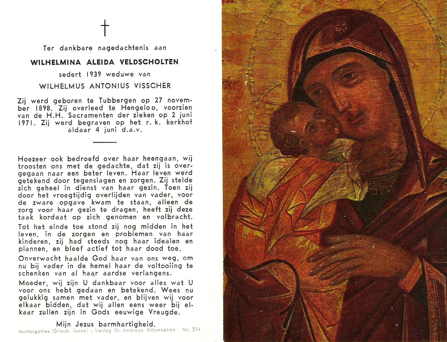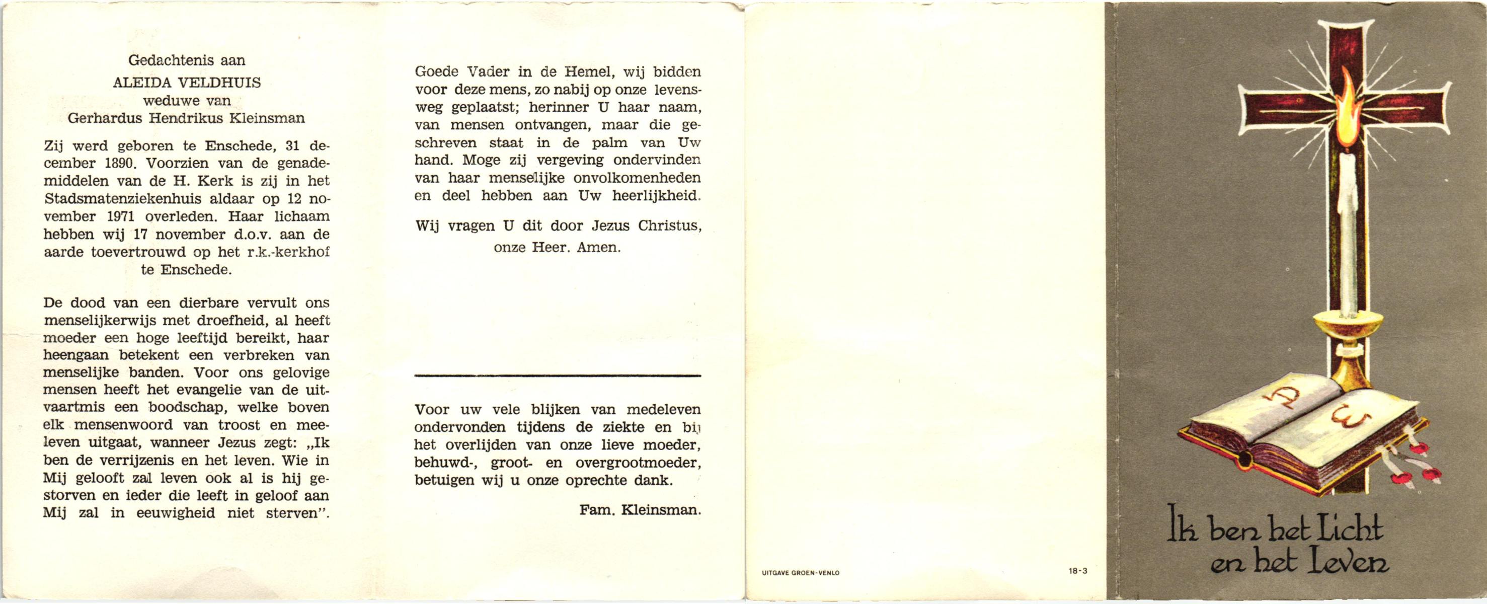 VELDHUIS, Aleida, geboren op 31-12-1890 te Enschede, overleden op 12-11-1971 te Enschede, ziekenhuis op 80-jarige leeftijd, begraven op 17-11-1971 te Enschede.
