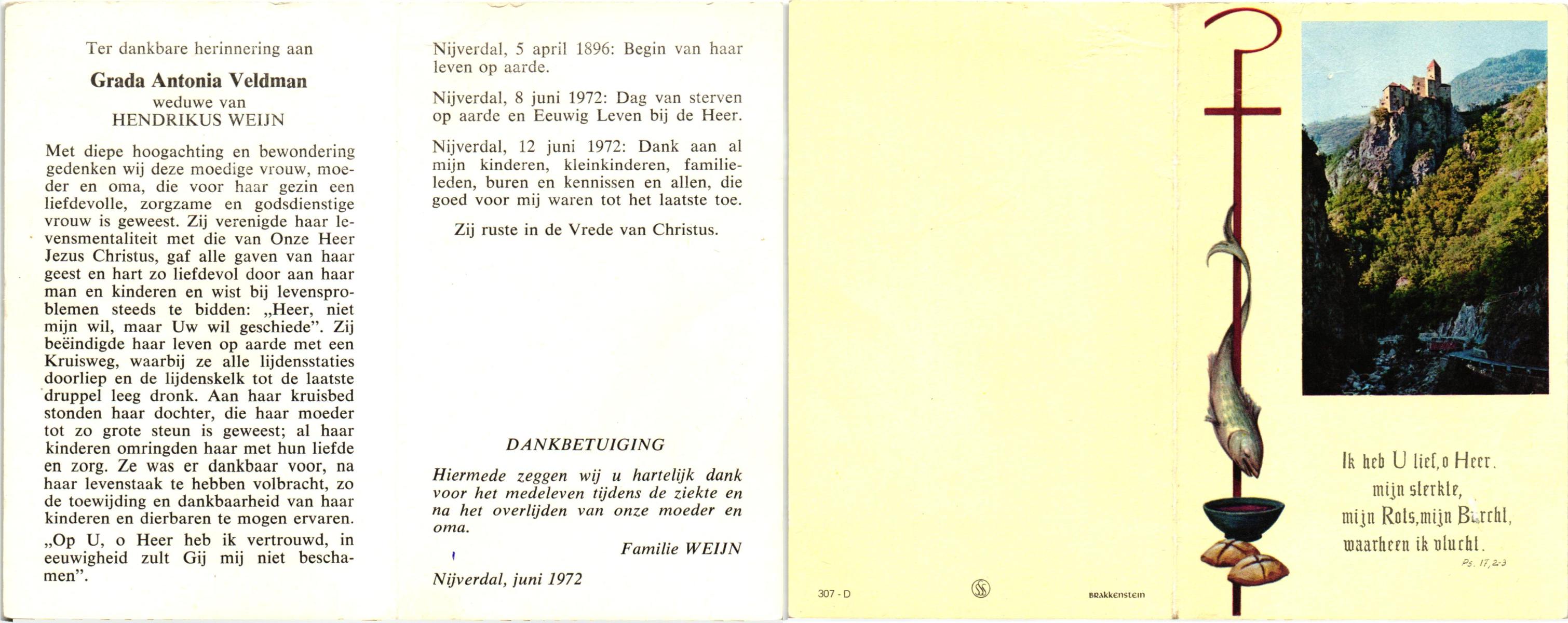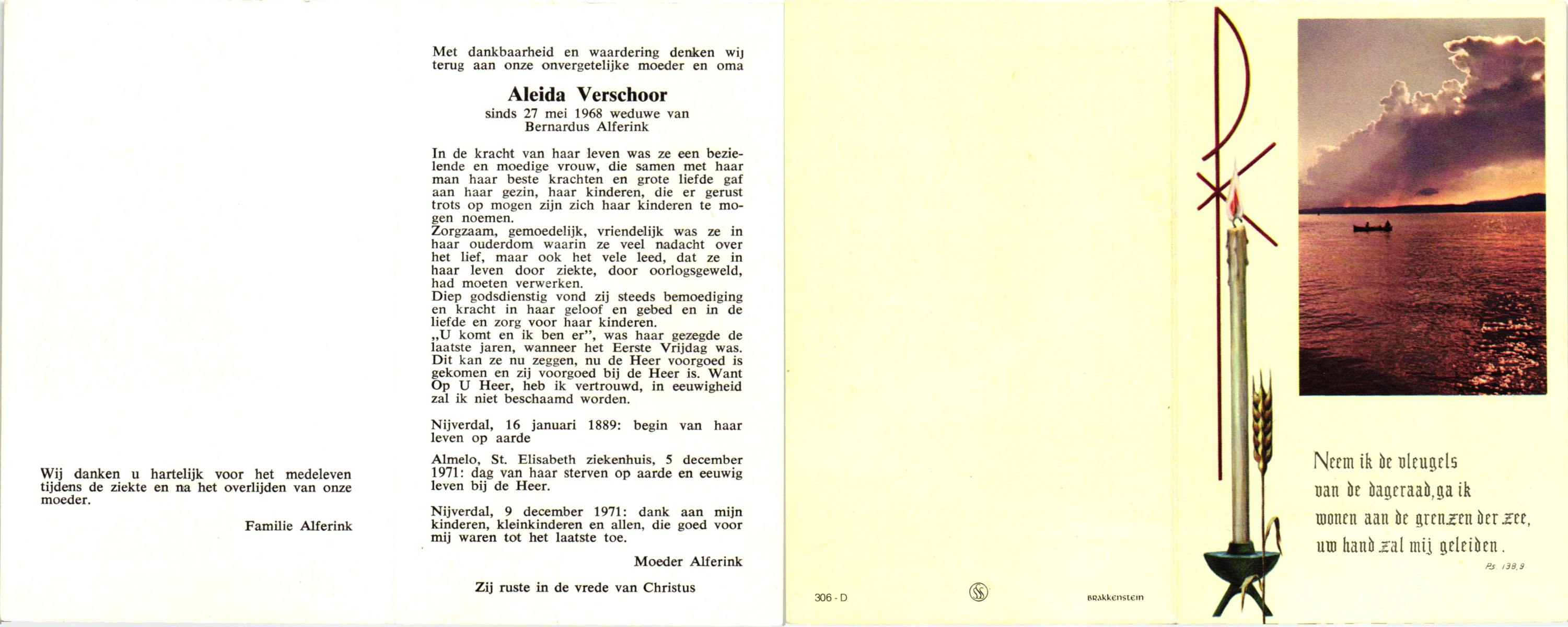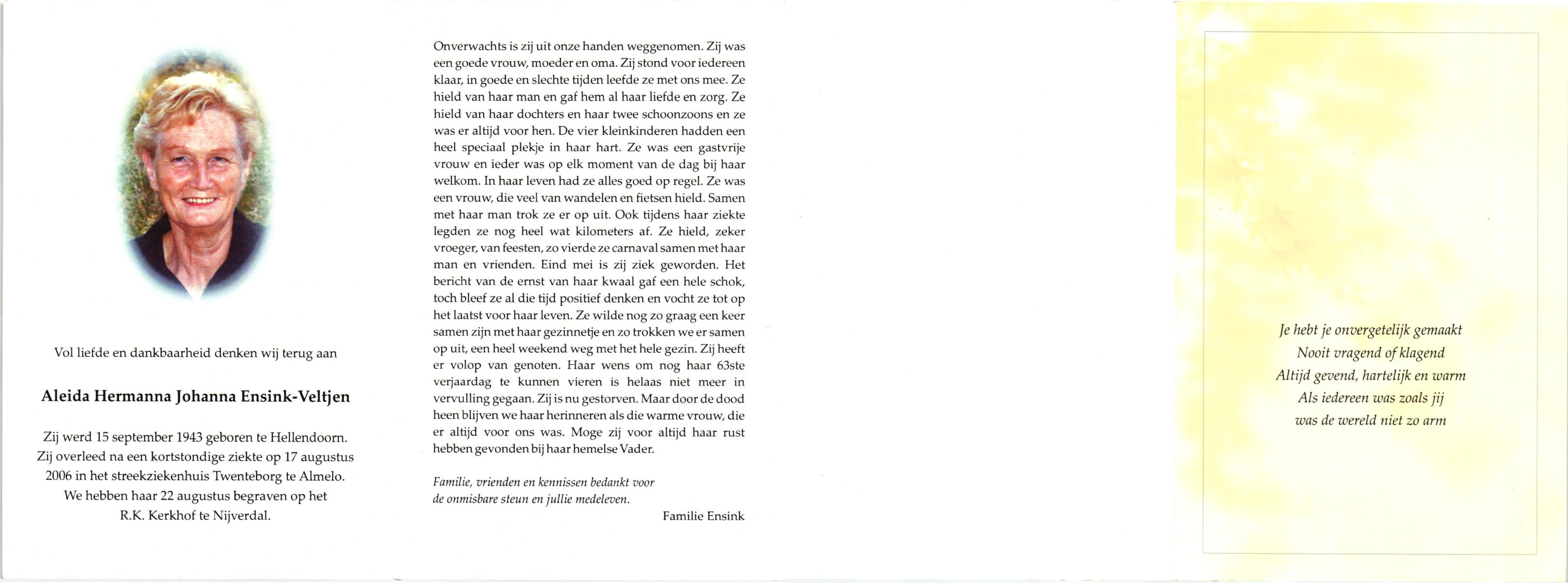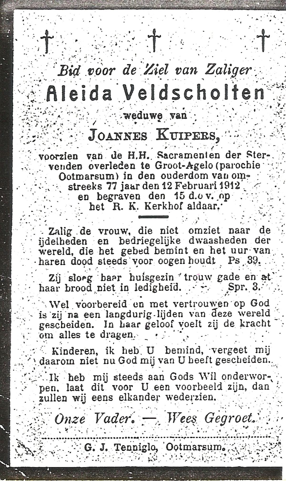 VELDHUIS, Aleida, geboren op 31-12-1890 te Enschede, overleden op 12-11-1971 te Enschede, ziekenhuis op 80-jarige leeftijd, begraven op 17-11-1971 te Enschede.