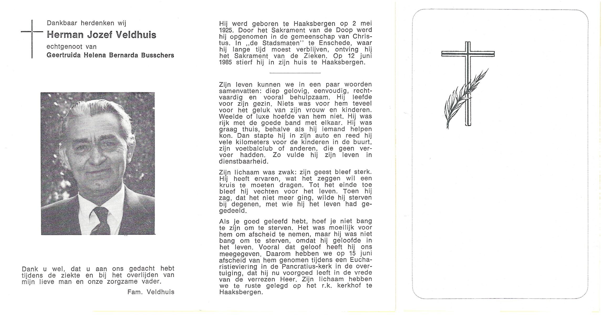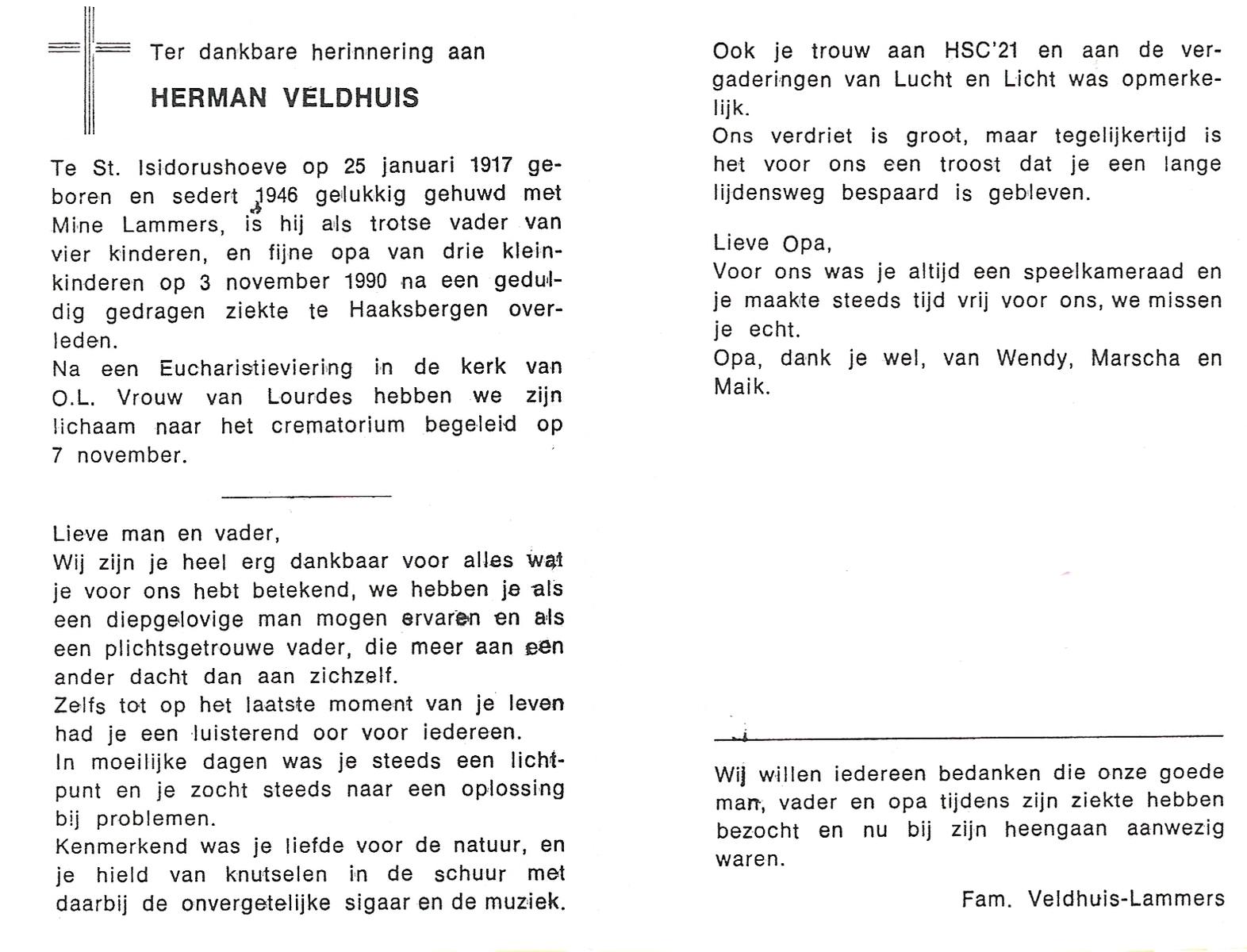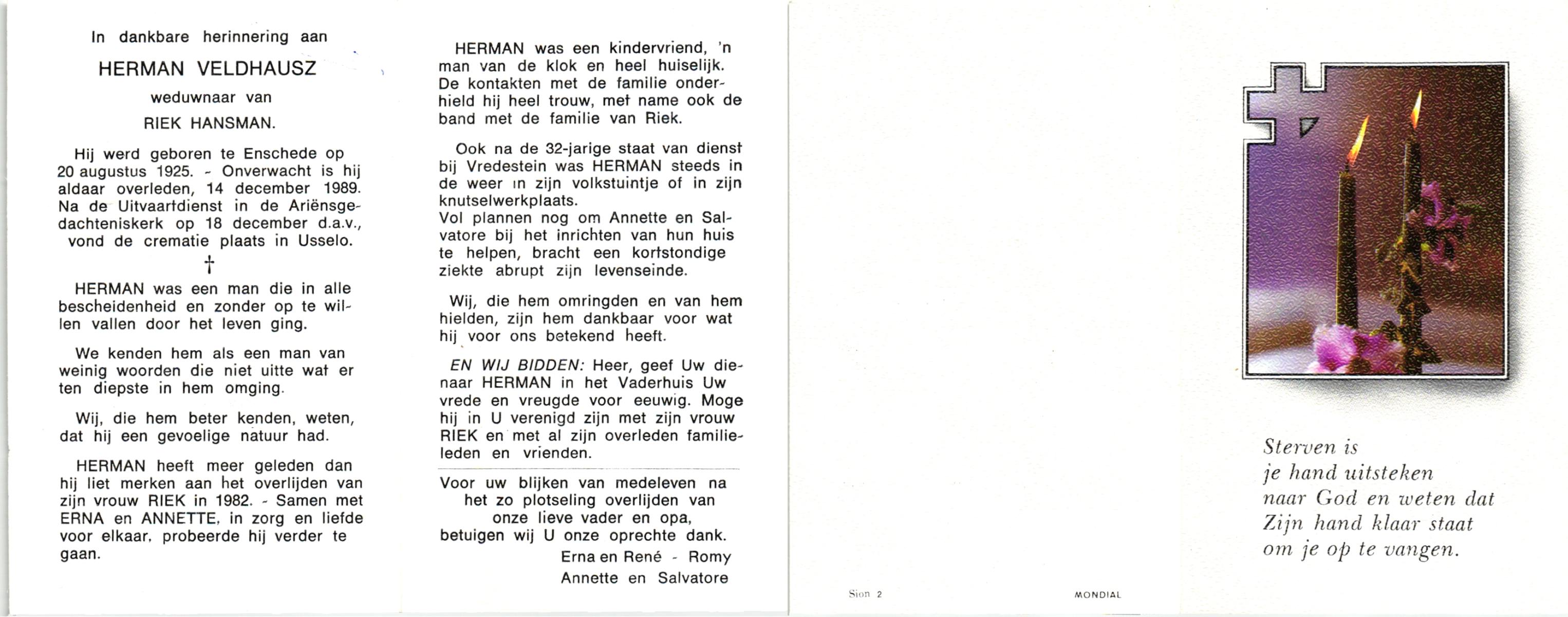 VELDHAUSZ, , Herman, geboren op 20-8-1925 te Enschede, overleden op 14-12-1989 te Enschede op 64-jarige leeftijd, gecremeerd op 18-12-1989 te Usselo.
