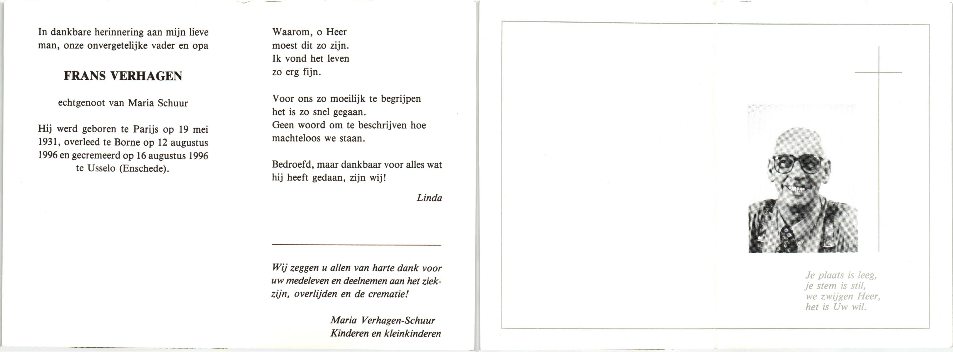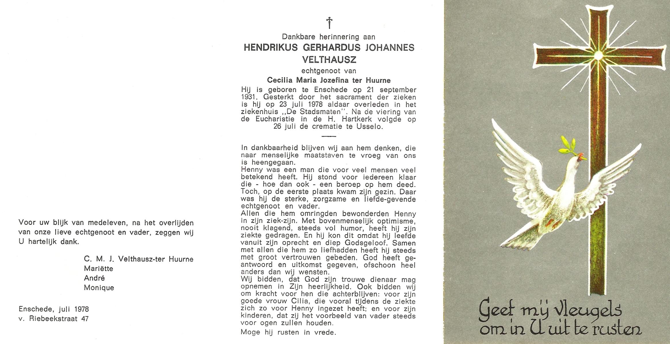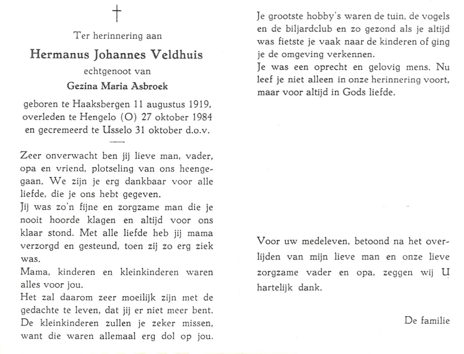 VELDHAUSZ, , Herman, geboren op 20-8-1925 te Enschede, overleden op 14-12-1989 te Enschede op 64-jarige leeftijd, gecremeerd op 18-12-1989 te Usselo.