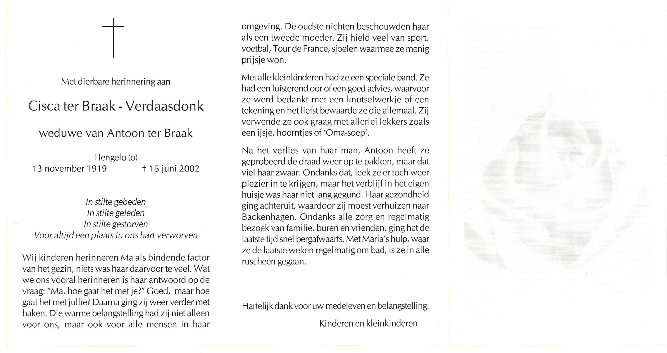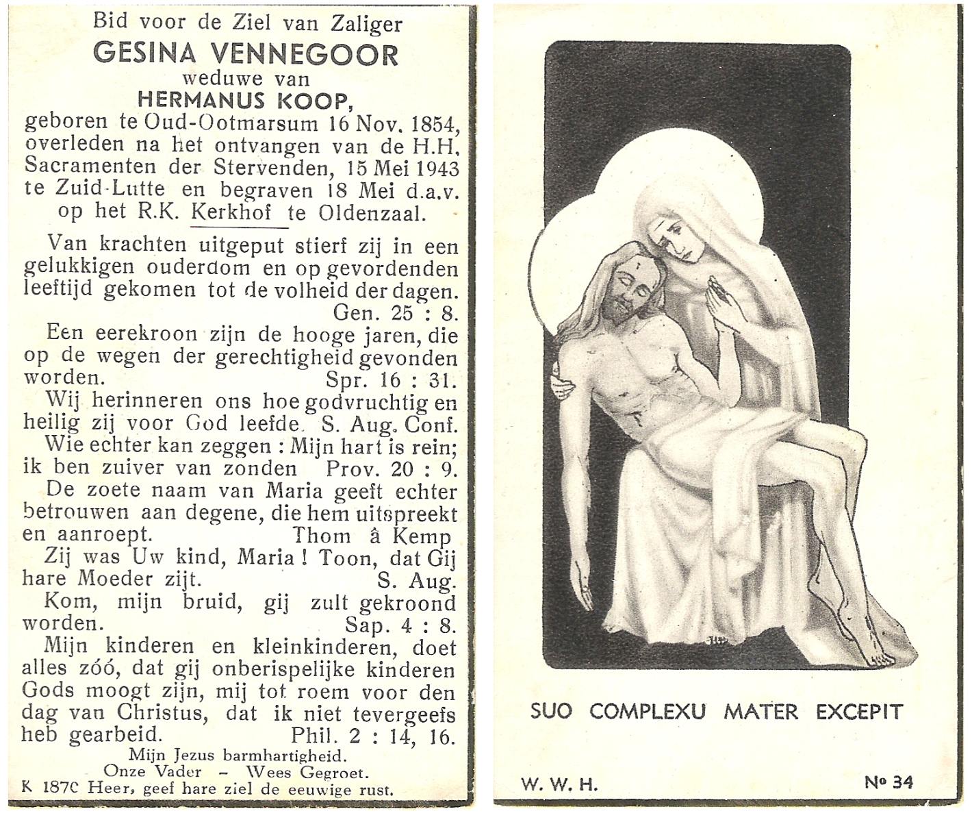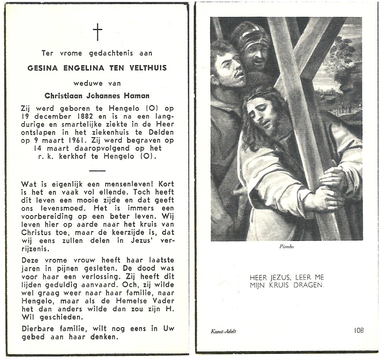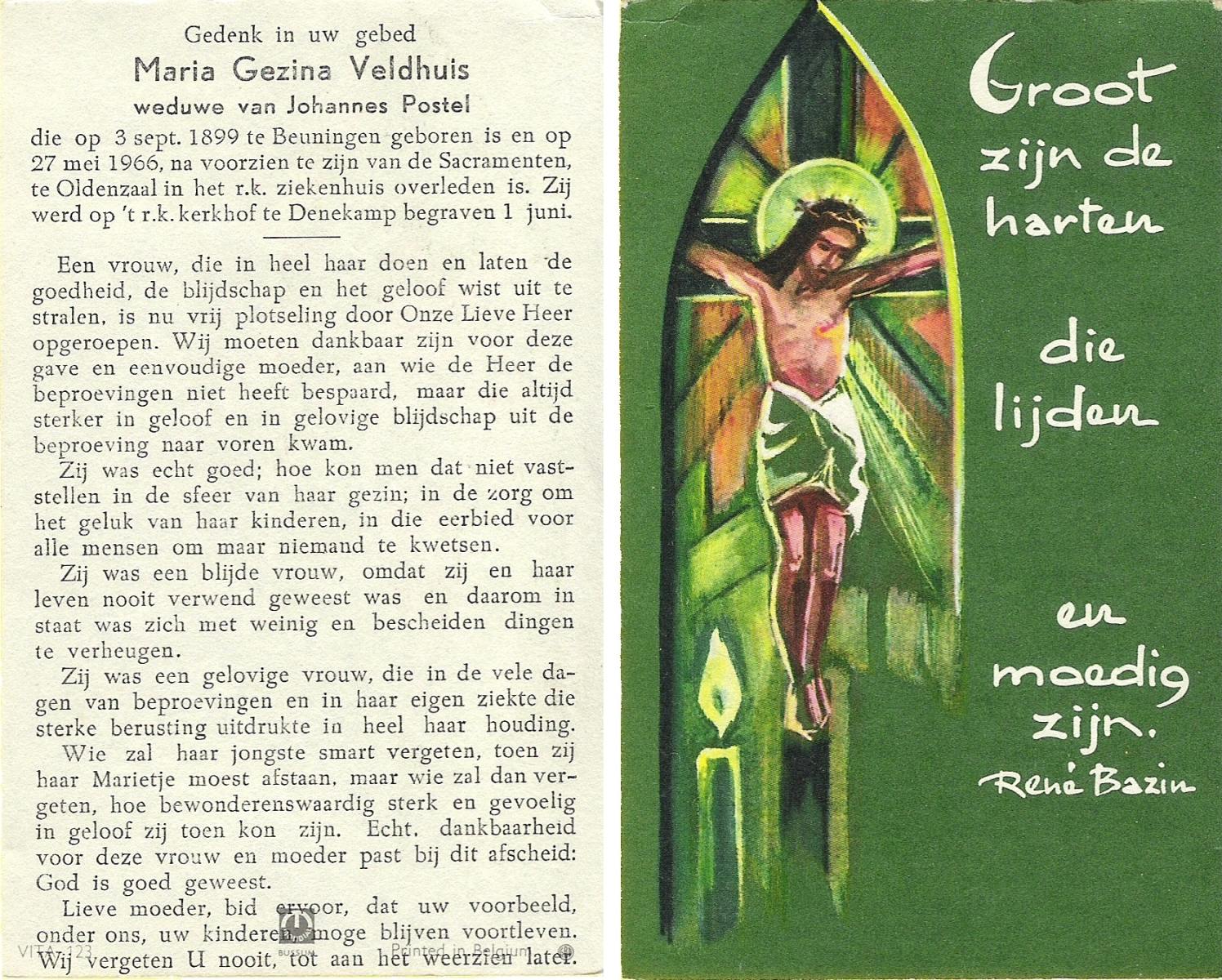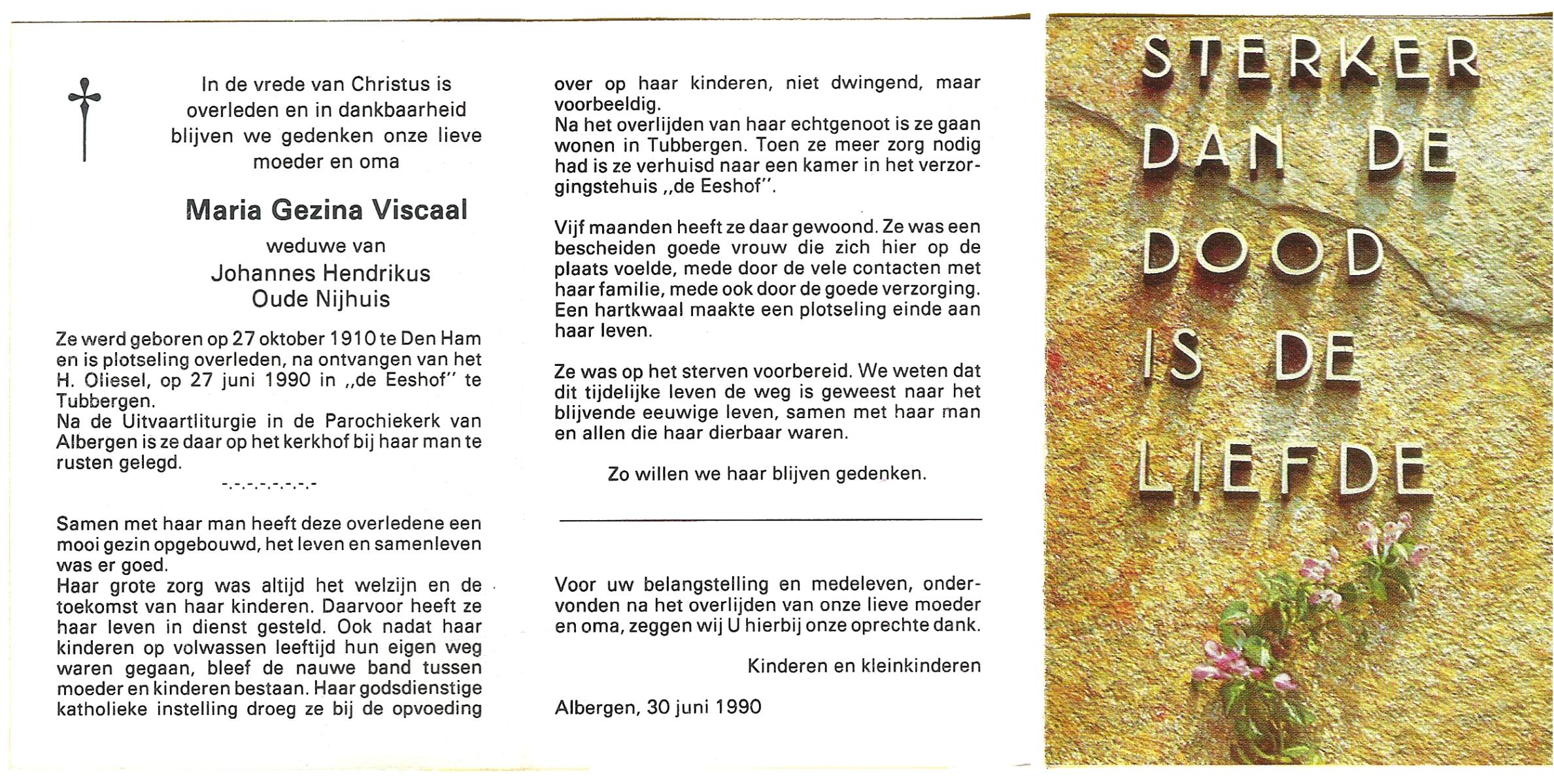 VISCAAL, Maria Gezina, geboren op 27-10-1910 te Den Ham, overleden op 27-6-1990 te Tubbergen op 79-jarige leeftijd, begraven te Albergen.
