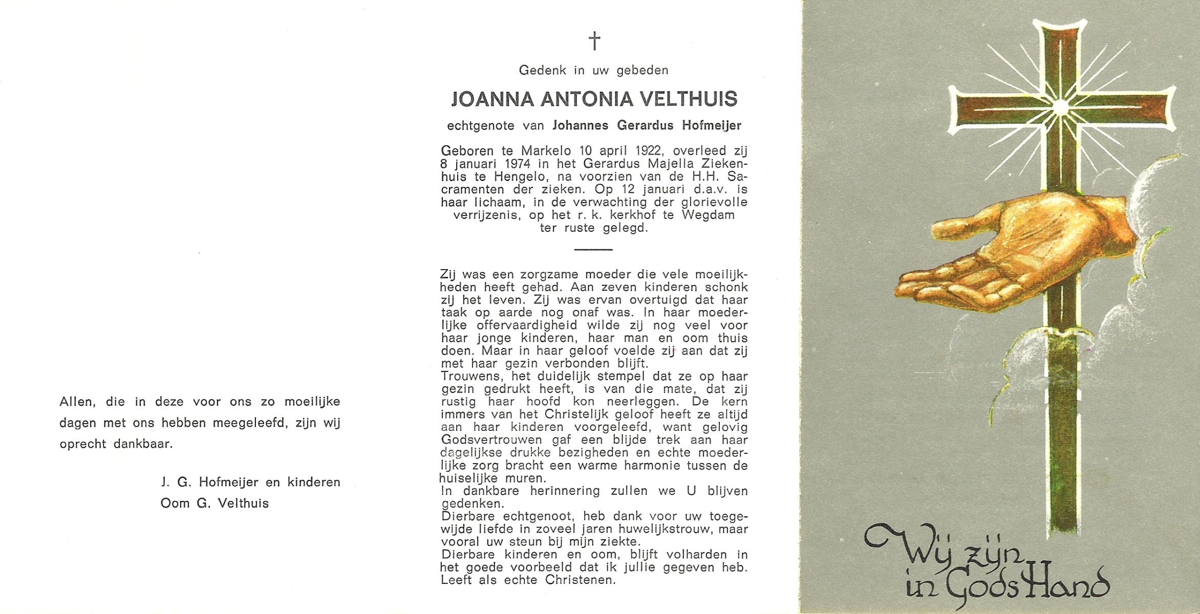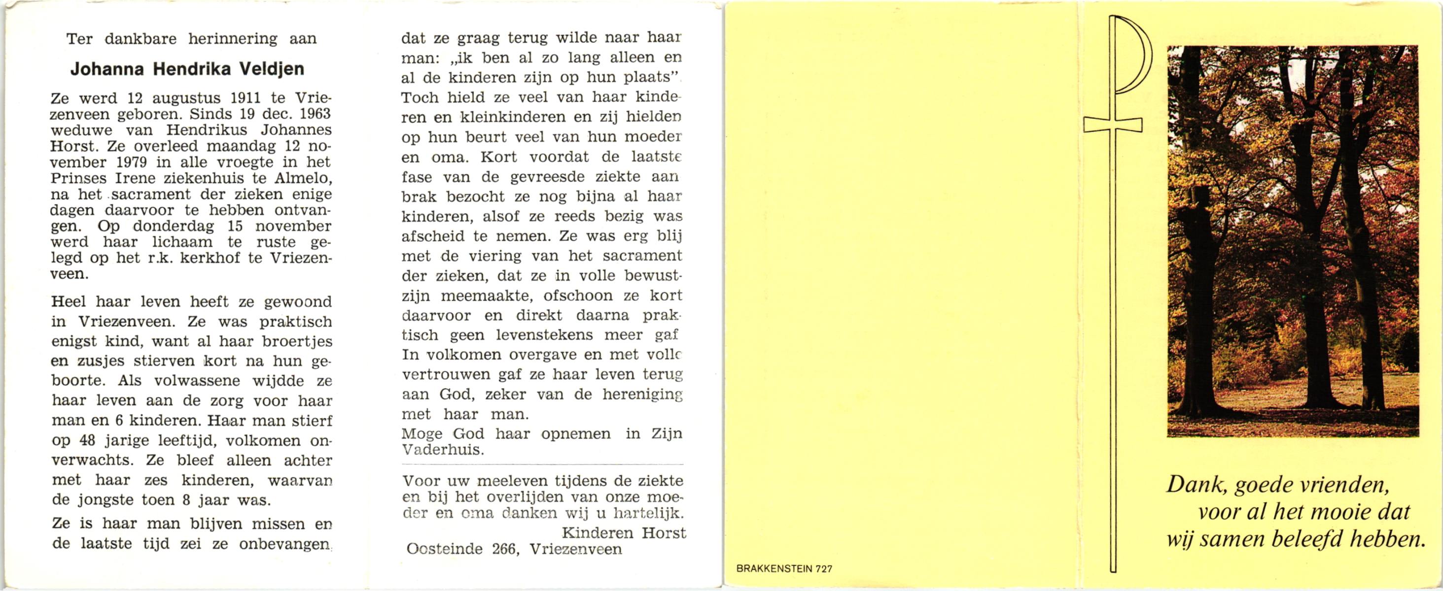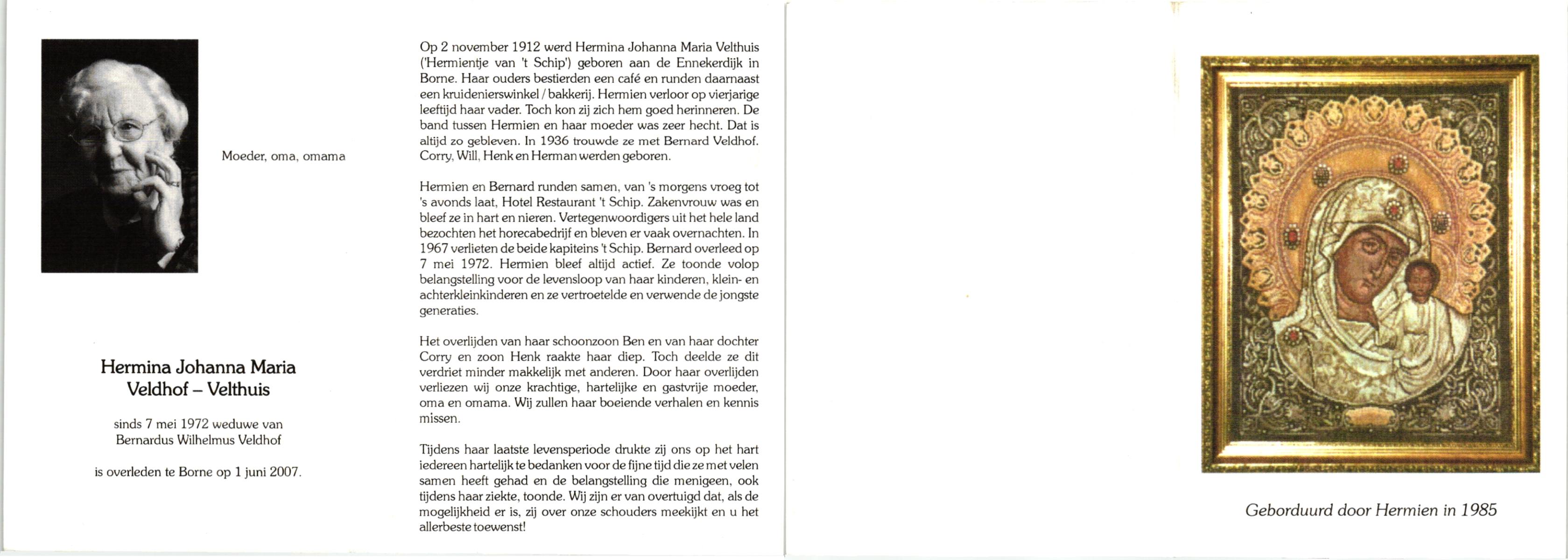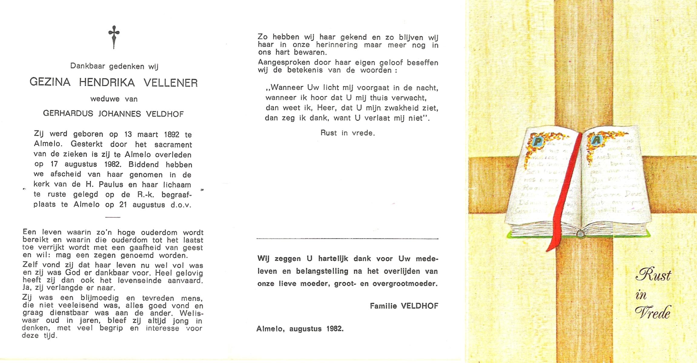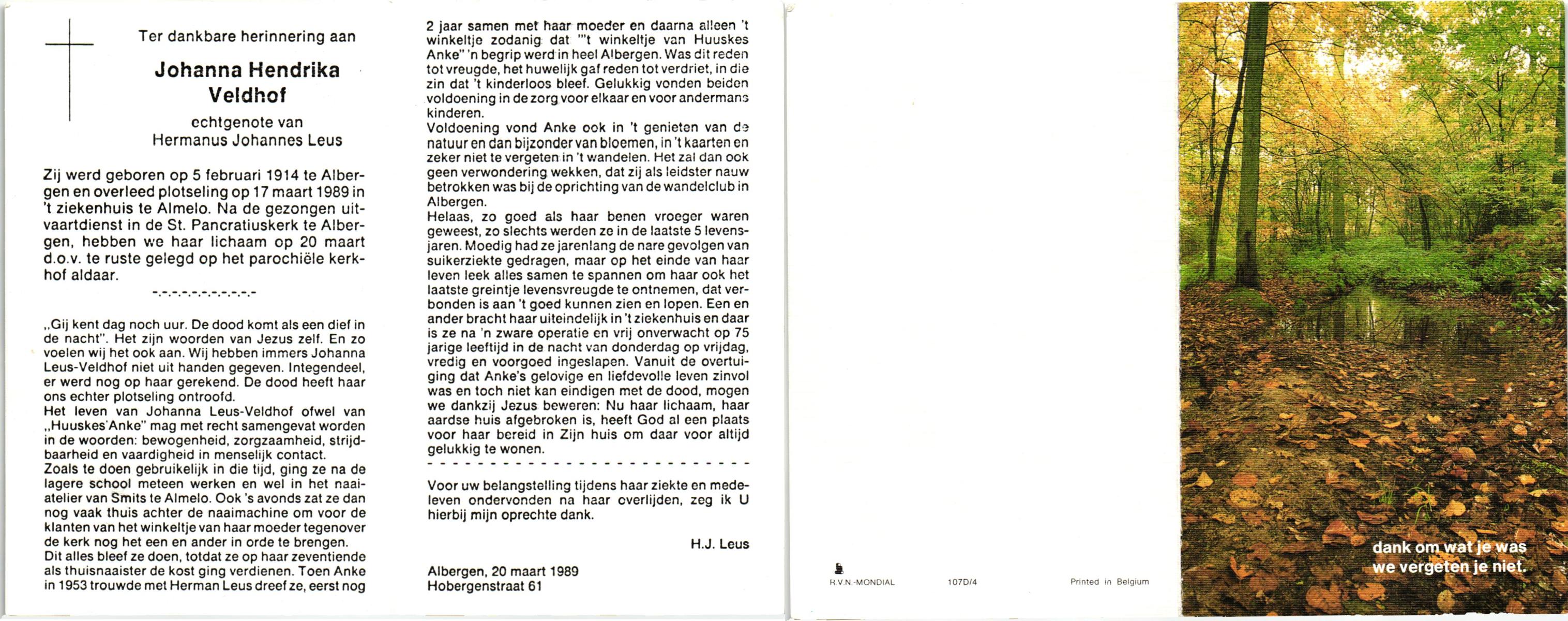 VELDHOF, Johanna Hendrika, geboren op 5-2-1914 te Albergen, overleden op 17-3-1989 te Almelo, ziekenhuis op 75-jarige leeftijd, begraven op 20-3-1989 te Almelo.