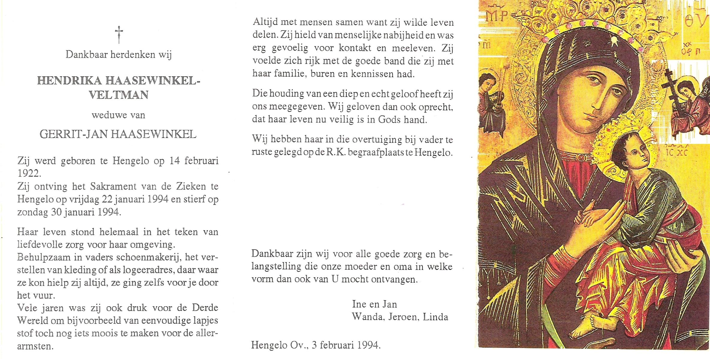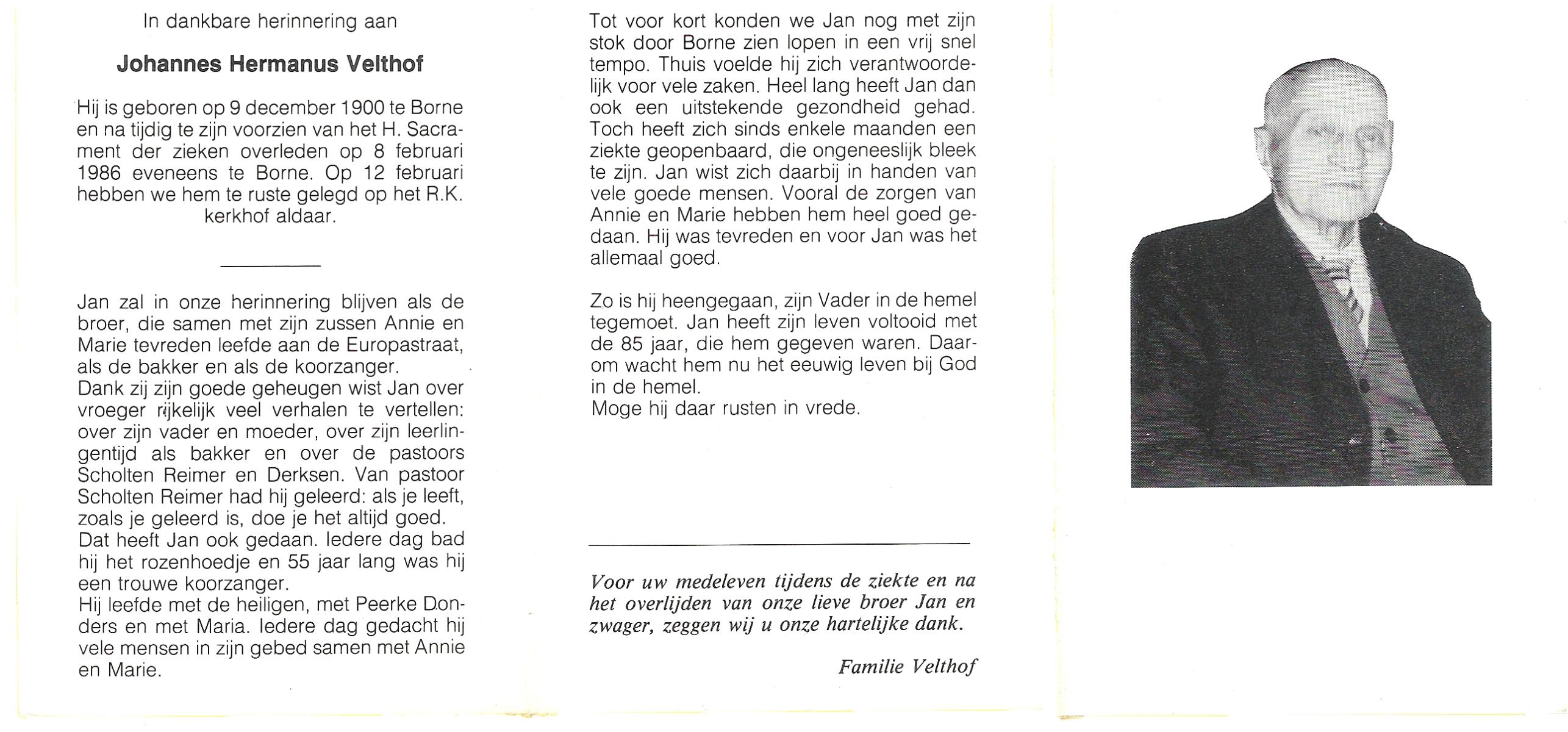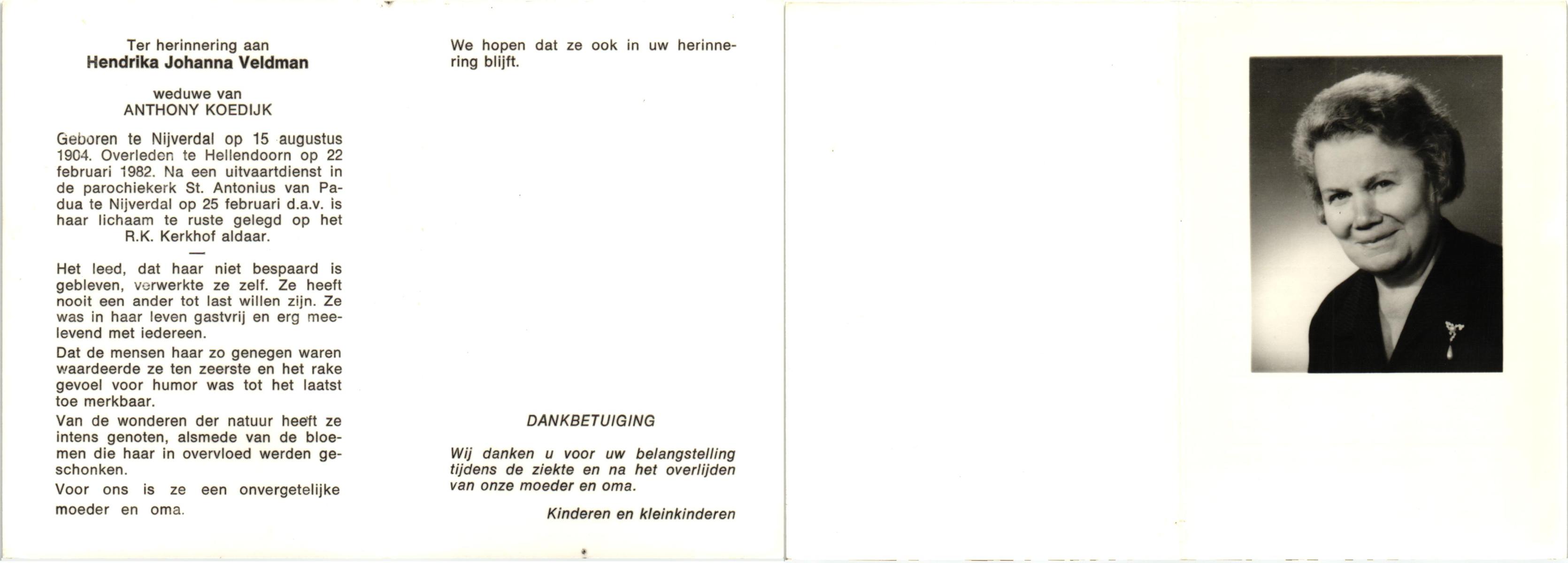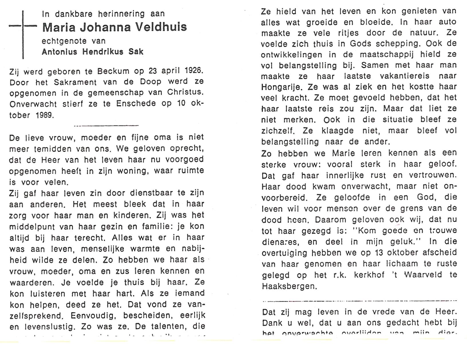 VELDHOF, Johanna Hendrika, geboren op 5-2-1914 te Albergen, overleden op 17-3-1989 te Almelo, ziekenhuis op 75-jarige leeftijd, begraven op 20-3-1989 te Almelo.