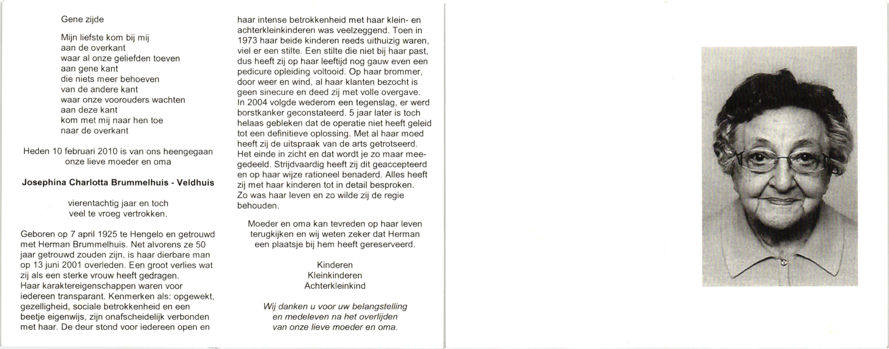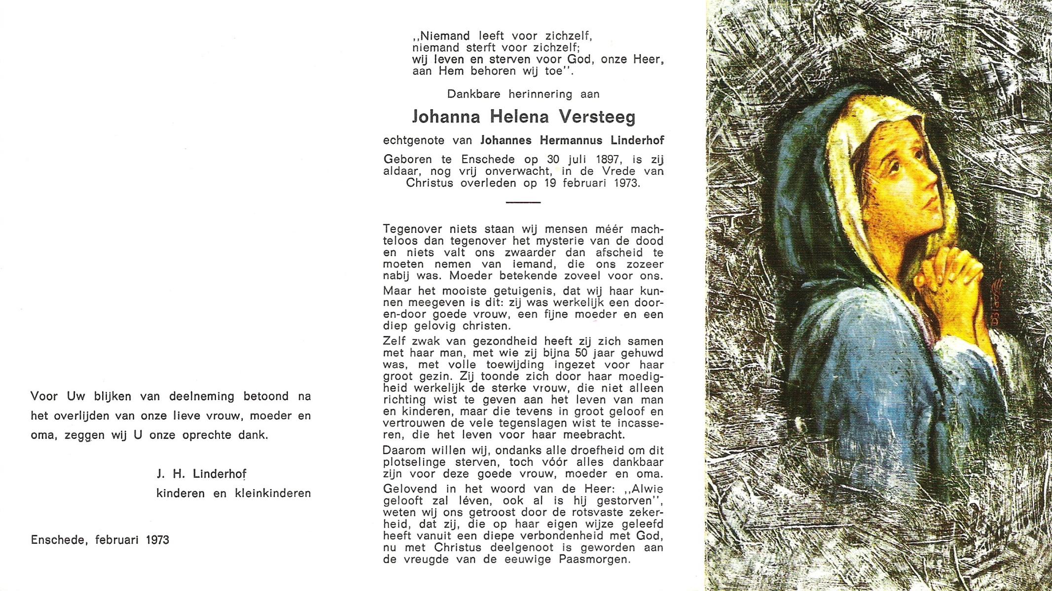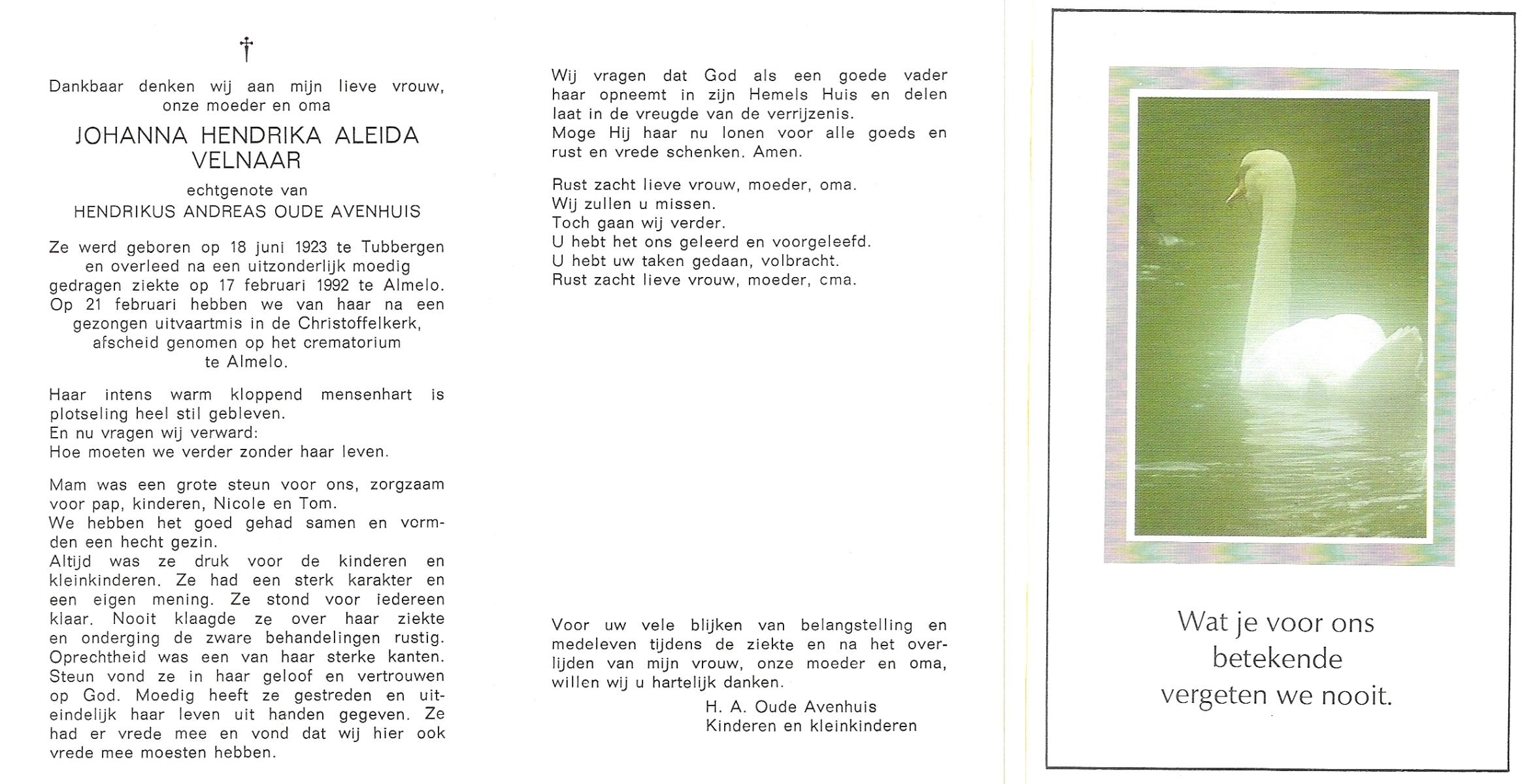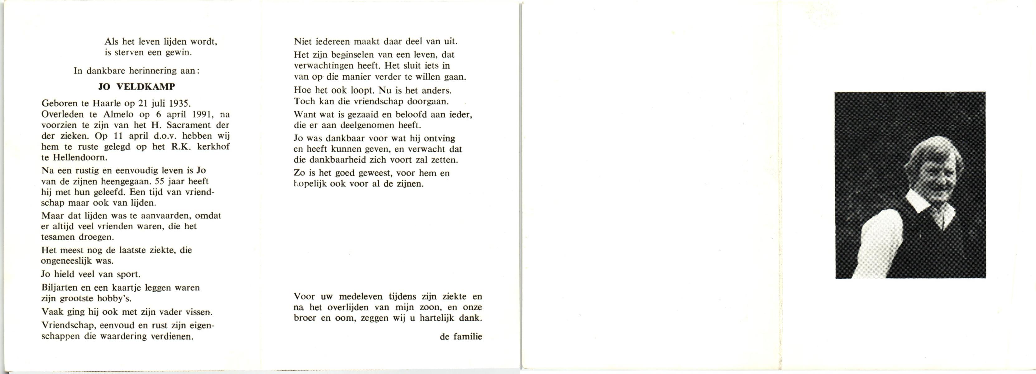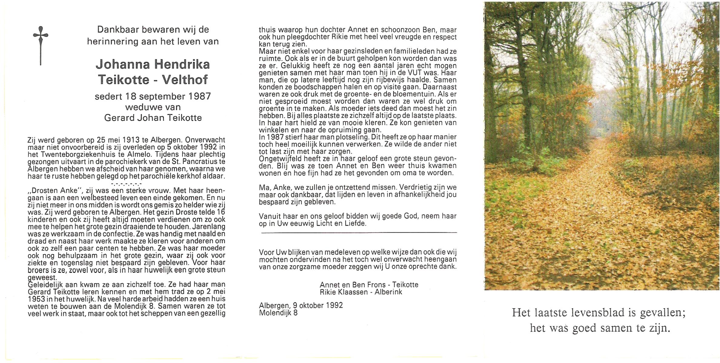 VELDHOF, Johanna Hendrika, geboren op 5-2-1914 te Albergen, overleden op 17-3-1989 te Almelo, ziekenhuis op 75-jarige leeftijd, begraven op 20-3-1989 te Almelo.