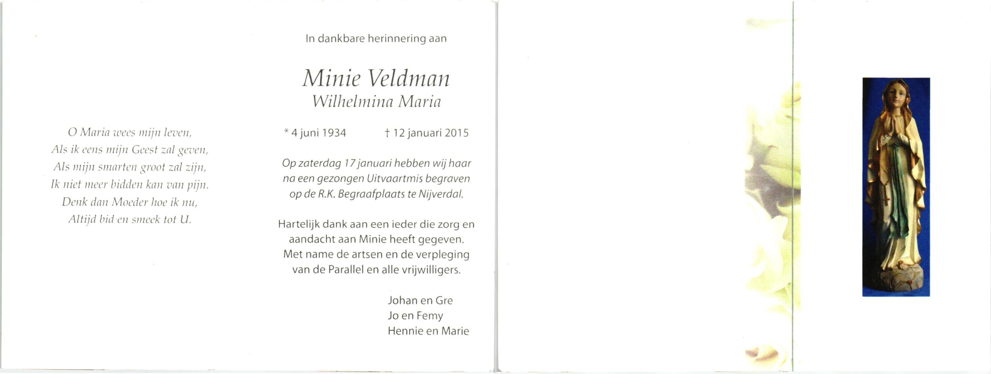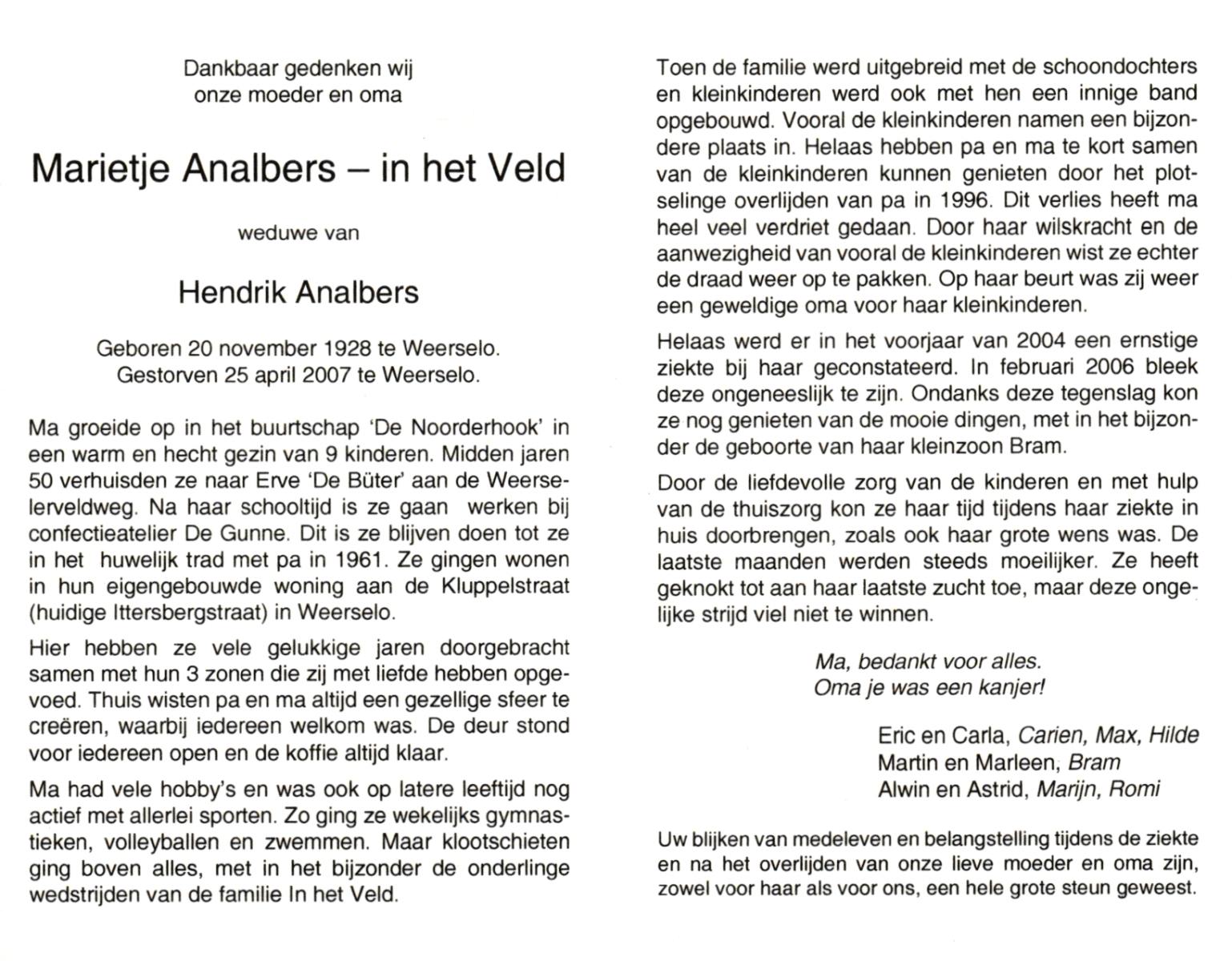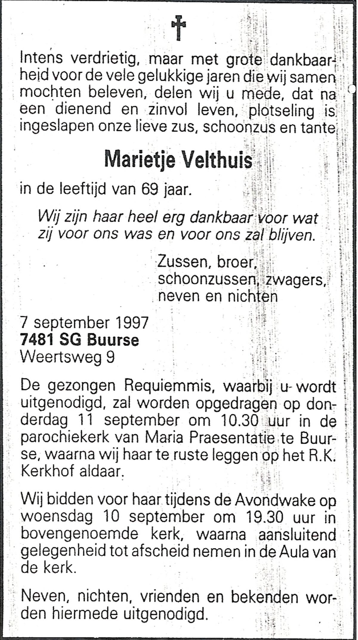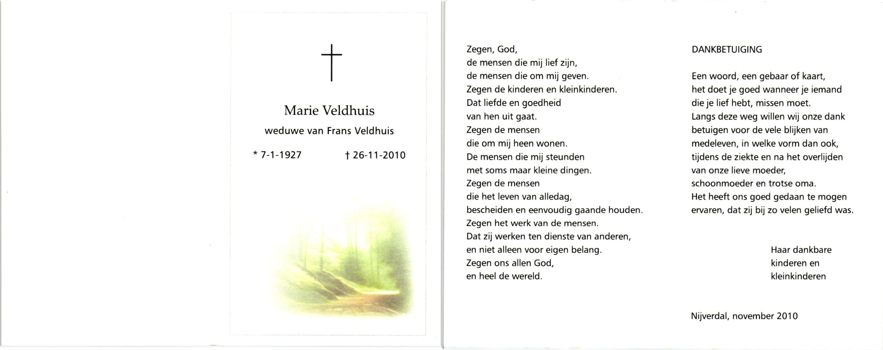 VELD, in het, Marietje, geboren op 20-11-1928 te Weerselo, overleden op 25-4-2007 te Weerselo op 78-jarige leeftijd.