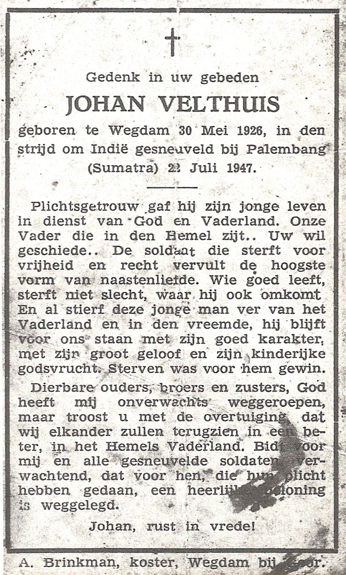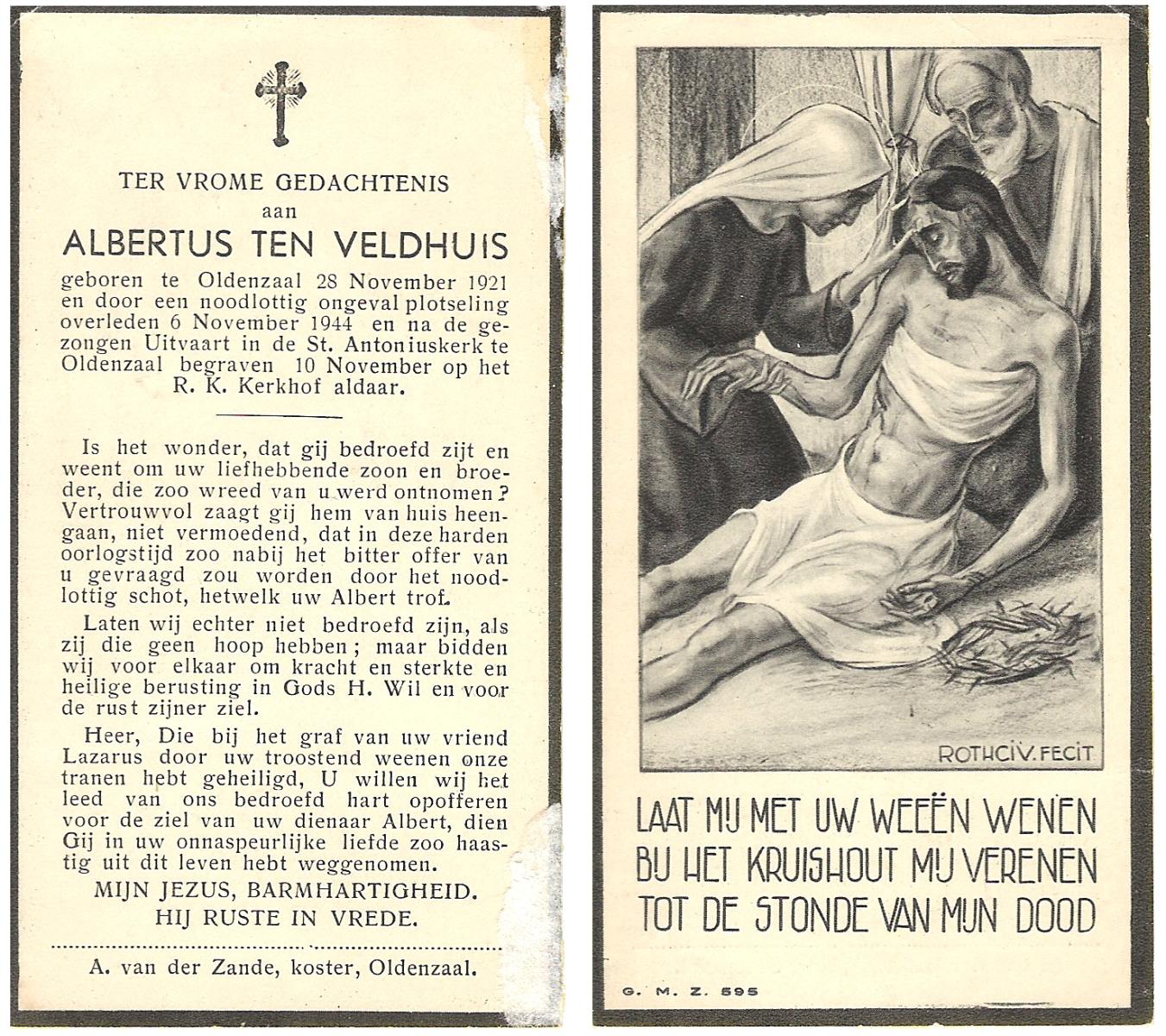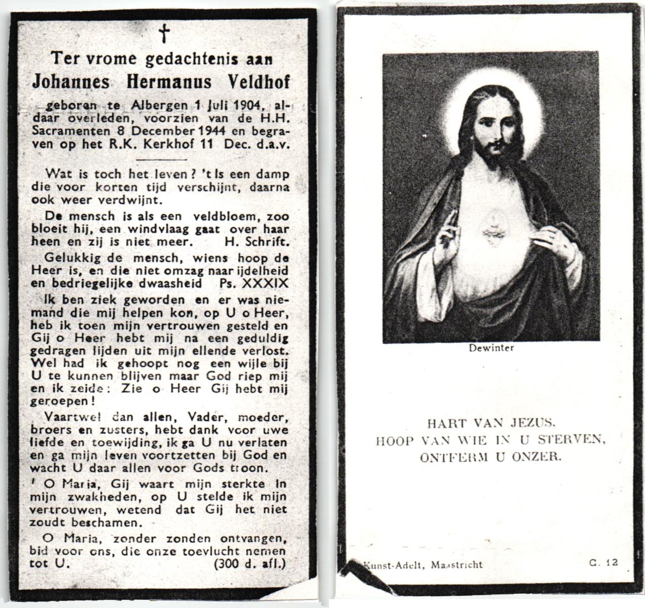 VELDHOF, Johannes Hermanus, geboren op 1-7-1904 te Albergen, overleden op 8-12-1944 te Albergen op 40-jarige leeftijd, begraven op 11-12-1944 te Albergen.