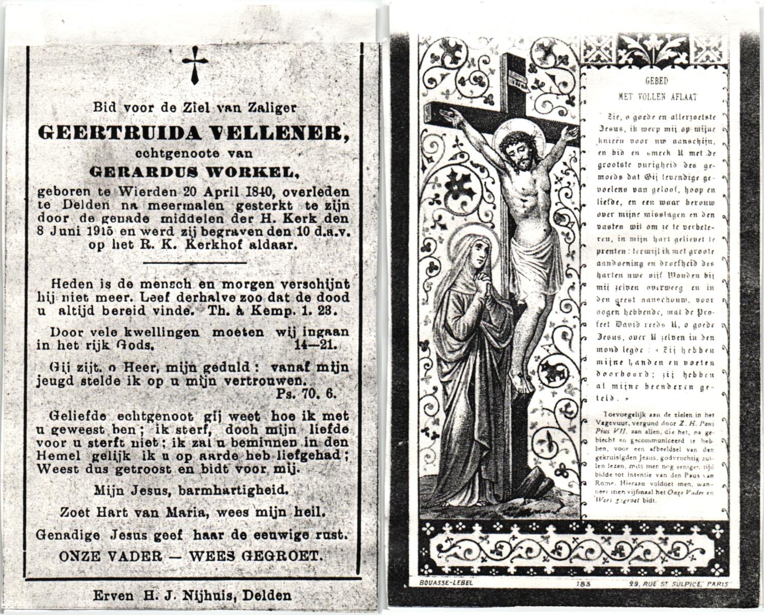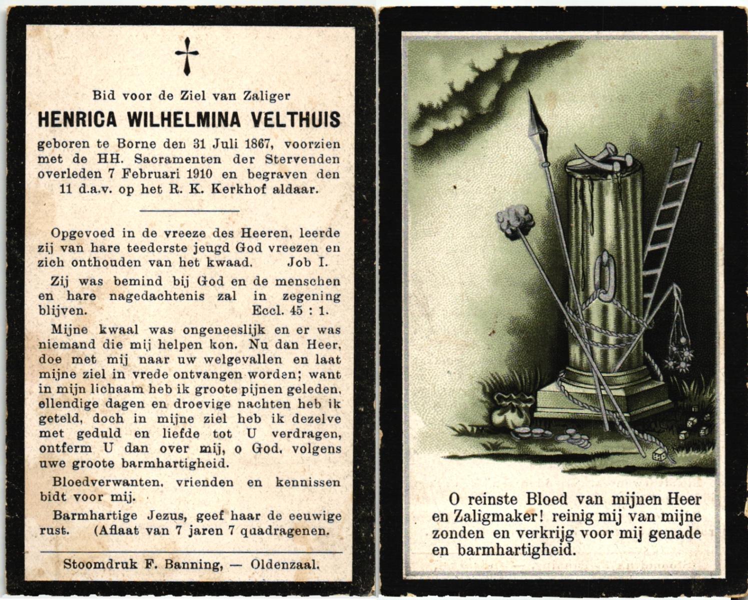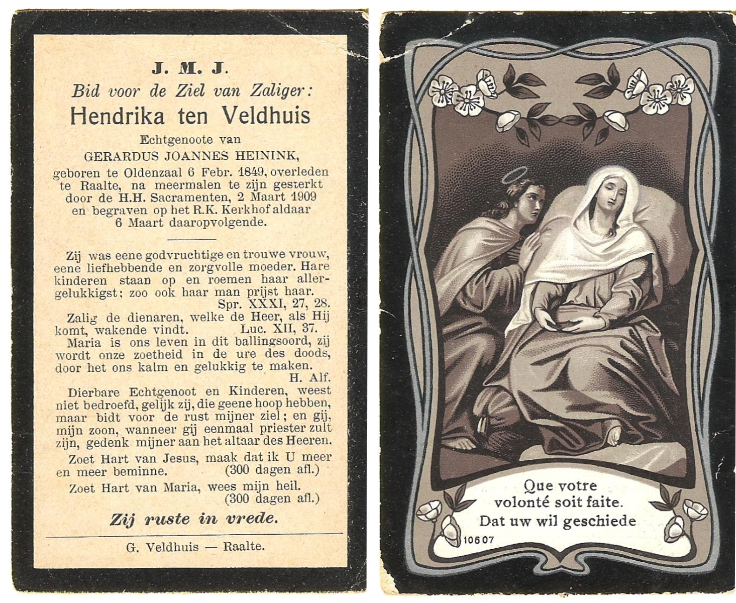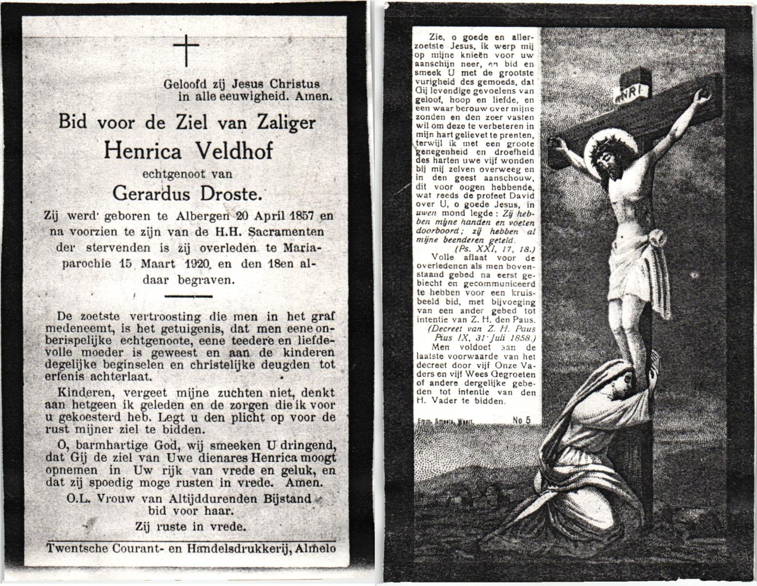 VELDHOF, Henrica, geboren op 20-04-1857 te Albergen, overleden op 15-3-1920 te Mariaparochie op 62-jarige leeftijd, begraven op 18-3-1920 te Mariaparochie.