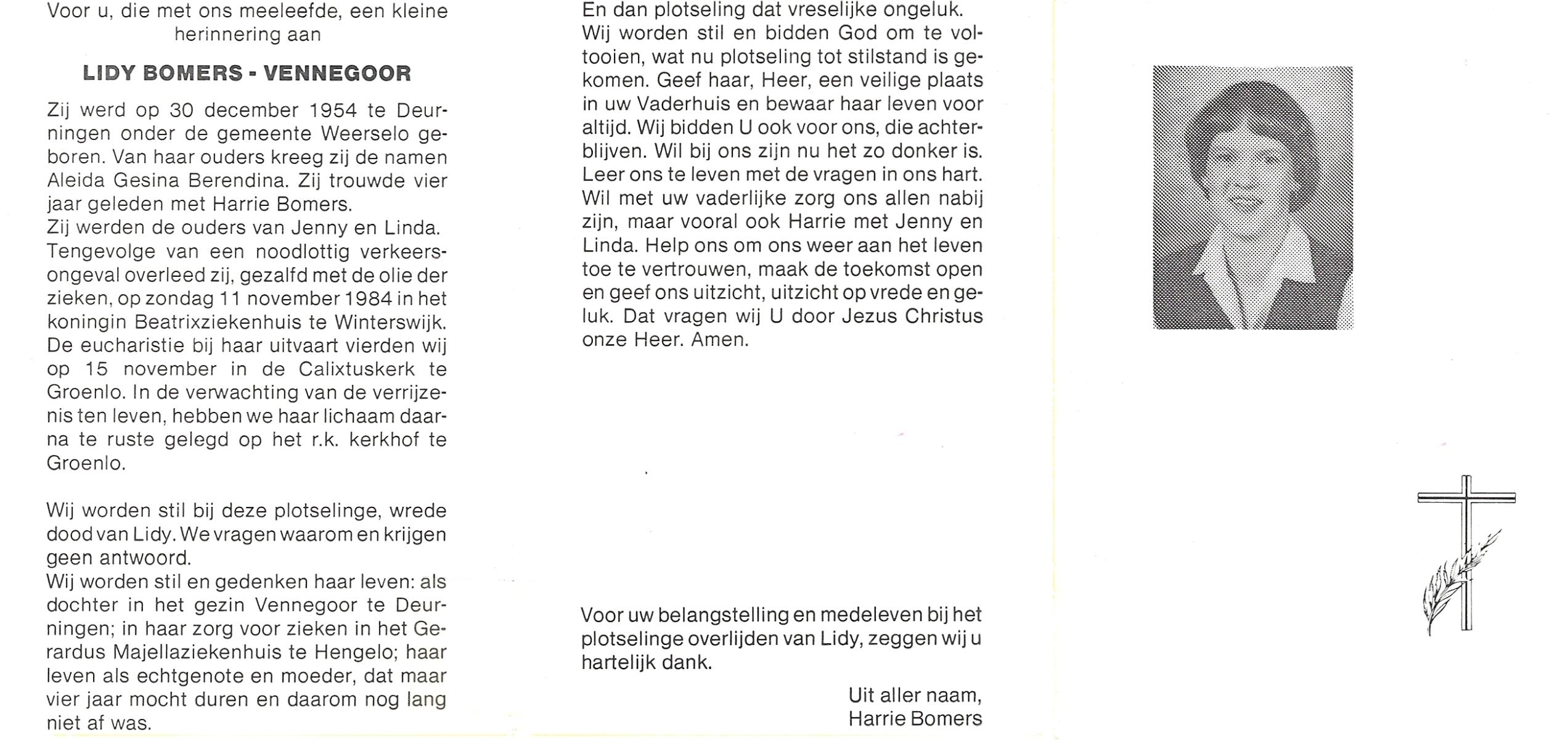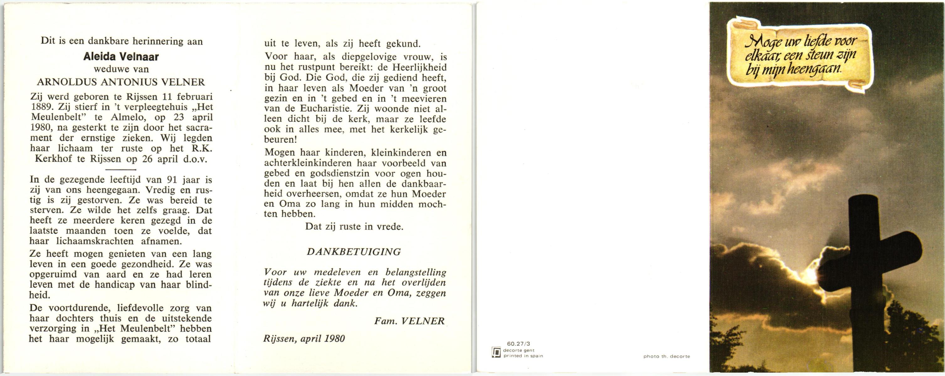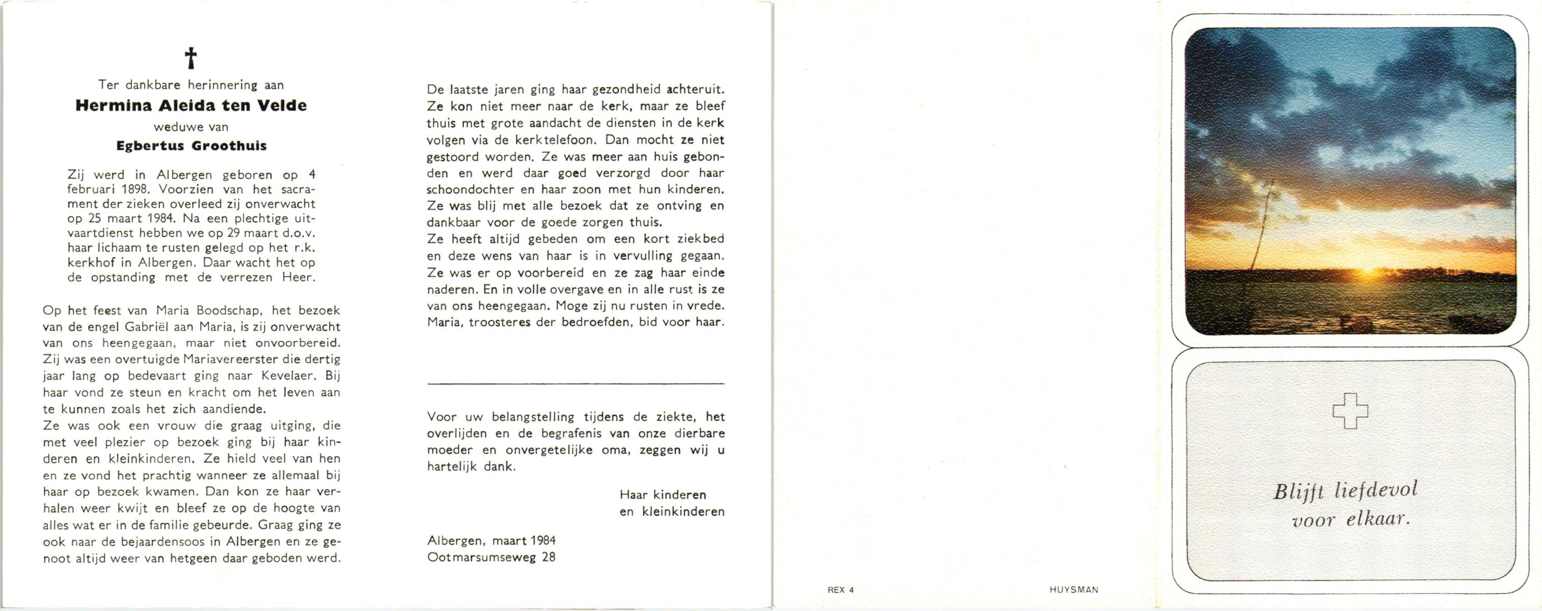 VELDE, ten, Hermina Aleida, geboren op 04-02-1898 te Albergen, overleden op 25-3-1984 te Albergen op 86-jarige leeftijd, begraven op 29-3-1984 te Albergen.