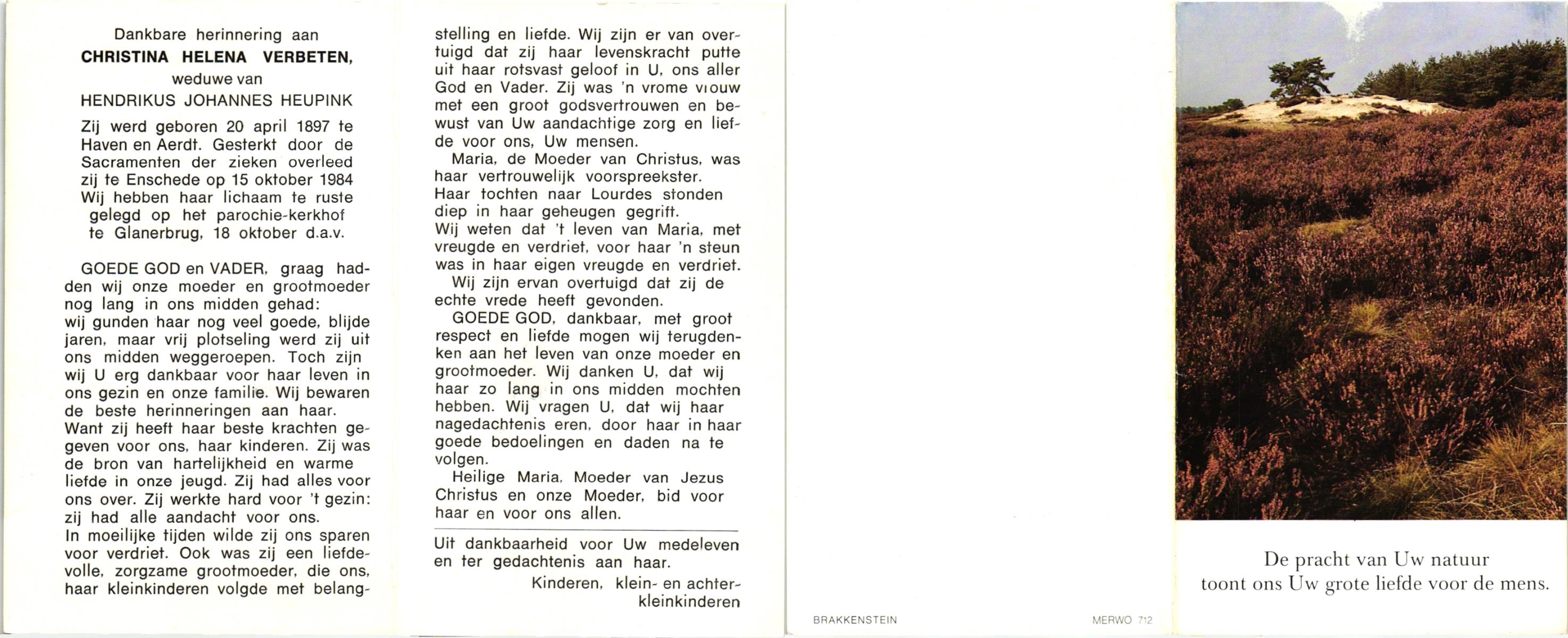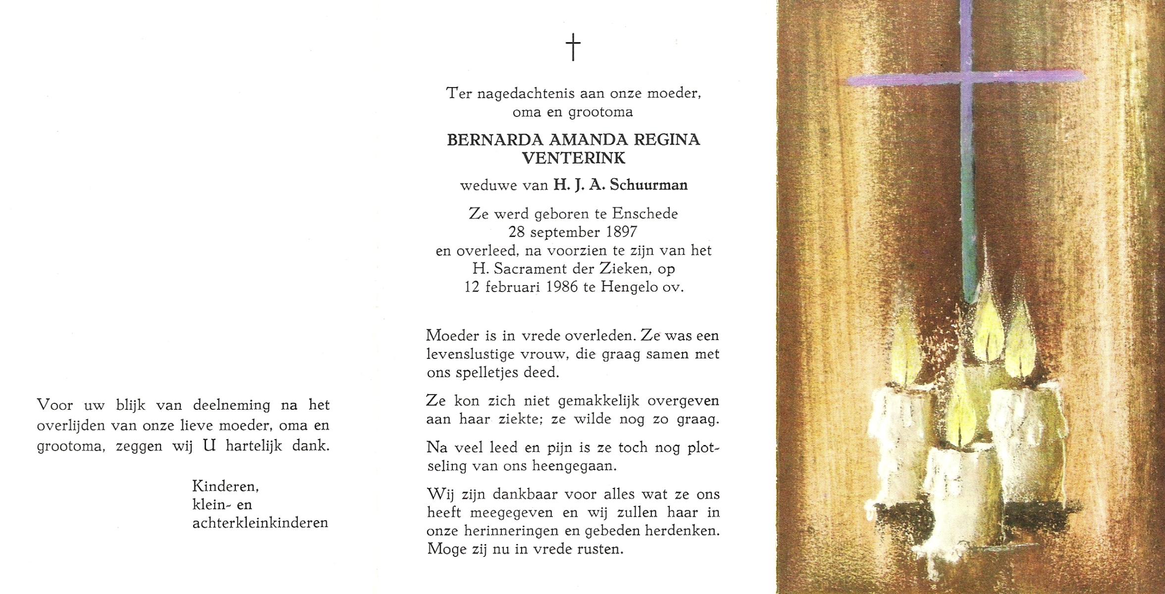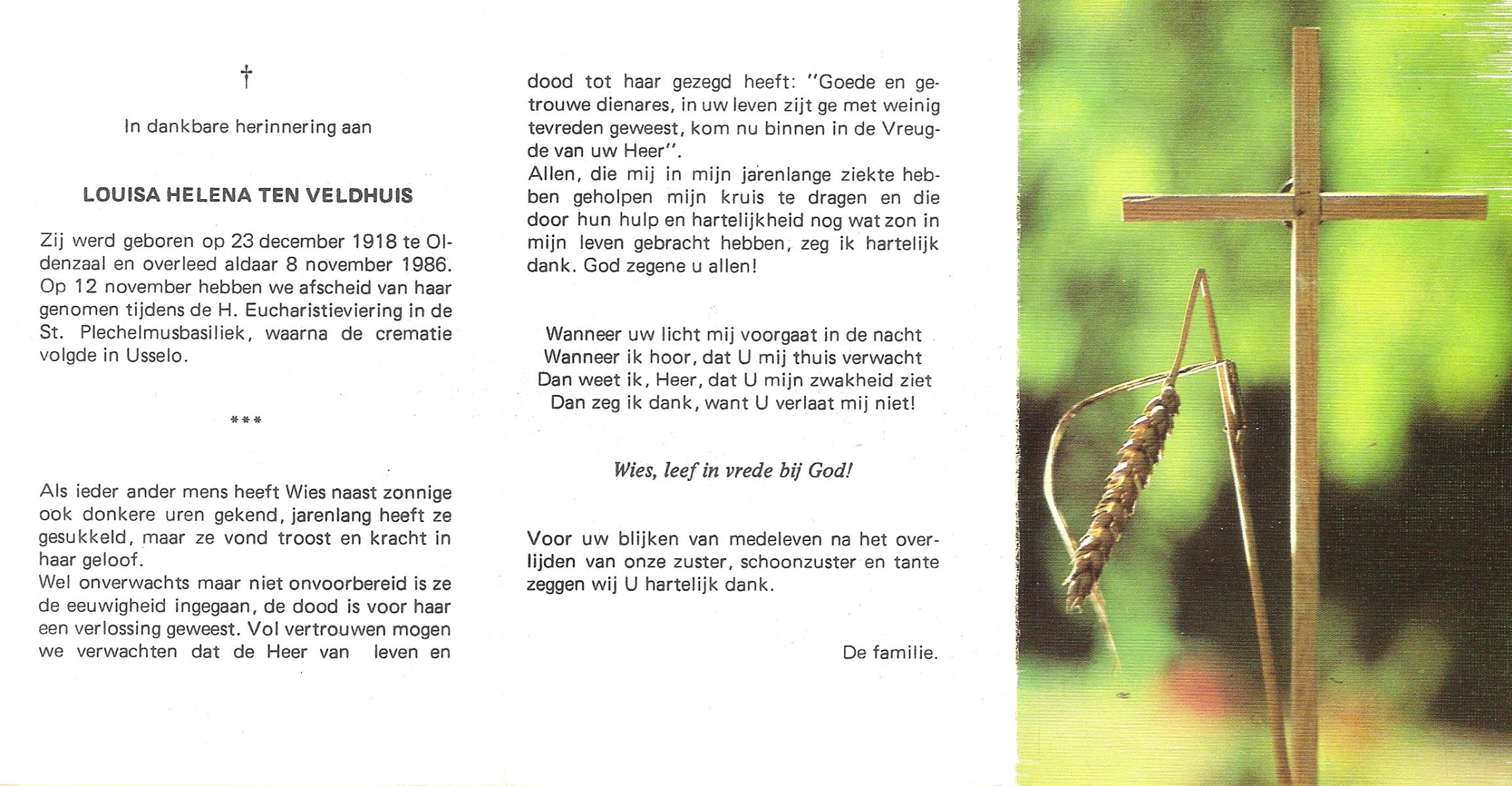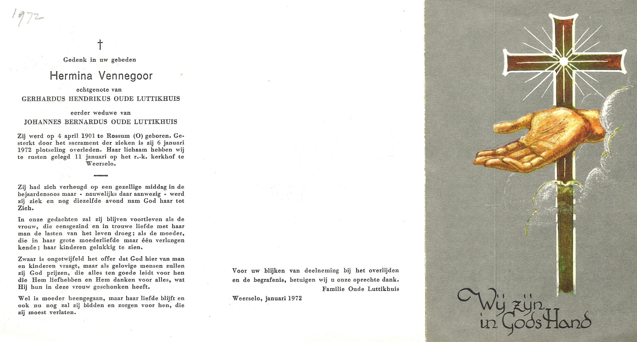 VELDE, ten, Hermina Aleida, geboren op 04-02-1898 te Albergen, overleden op 25-3-1984 te Albergen op 86-jarige leeftijd, begraven op 29-3-1984 te Albergen.