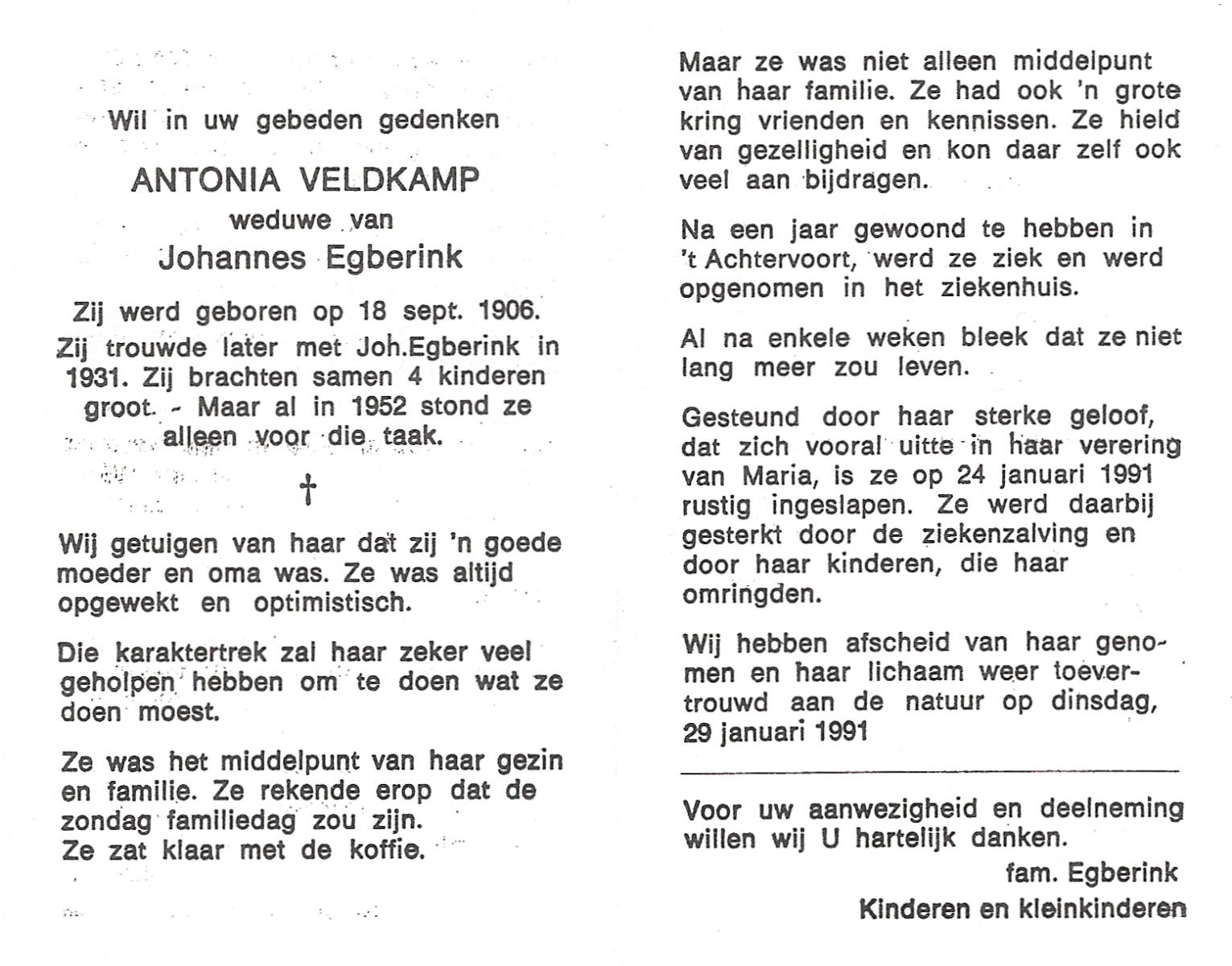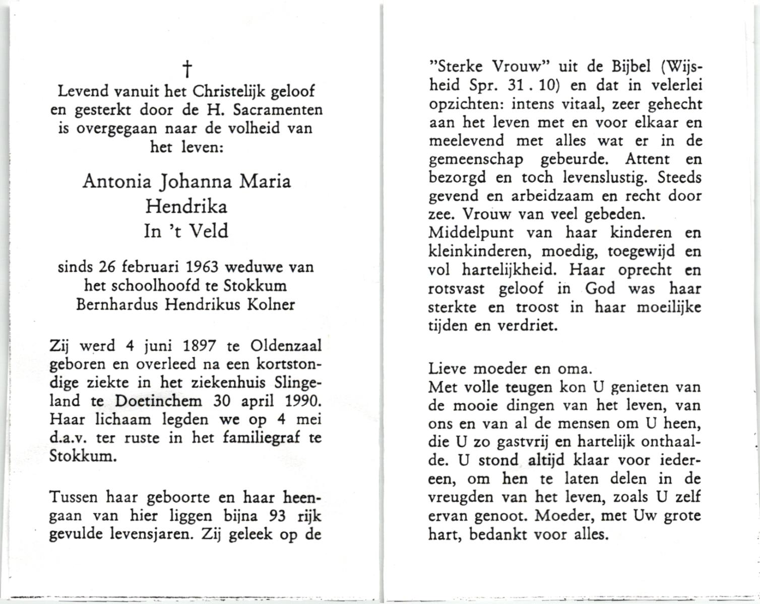 VELD, in 't, Antonia Johanna Maria Hendrika, geboren op 04-06-1897 te Oldenzaal, overleden op 30-4-1990 te Doetinchem op 92-jarige leeftijd, begraven op 4-5-1990 te Stokkum.