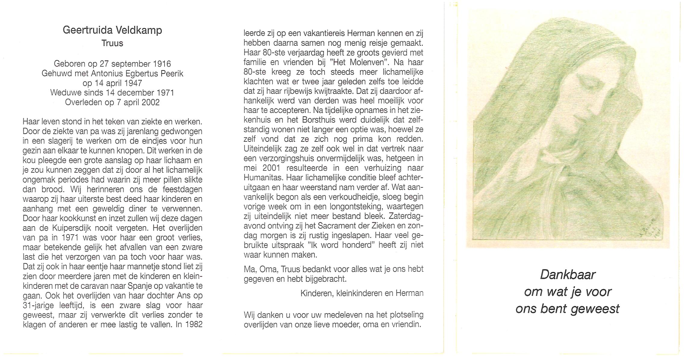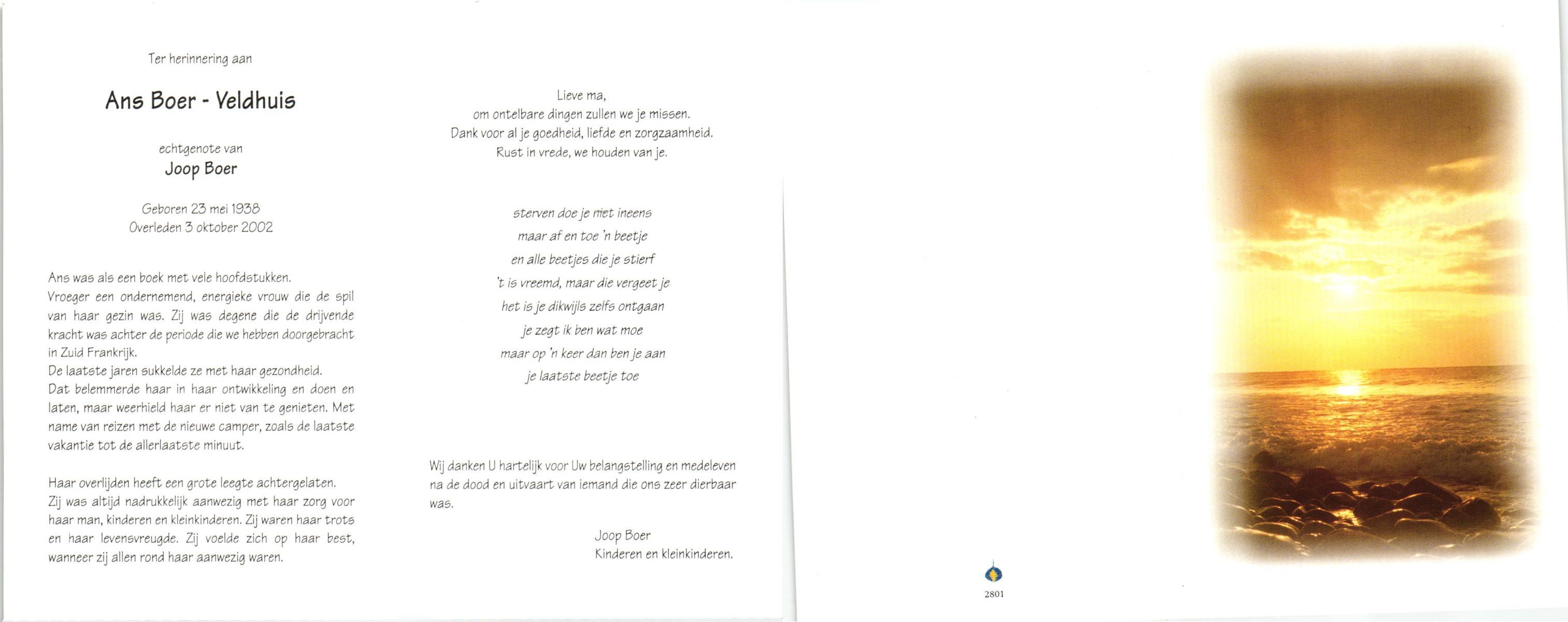 VELDHUIS, Ans, geboren op 23-5-1938, overleden op 3-10-2002 op 64-jarige leeftijd.