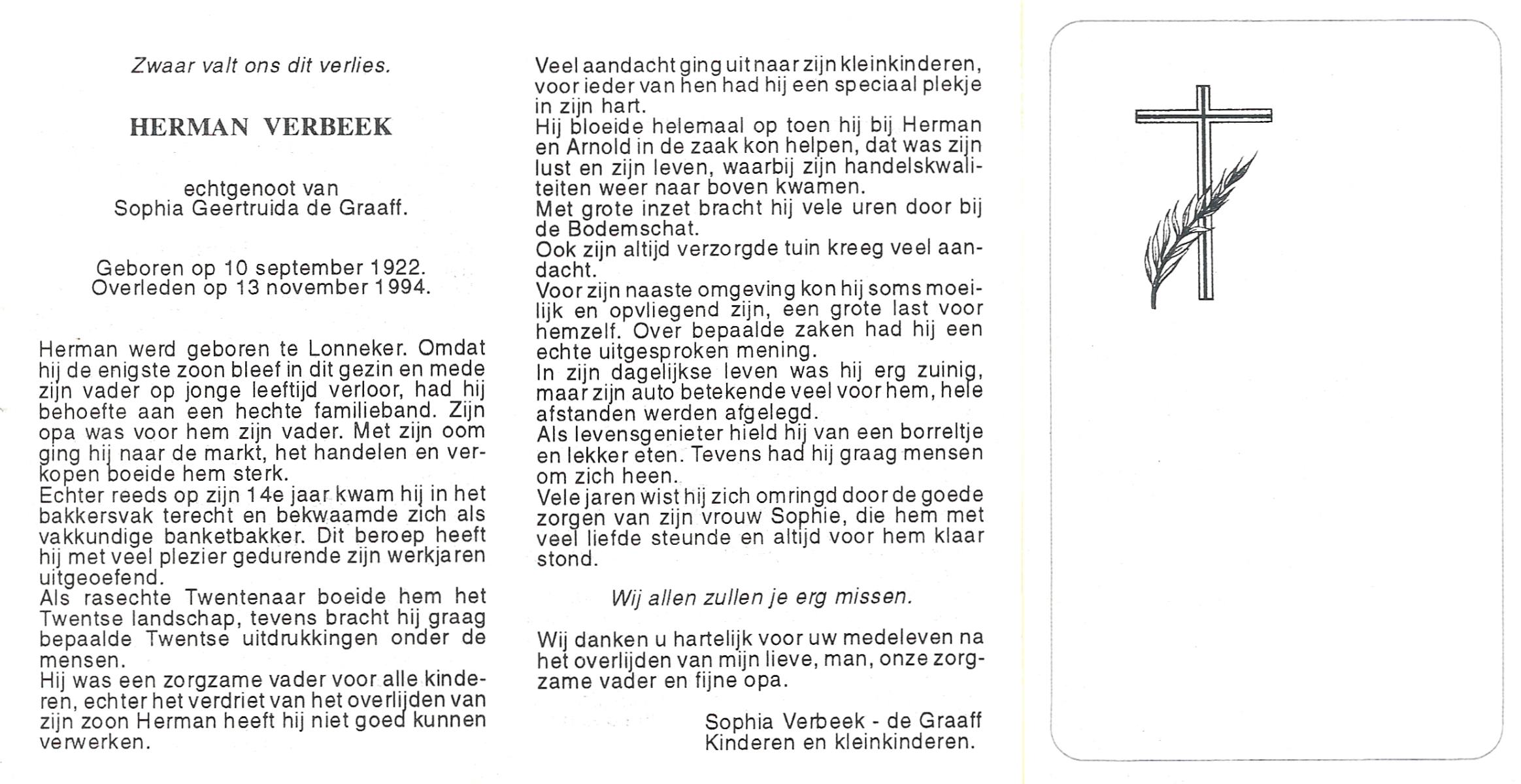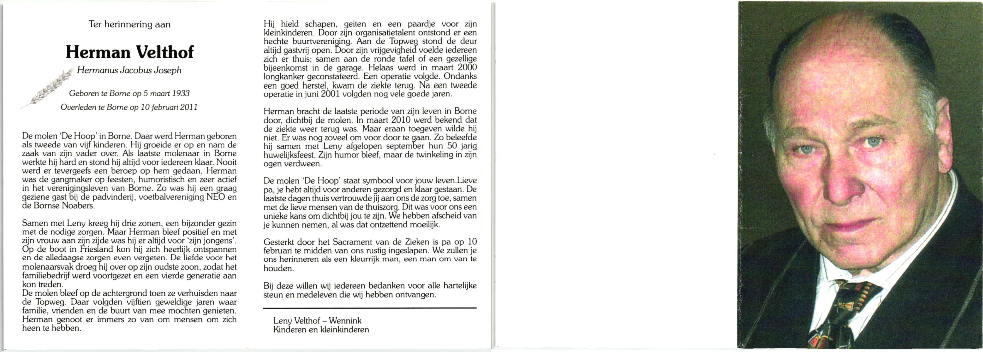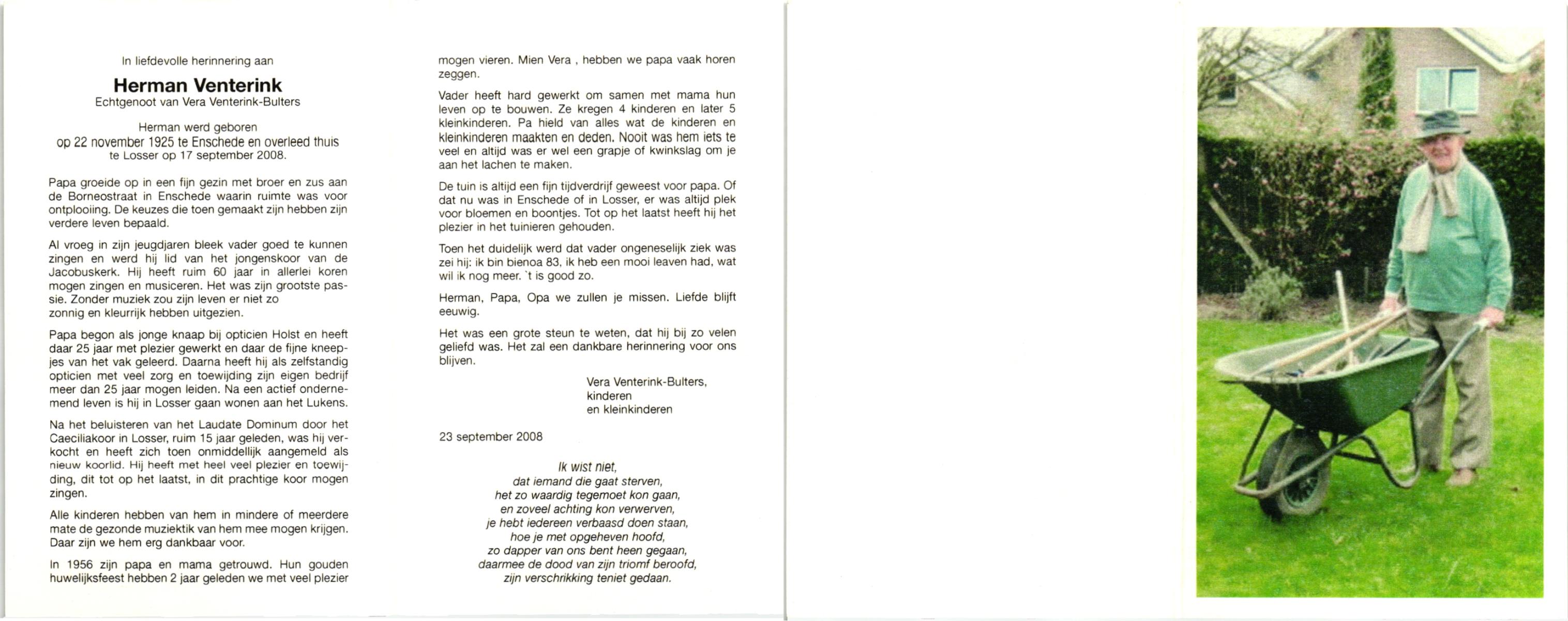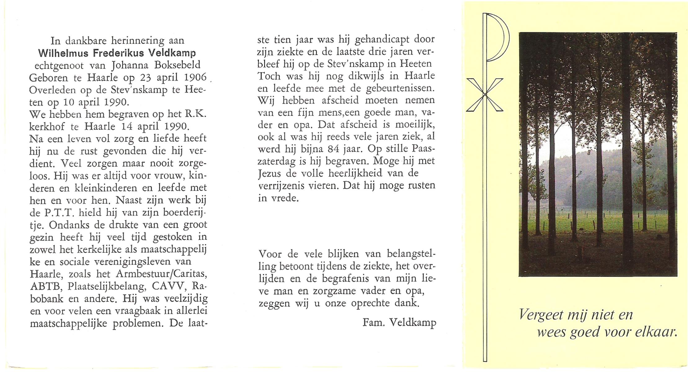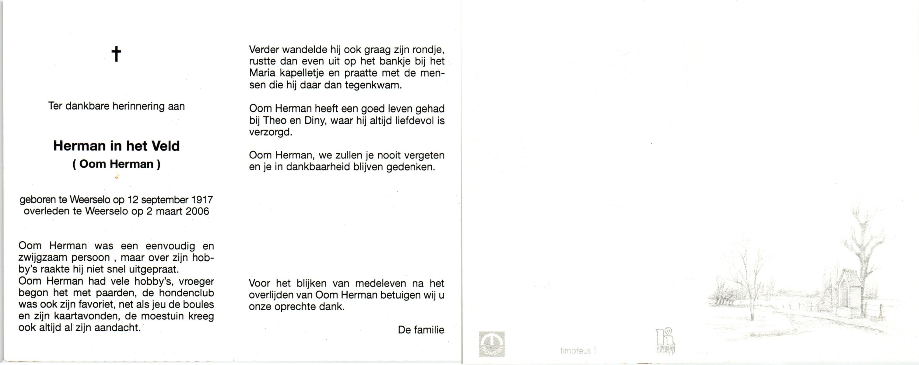 VELD, in het, Herman, geboren op 12-9-1917 te Weerselo, overleden op 2-3-2006 te Weerselo op 88-jarige leeftijd.