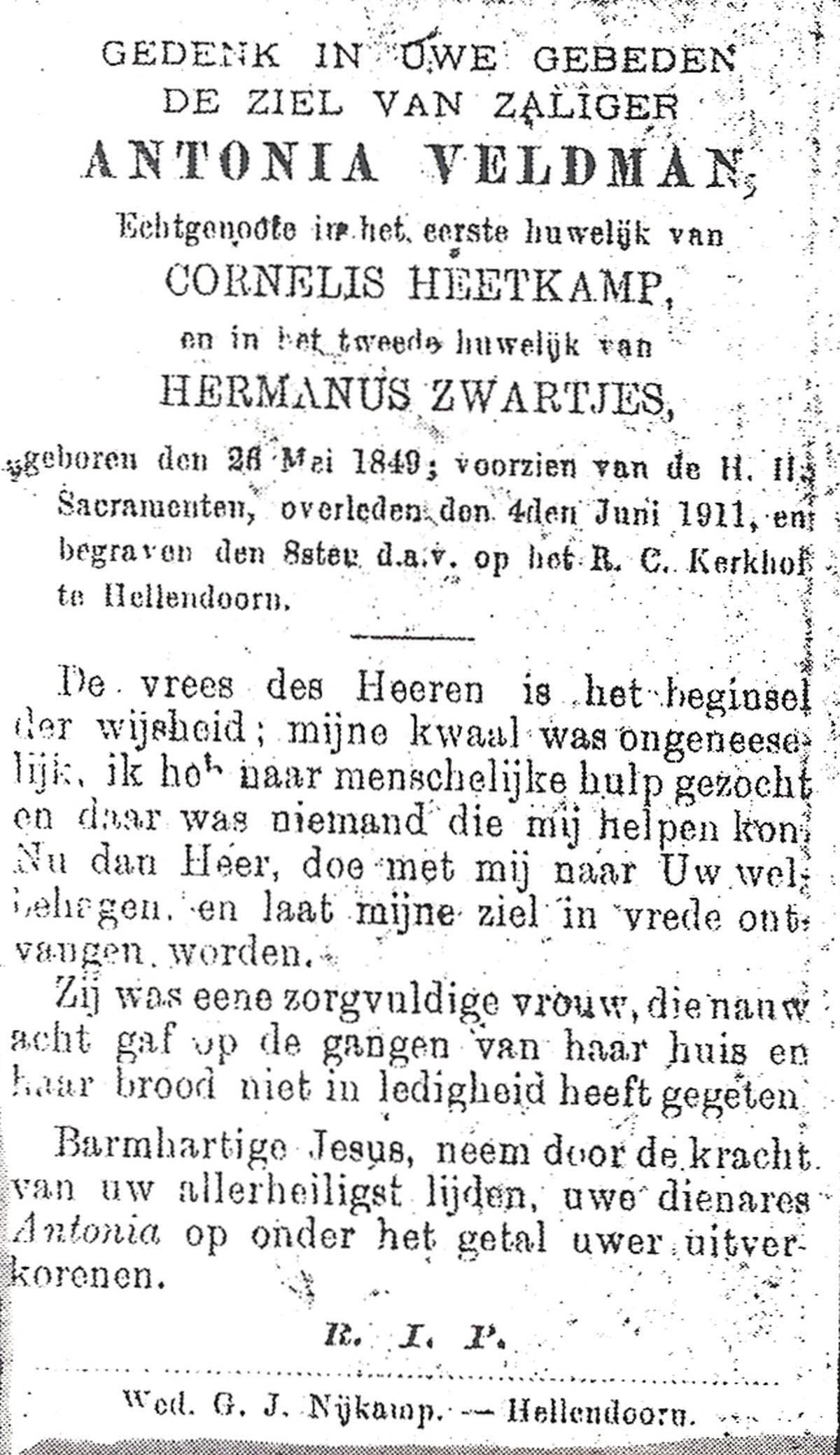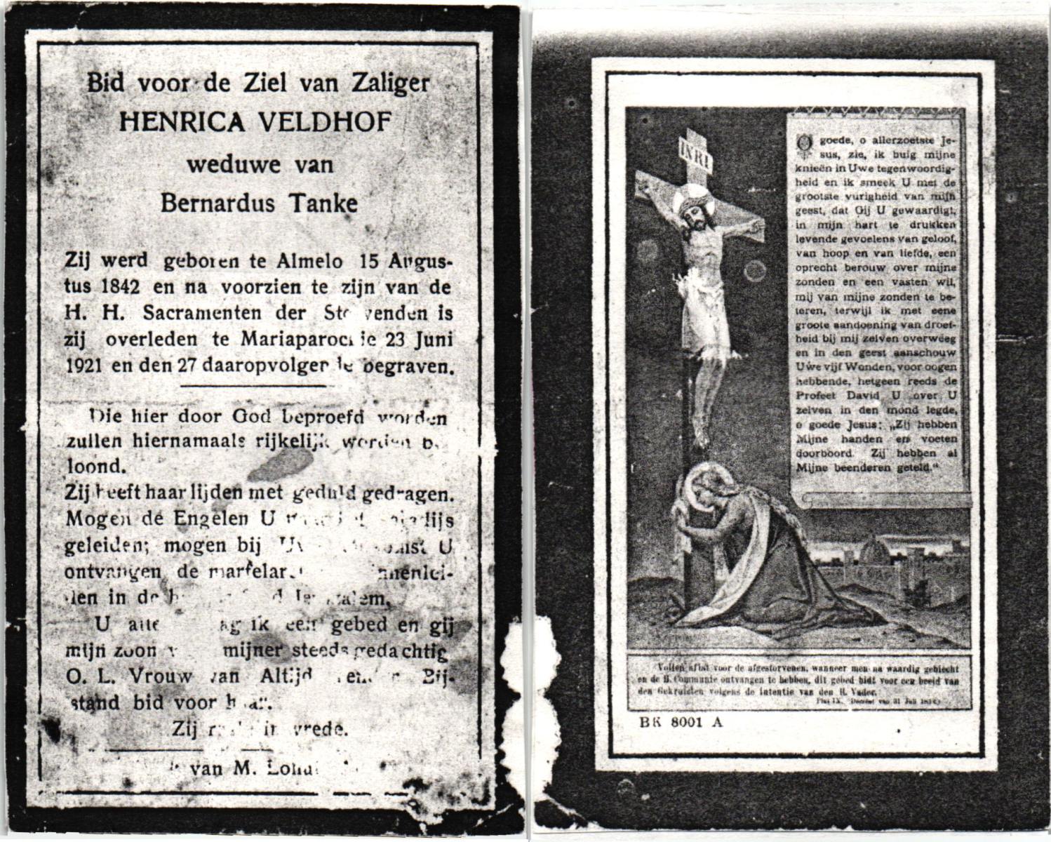 VELDHOF, Henrica, geboren op 15-08-1842 te Almelo, overleden op 23-6-1921 te Mariaparochie op 78-jarige leeftijd, begraven op 27-6-1921 te Mariaparochie.