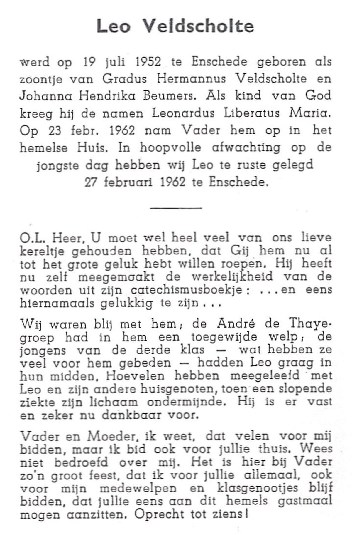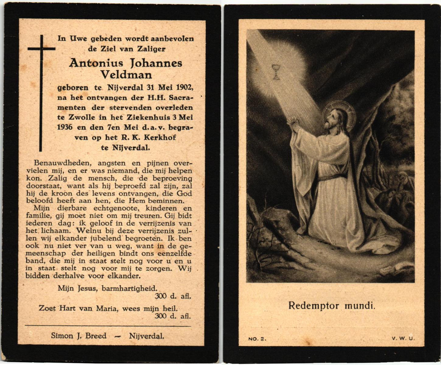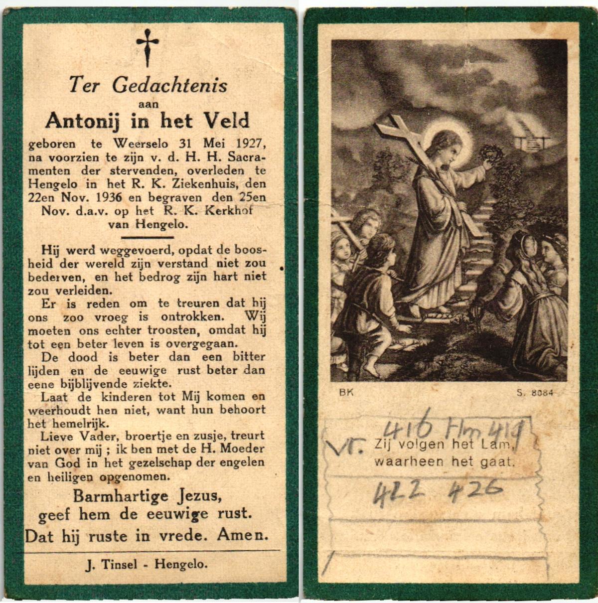 VELD, in het, Antonij, geboren op 31-5-1927 te Weerselo, overleden op 22-11-1936 te Hengelo (O) op 9-jarige leeftijd, begraven op 25-11-1936 te Hengelo, rk.