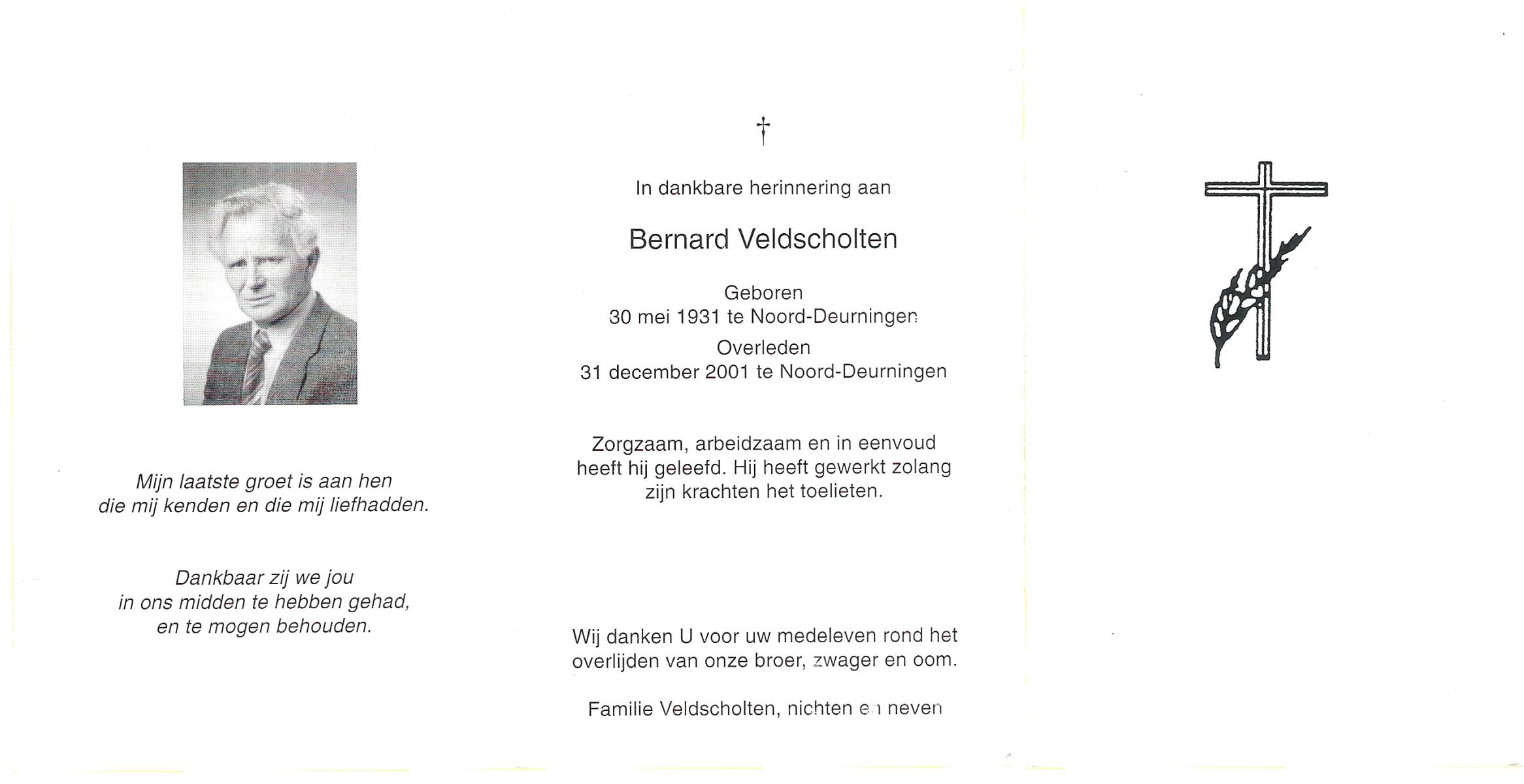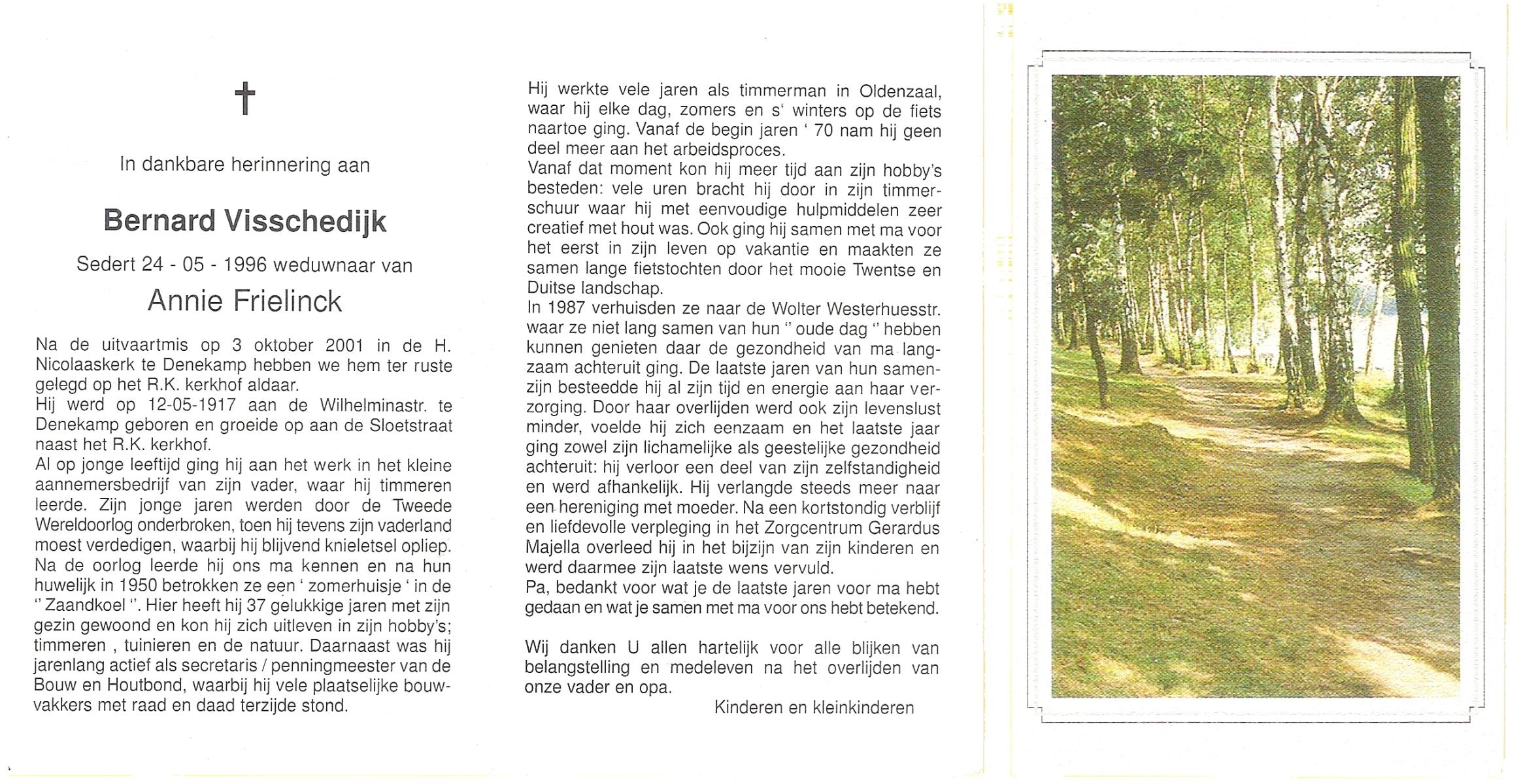 VISSCHEDIJK, Bernard, geboren op 12-5-1917 te Denekamp op 84-jarige leeftijd, begraven op 3-10-2001 te Denekamp R.K.kerkhof.