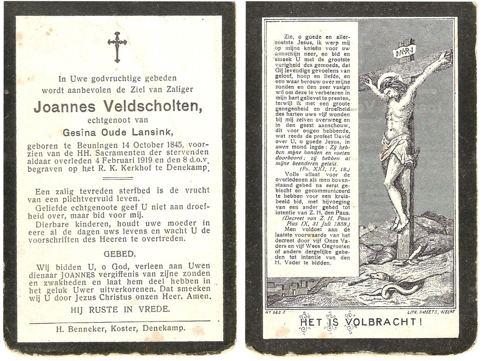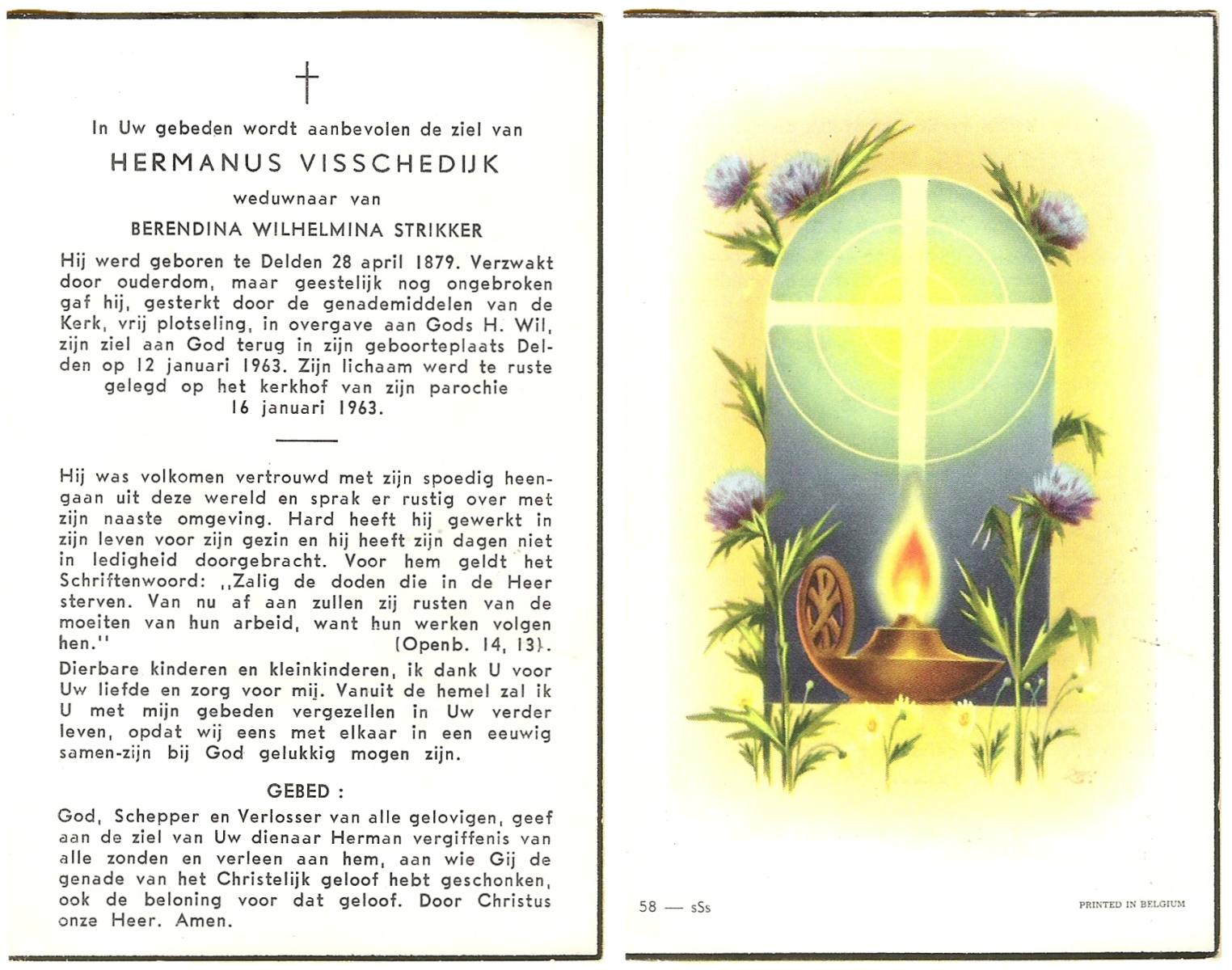VISSCHEDIJK, Hermanus, geboren op 28-04-1879 te Delden, overleden op 12-1-1963 te Delden op 84-jarige leeftijd, begraven op 16-1-1963 te Delden parochie-kerkhof H.Blasius.