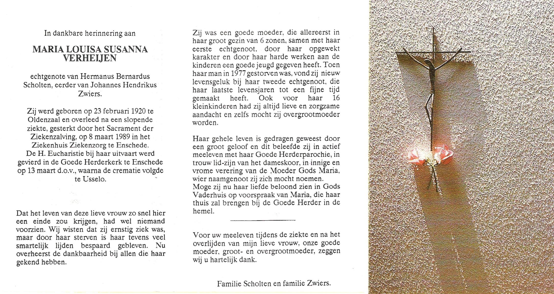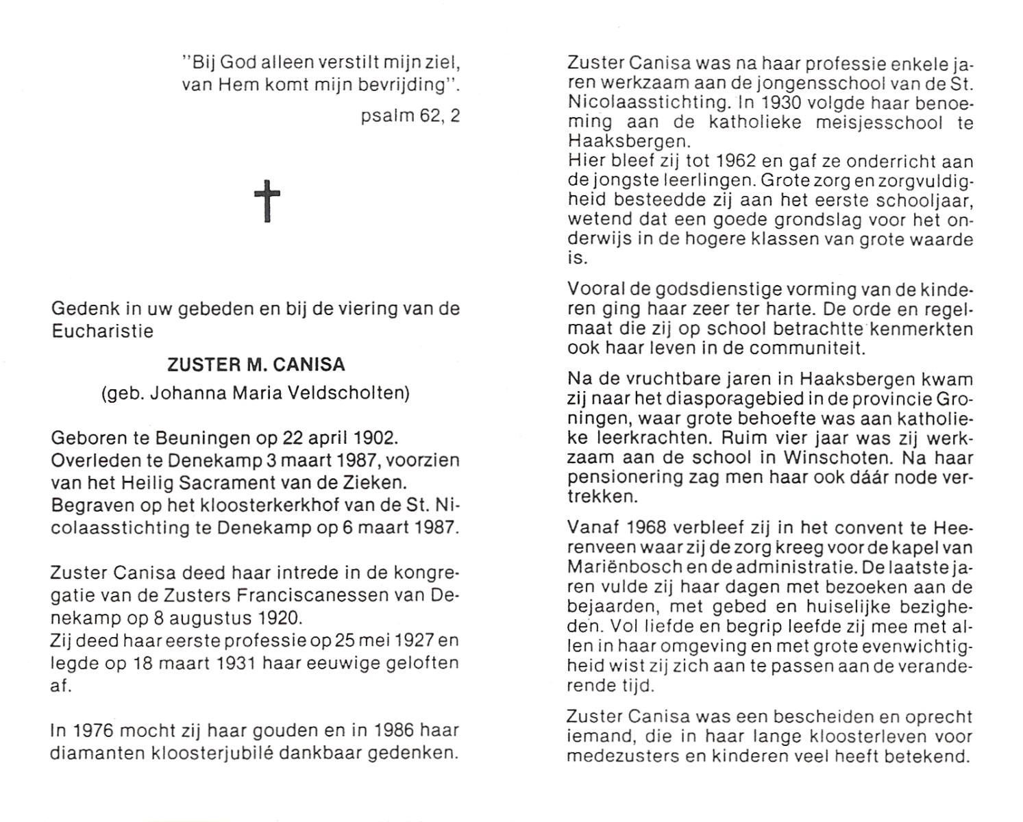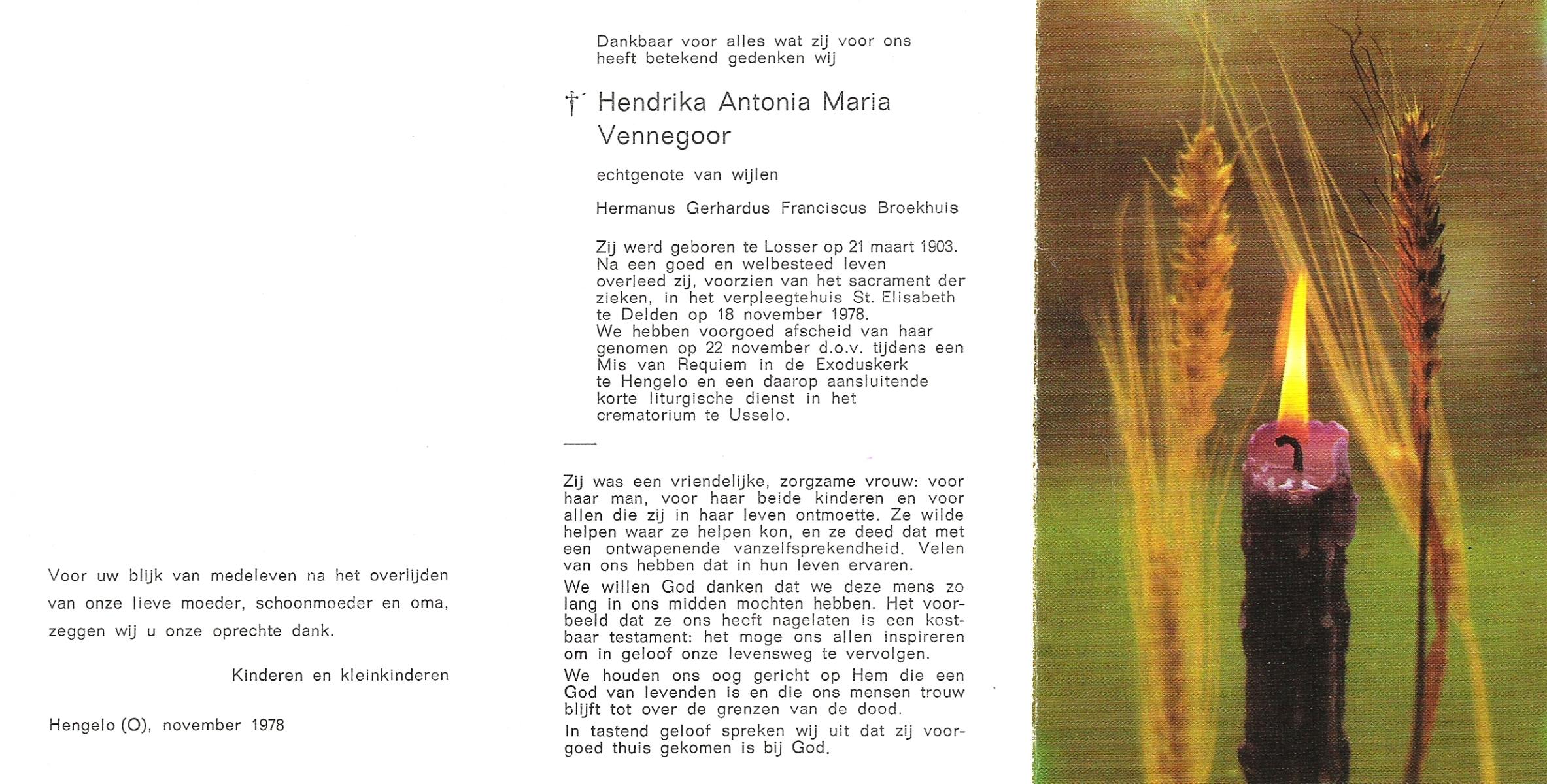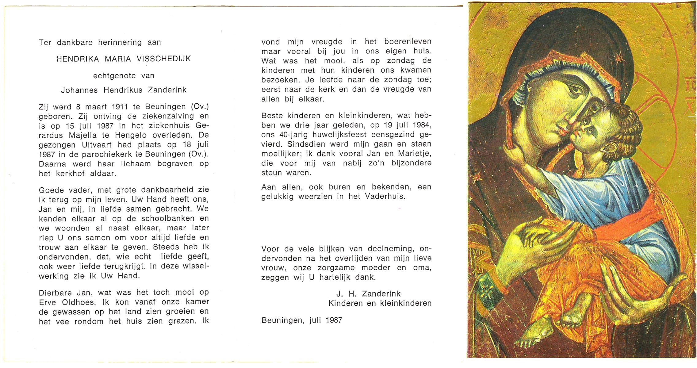 VISSCHEDIJK, Hendrika Maria, geboren op 8-3-1911 te Beuningen (Ov.), overleden op 15-7-1987 te Oldenzaal op 76-jarige leeftijd, begraven op 18-7-1987 te Beuningen.