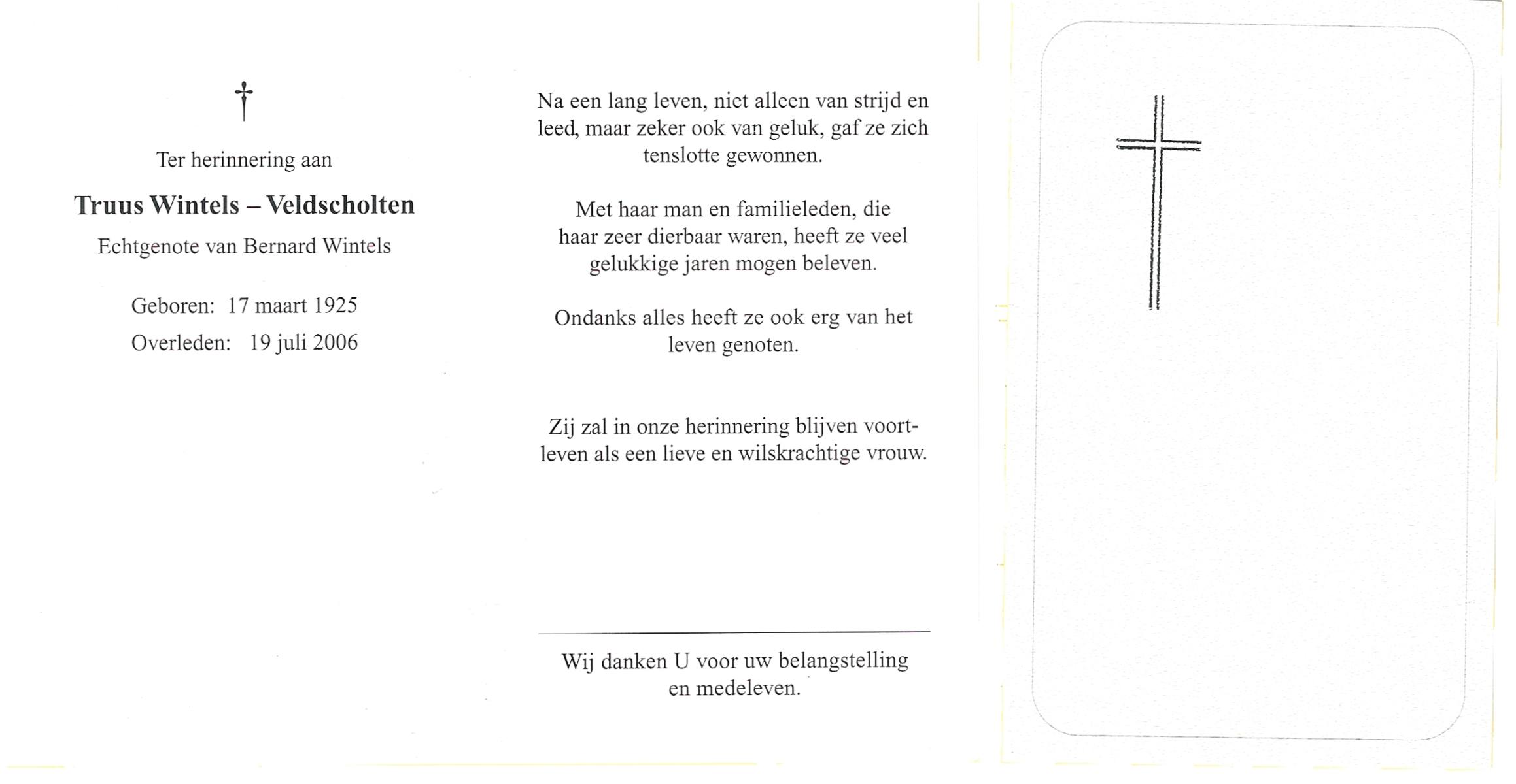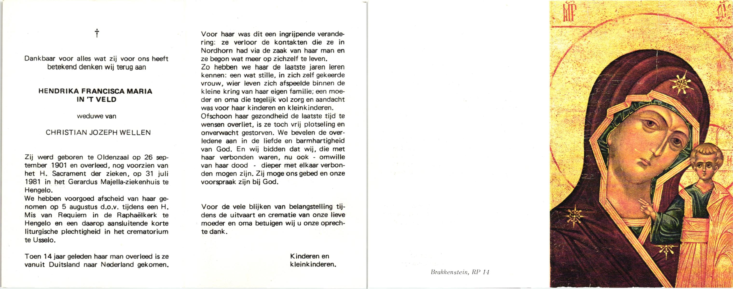 VELD, in 't, Hendrika Francisca Maria, geboren op 26-9-1901 te Oldenzaal, overleden op 31-7-1981 te Hengelo (O) op 79-jarige leeftijd, gecremeerd op 5-8-1981 te Usselo.