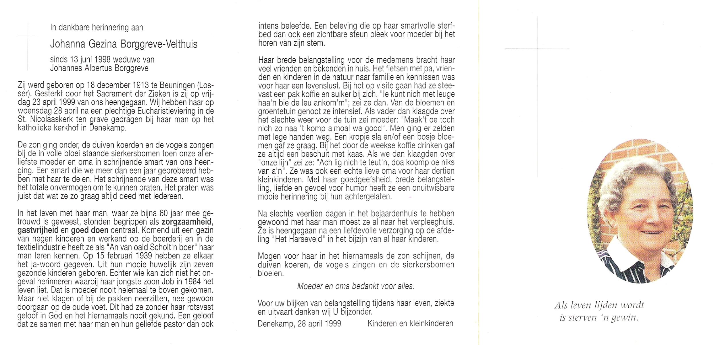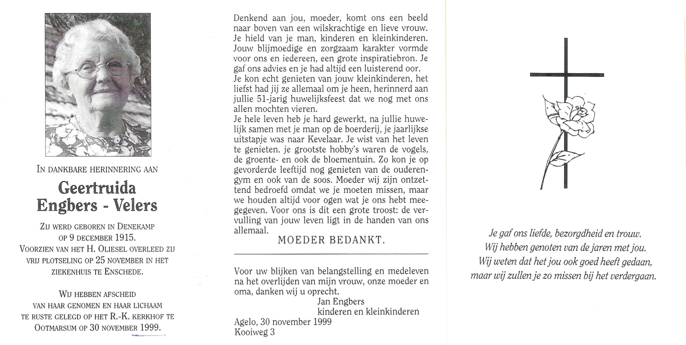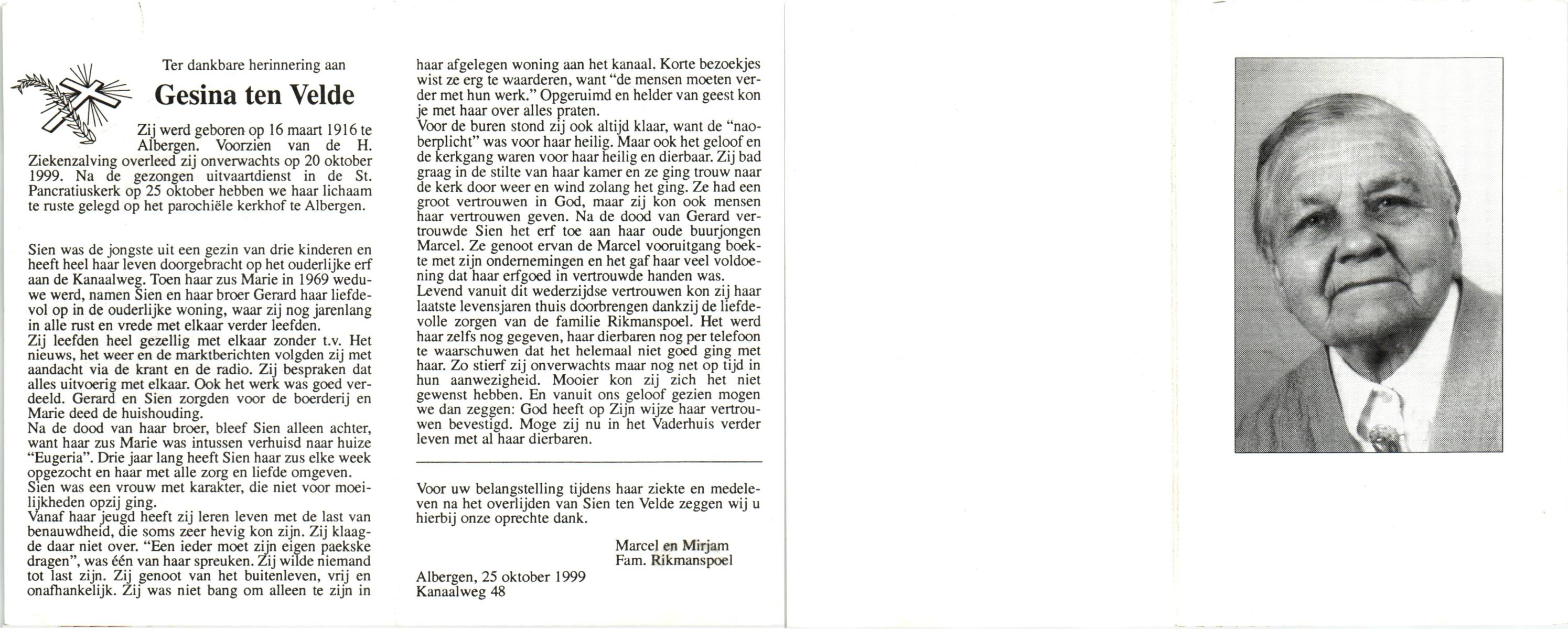 VELDE, ten, Gesina, geboren op 16-3-1916 te Albergen, overleden op 20-10-1999 op 83-jarige leeftijd, begraven op 25-10-1999 te Albergen.