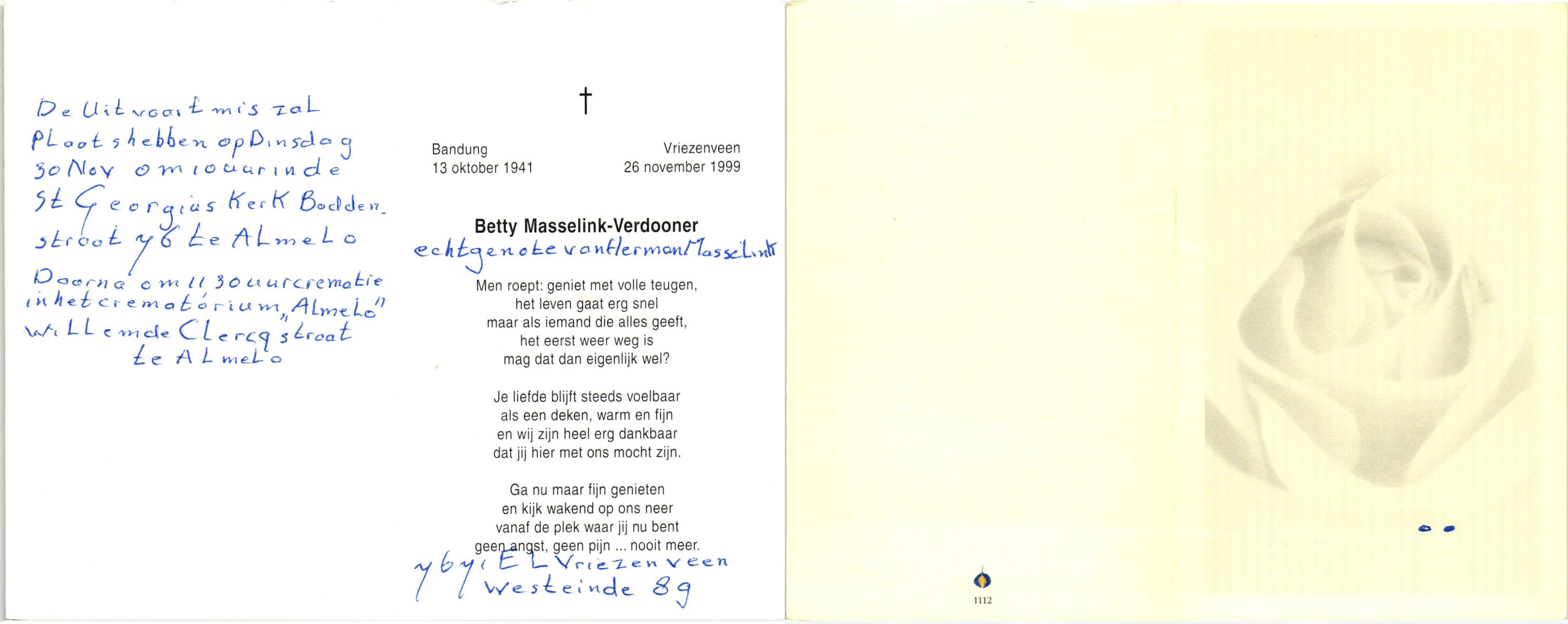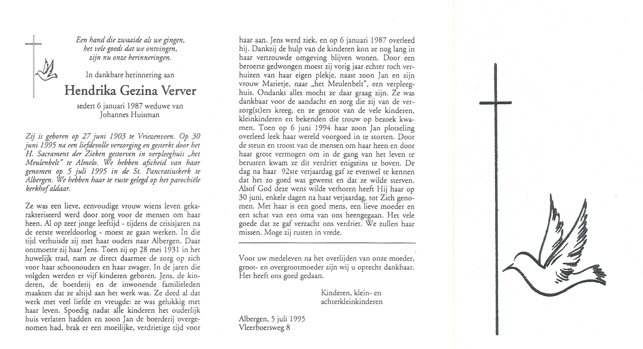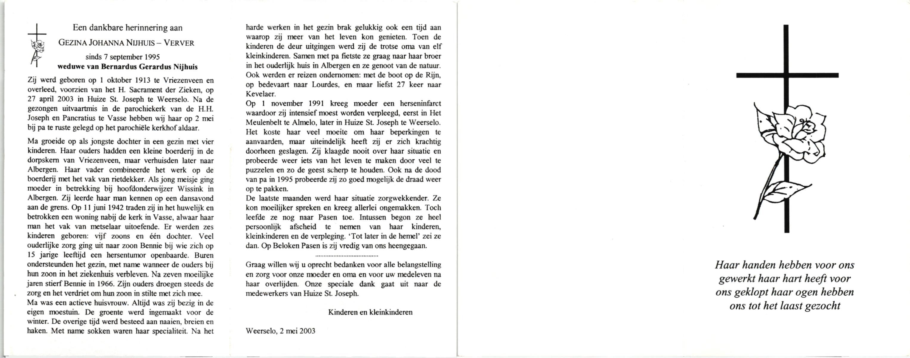 VELDE, ten, Gesina, geboren op 16-3-1916 te Albergen, overleden op 20-10-1999 op 83-jarige leeftijd, begraven op 25-10-1999 te Albergen.