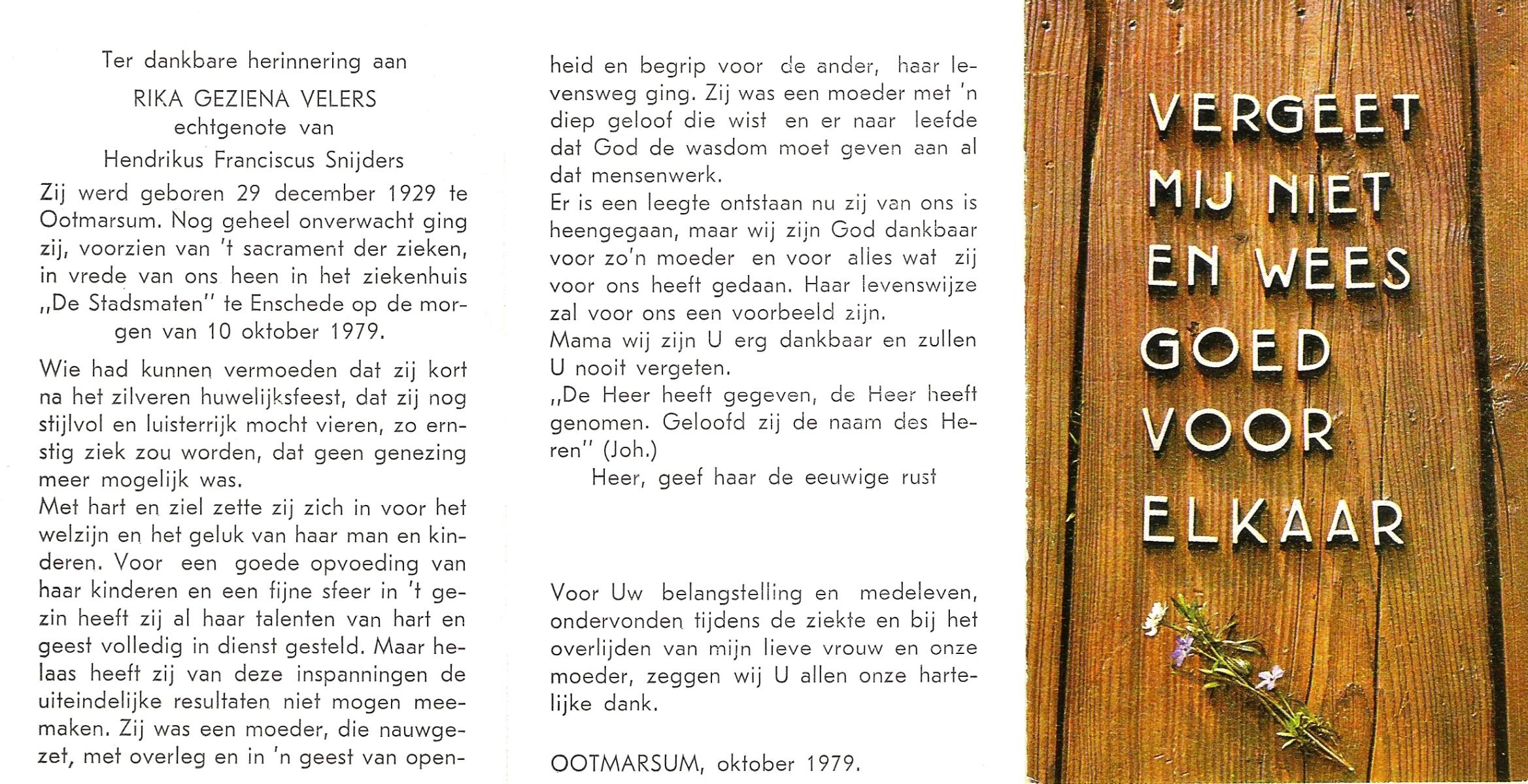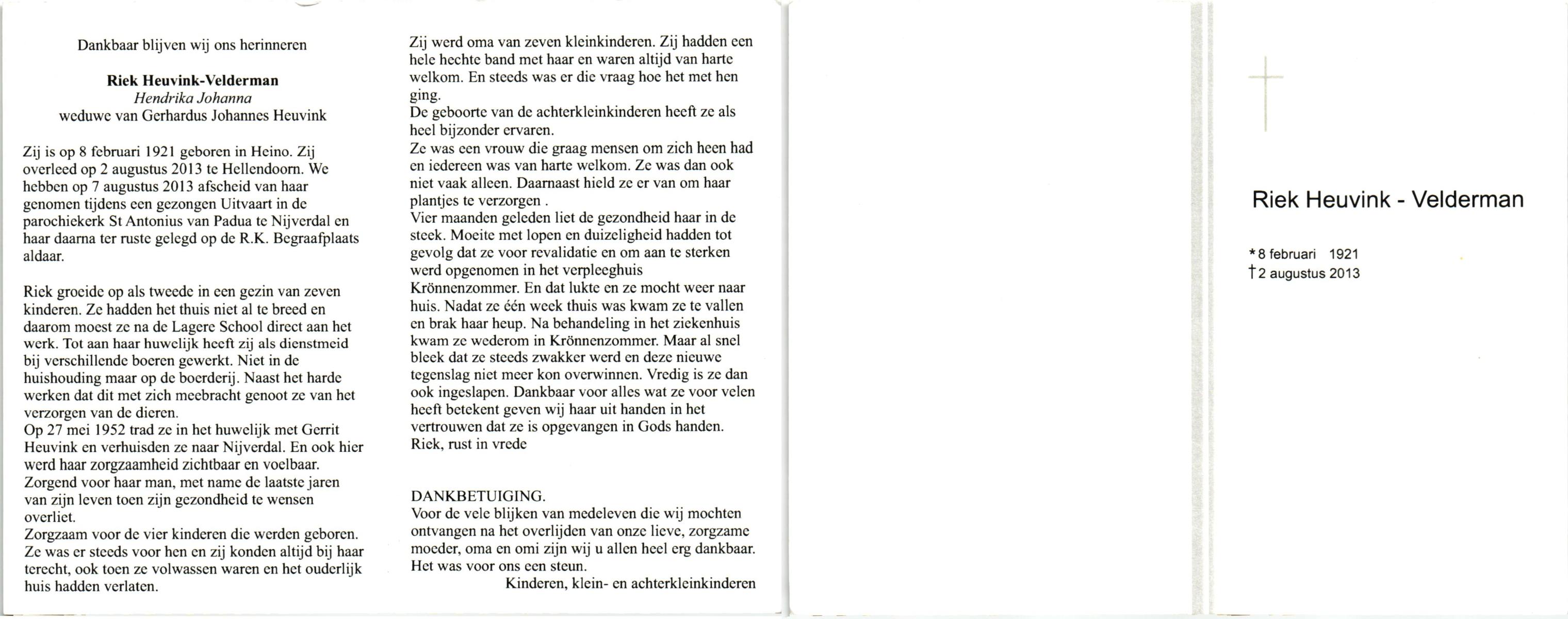 VELDERMAN, Riek (Hendrika Johanna), geboren op 8-2-1921 te Heino, overleden op 2-8-2013 te Hellendoorn op 91-jarige leeftijd, begraven op 7-8-2013 te Hellendoorn, Nijverdal, rk.