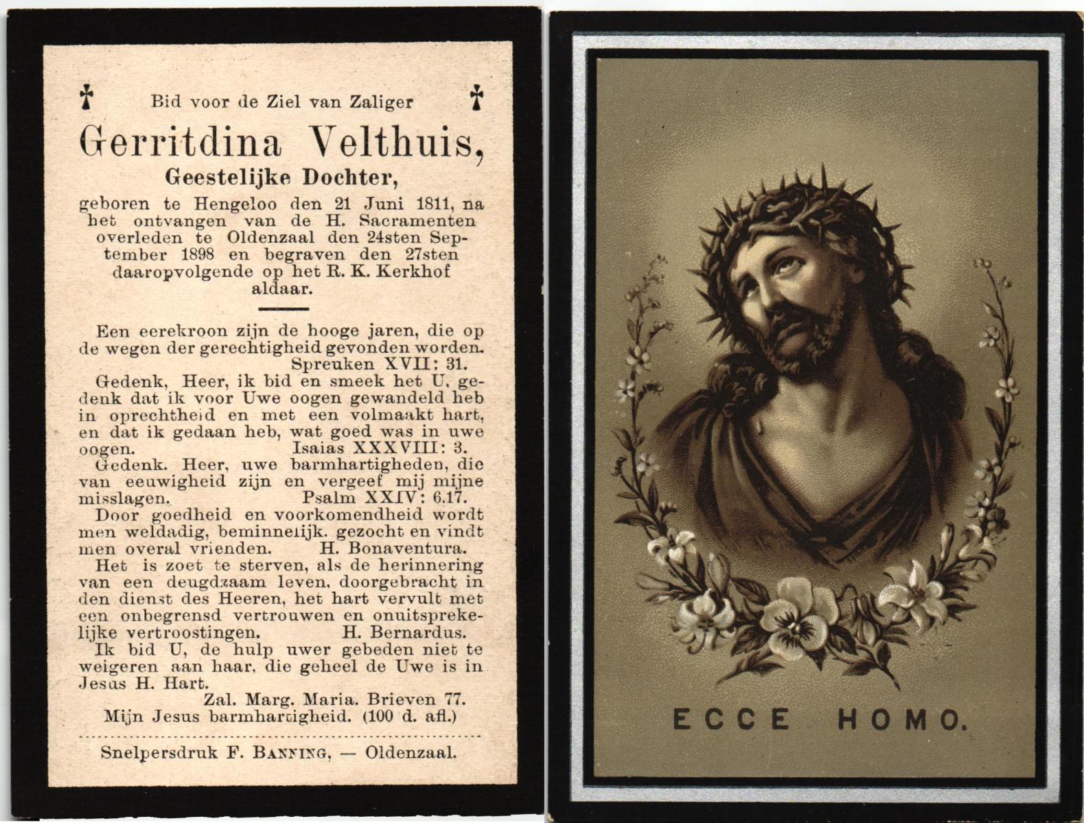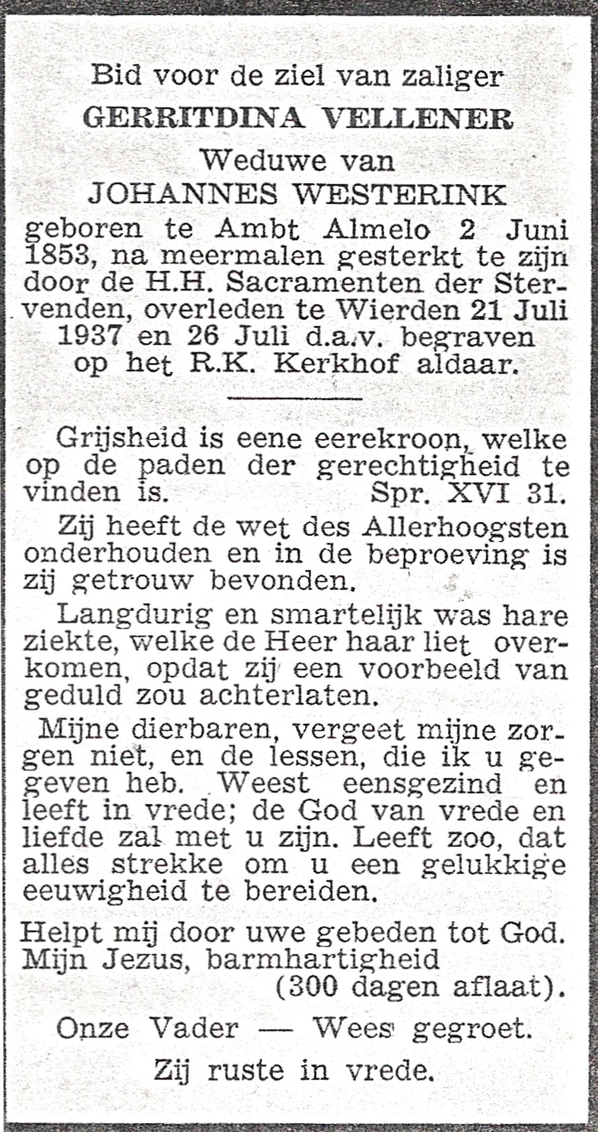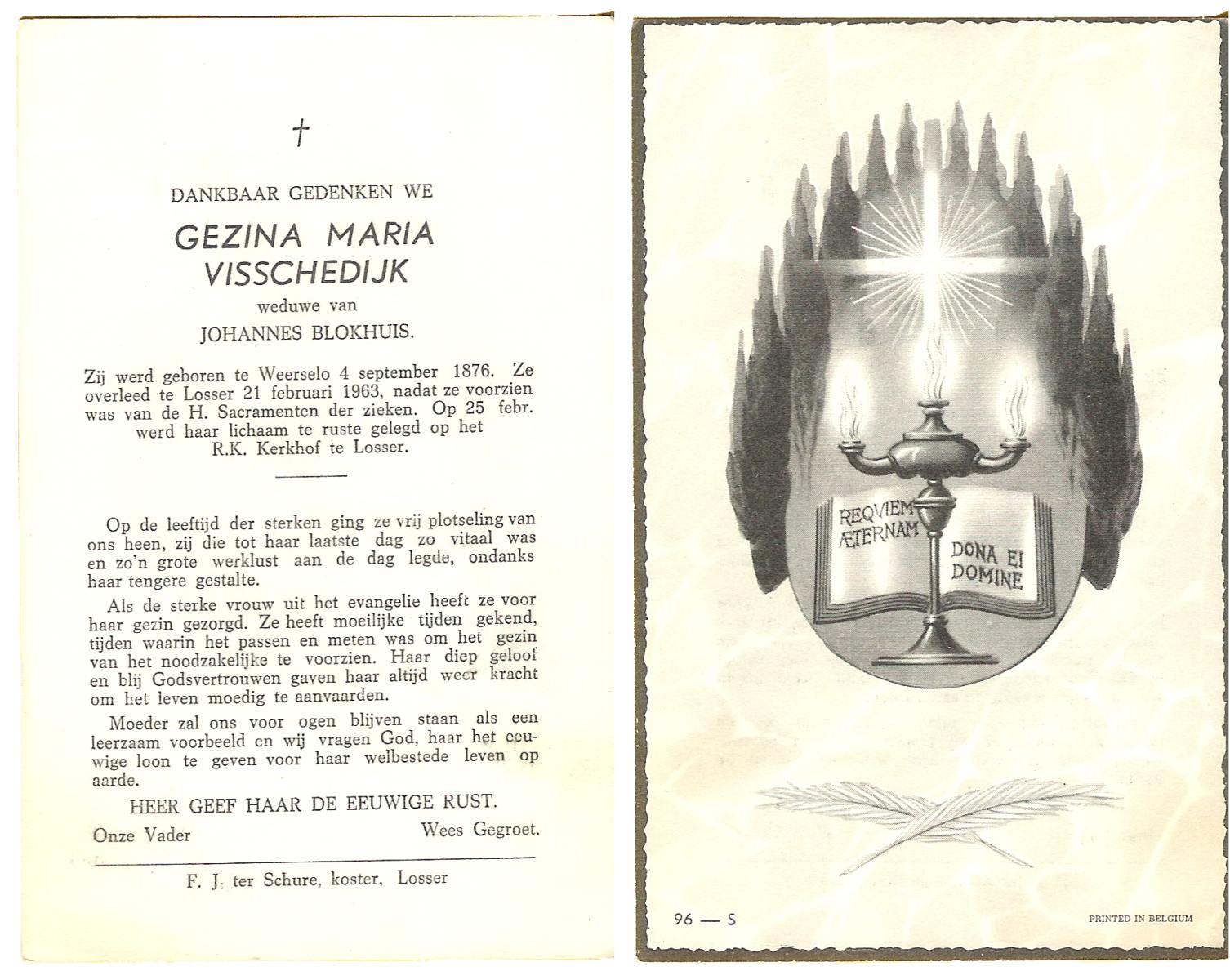 VISSCHEDIJK, Gezina Maria, geboren op 04-09-1876 te Weerselo, overleden op 21-2-1963 te Losser op 86-jarige leeftijd, begraven op 25-2-1963 te Losser.