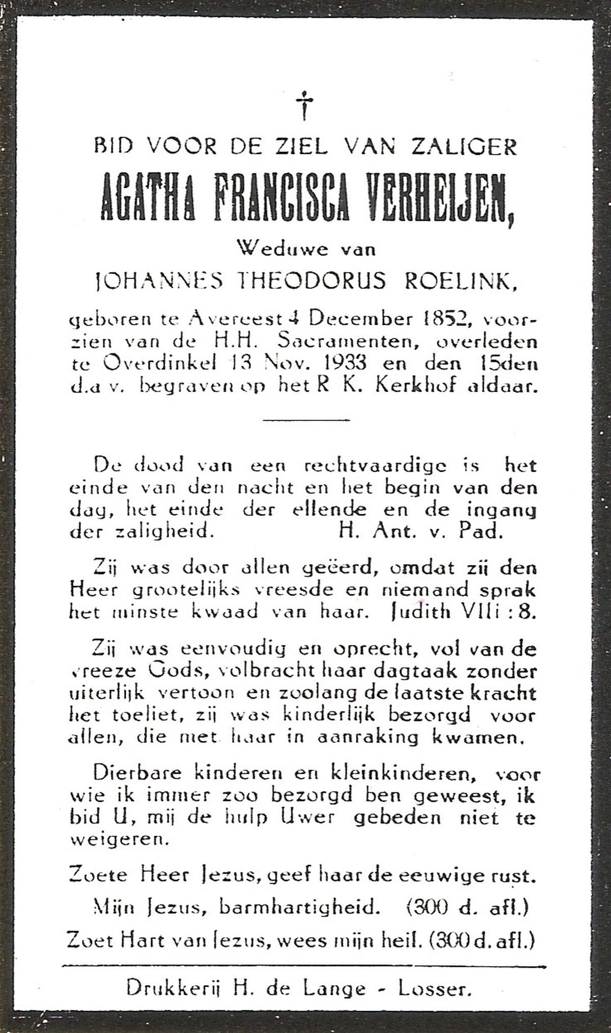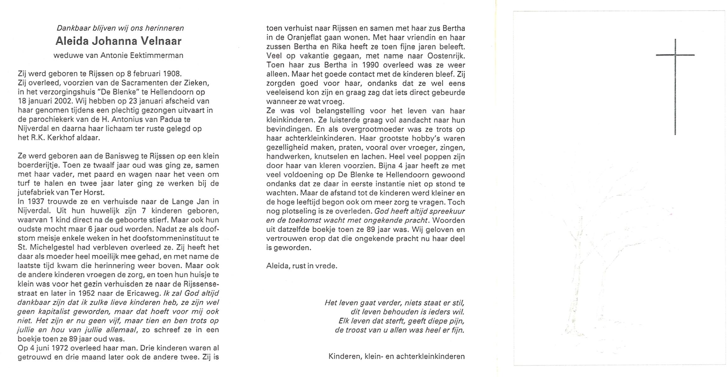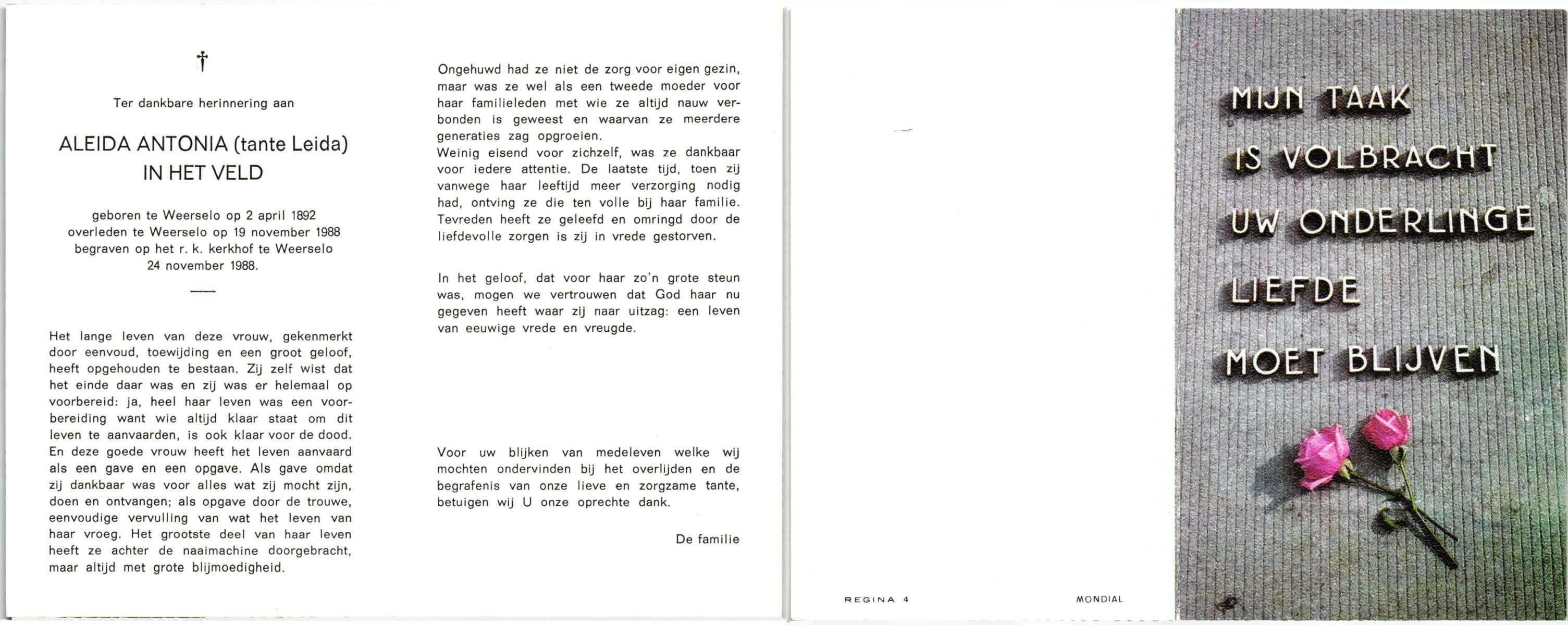VELD, in het, Aleida Antonia, geboren op 02-04-1892 te Weerselo, overleden op 19-11-1988 te Weerselo op 96-jarige leeftijd, begraven op 24-11-1988 te Weerselo.
