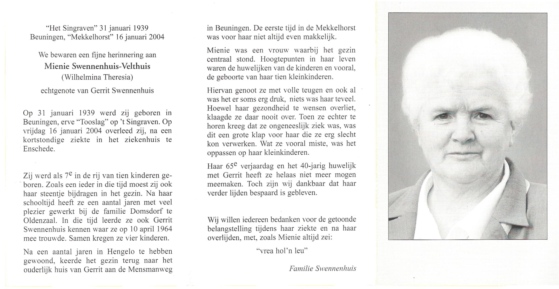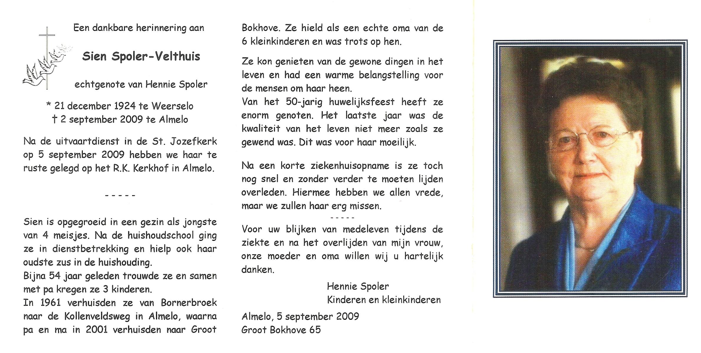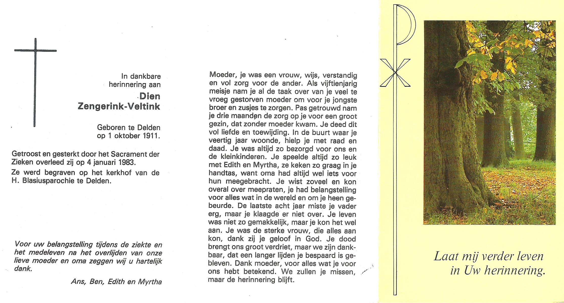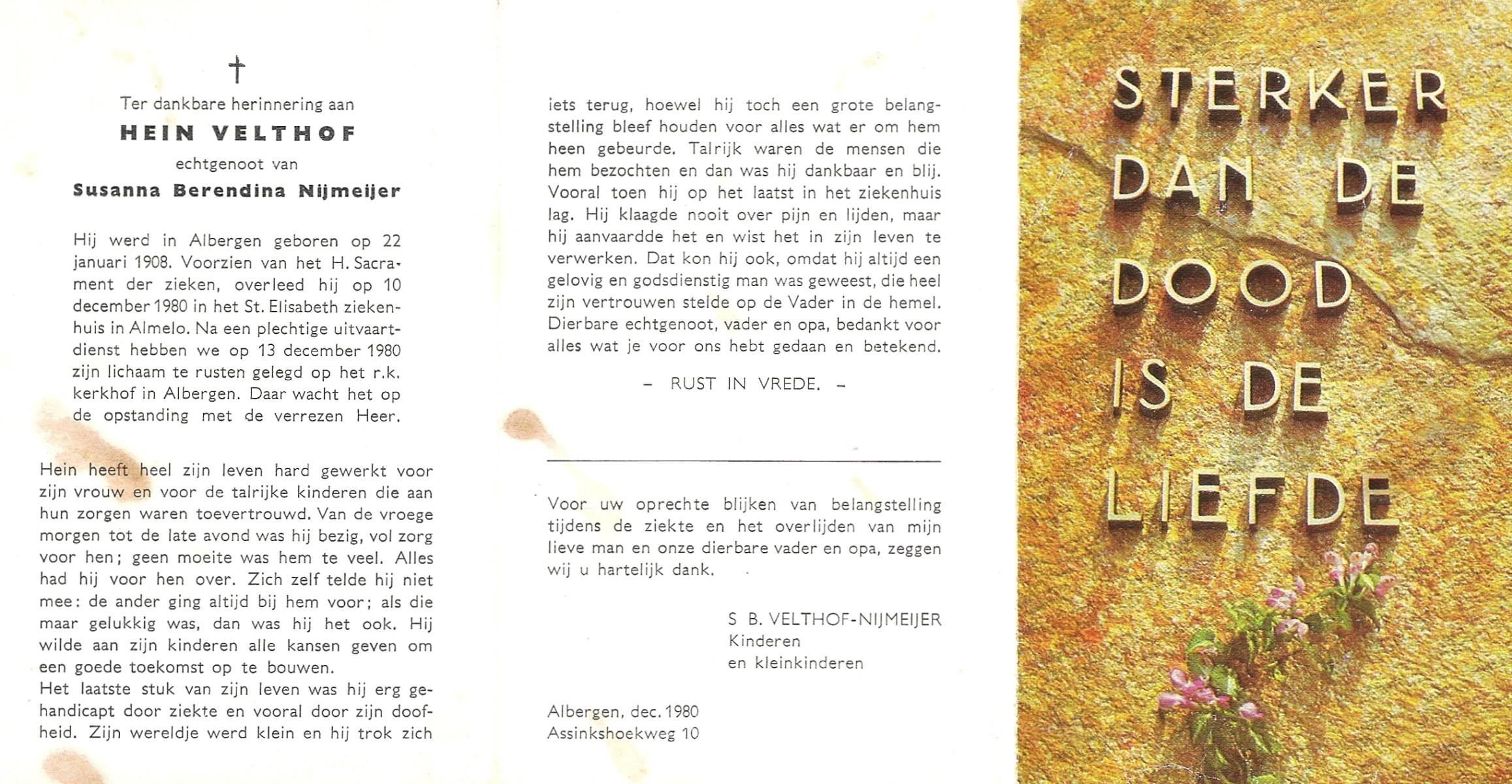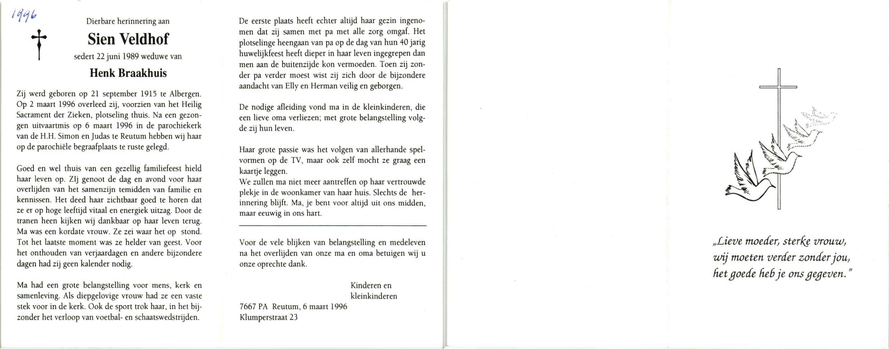VELDHOF, Sien, geboren op 21-9-1915 te Albergen, overleden op 2-3-1996 te Reutum op 80-jarige leeftijd, begraven op 6-3-1996 te Reutum.