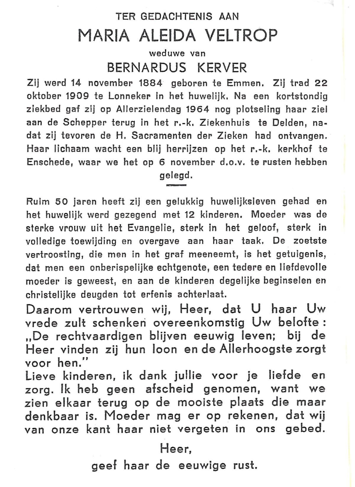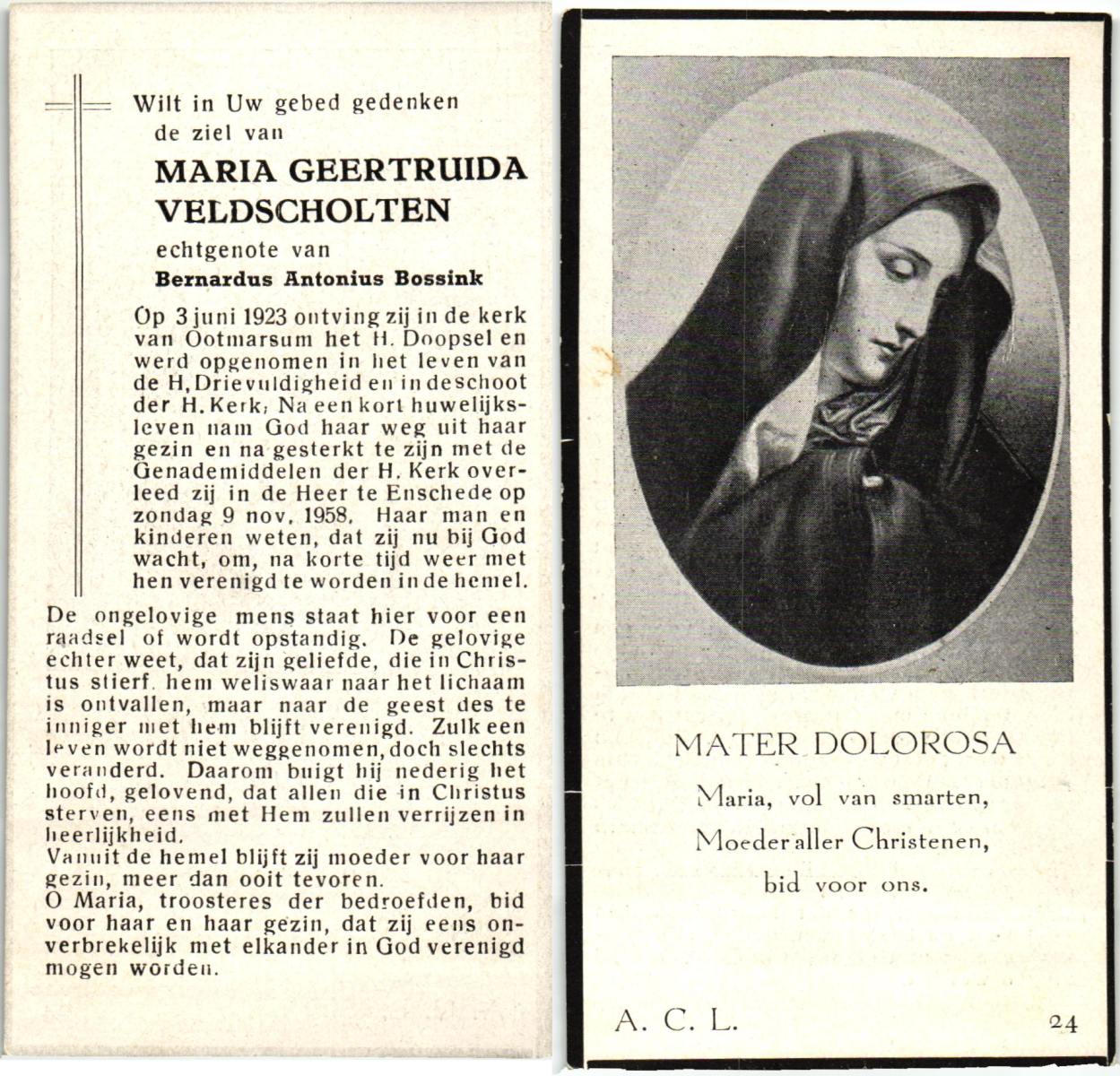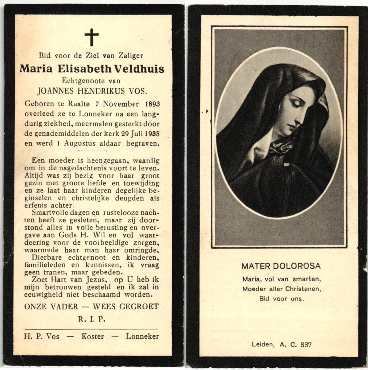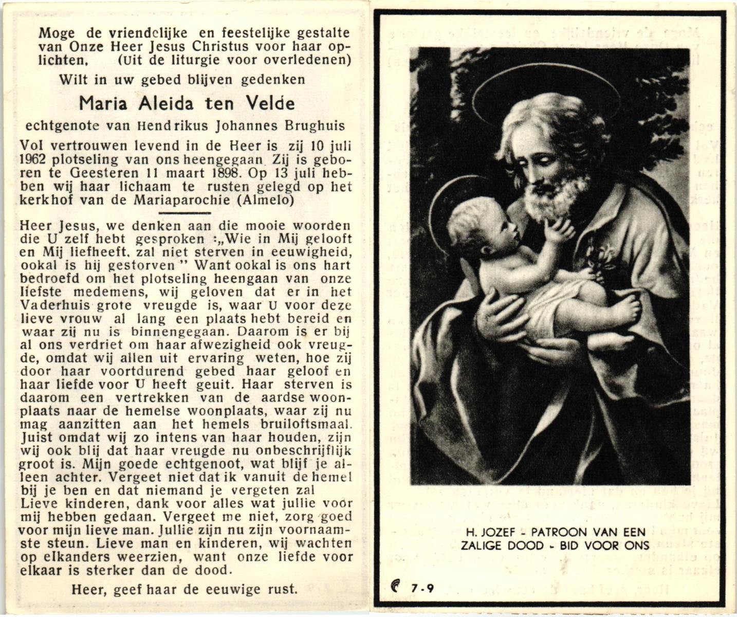 VELDE, ten, Maria Aleida, geboren op 11-03-1898 te Geesteren, overleden op 10-7-1962 op 64-jarige leeftijd, begraven op 13-7-1962 te Mariaparochie.
