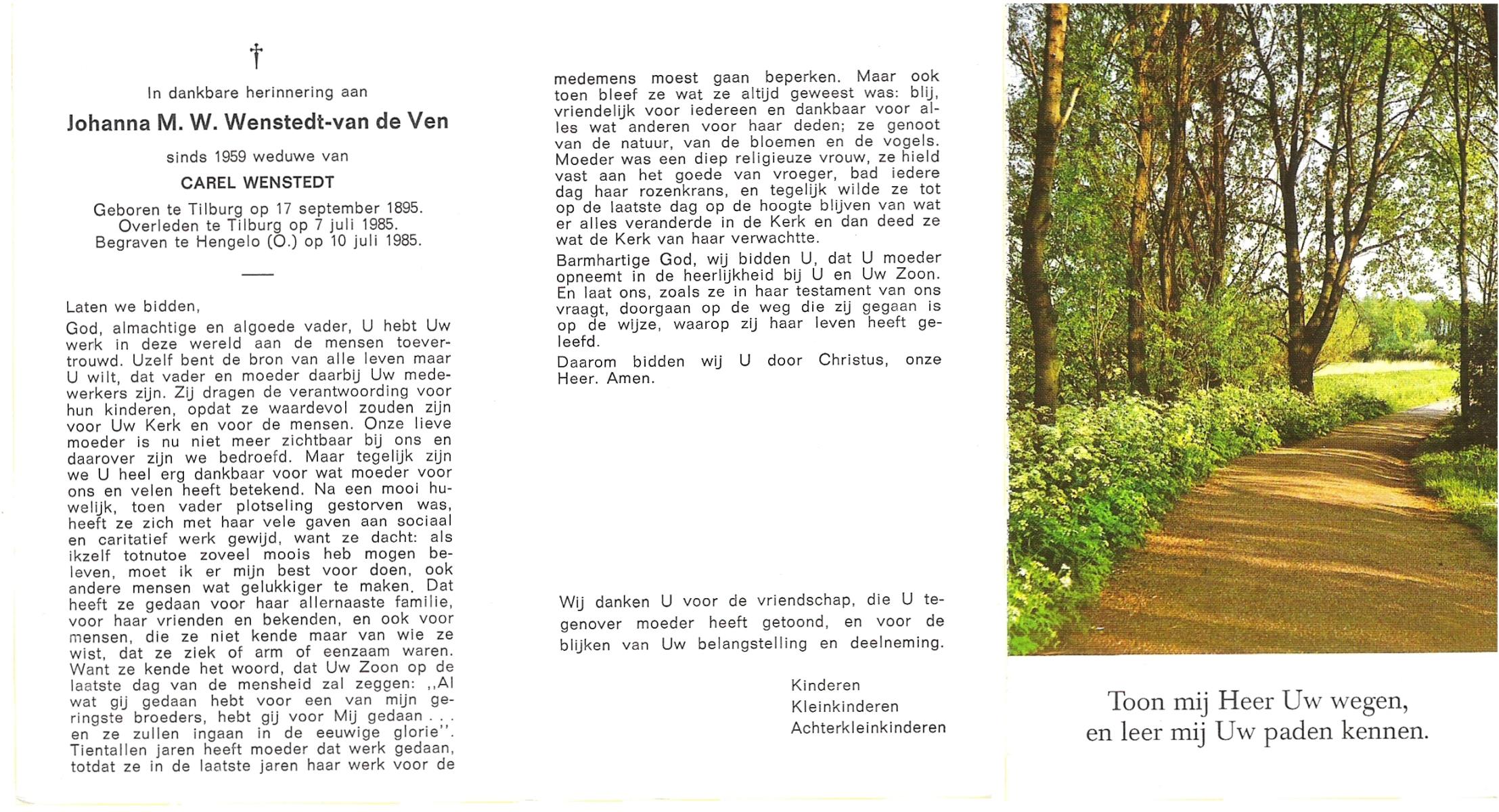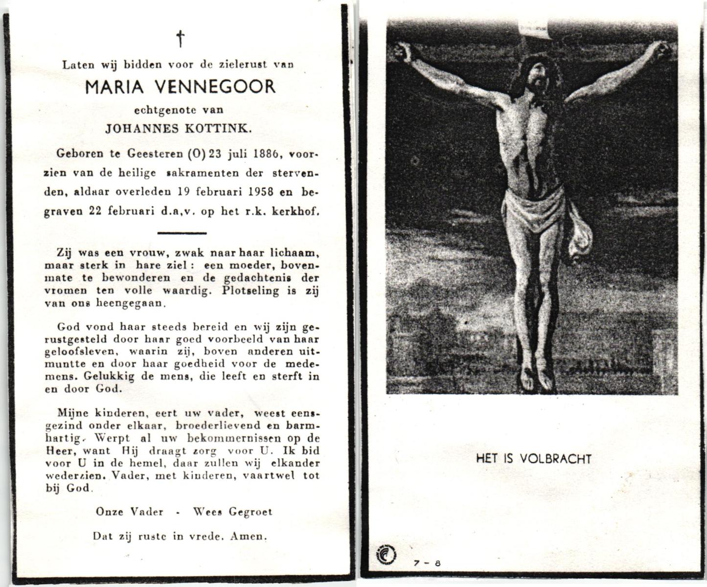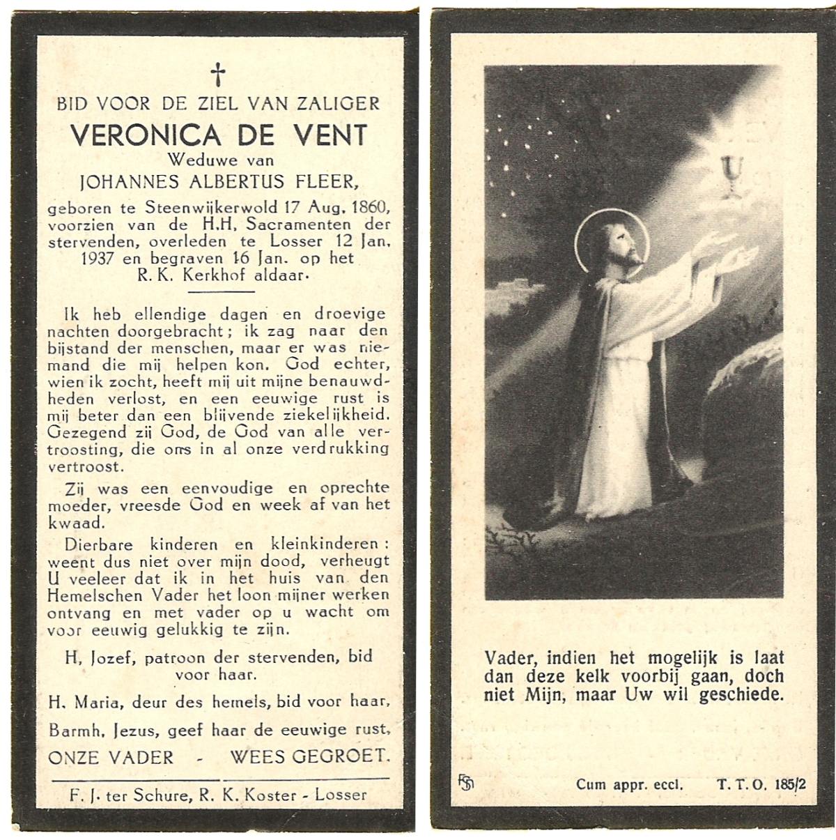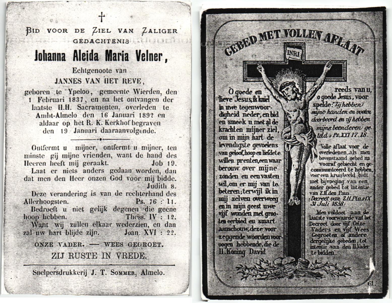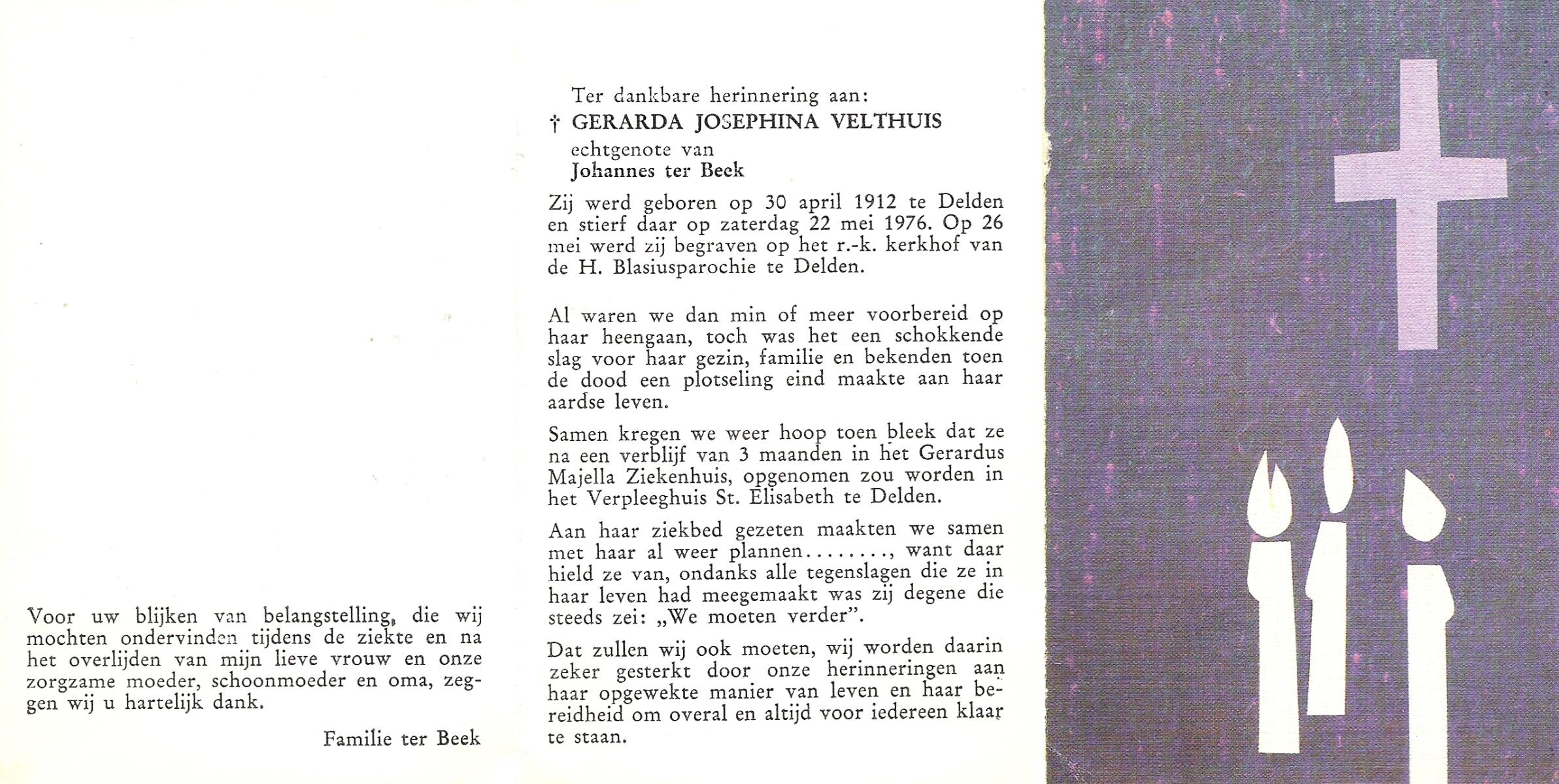VELDE, ten, Maria Aleida, geboren op 11-03-1898 te Geesteren, overleden op 10-7-1962 op 64-jarige leeftijd, begraven op 13-7-1962 te Mariaparochie.