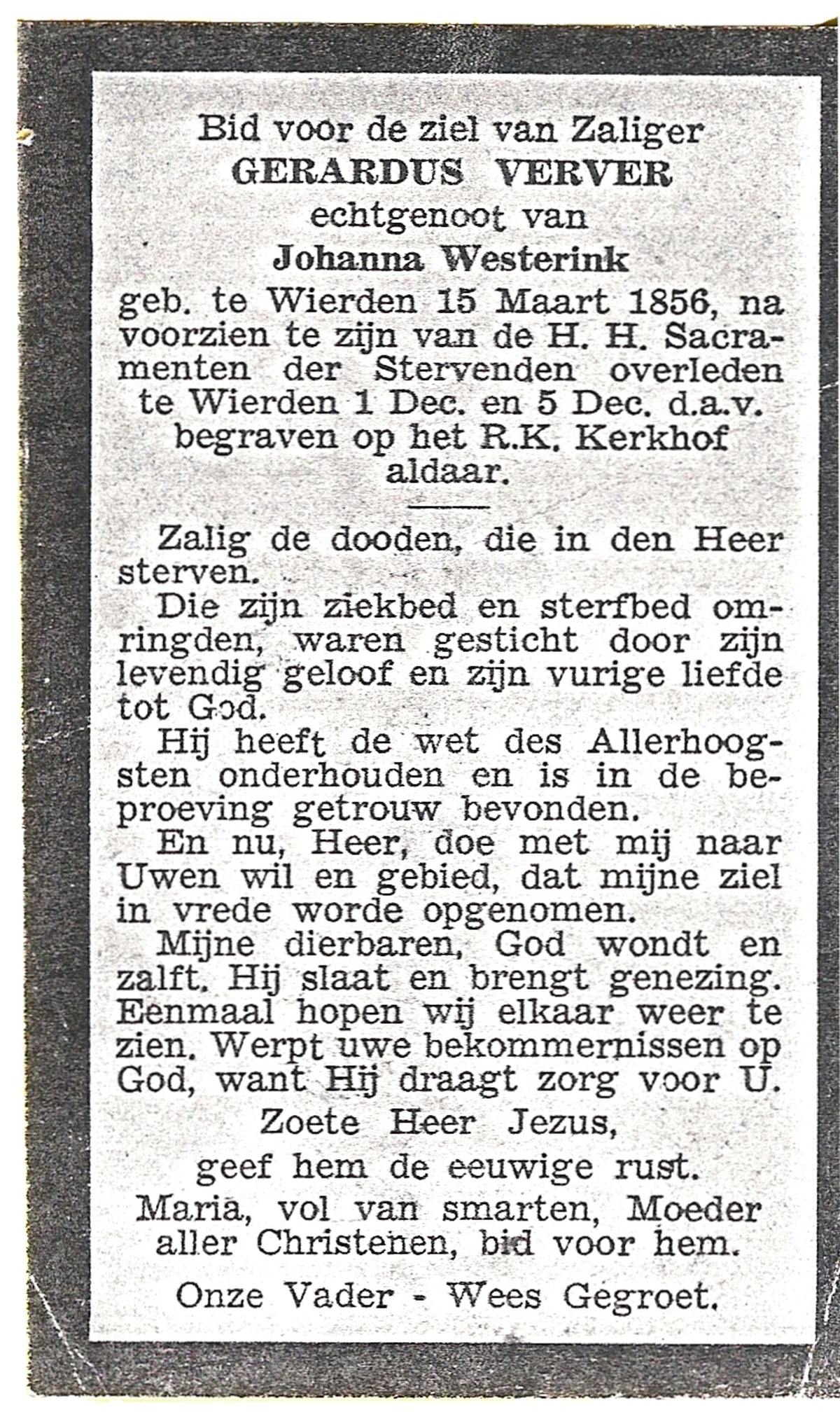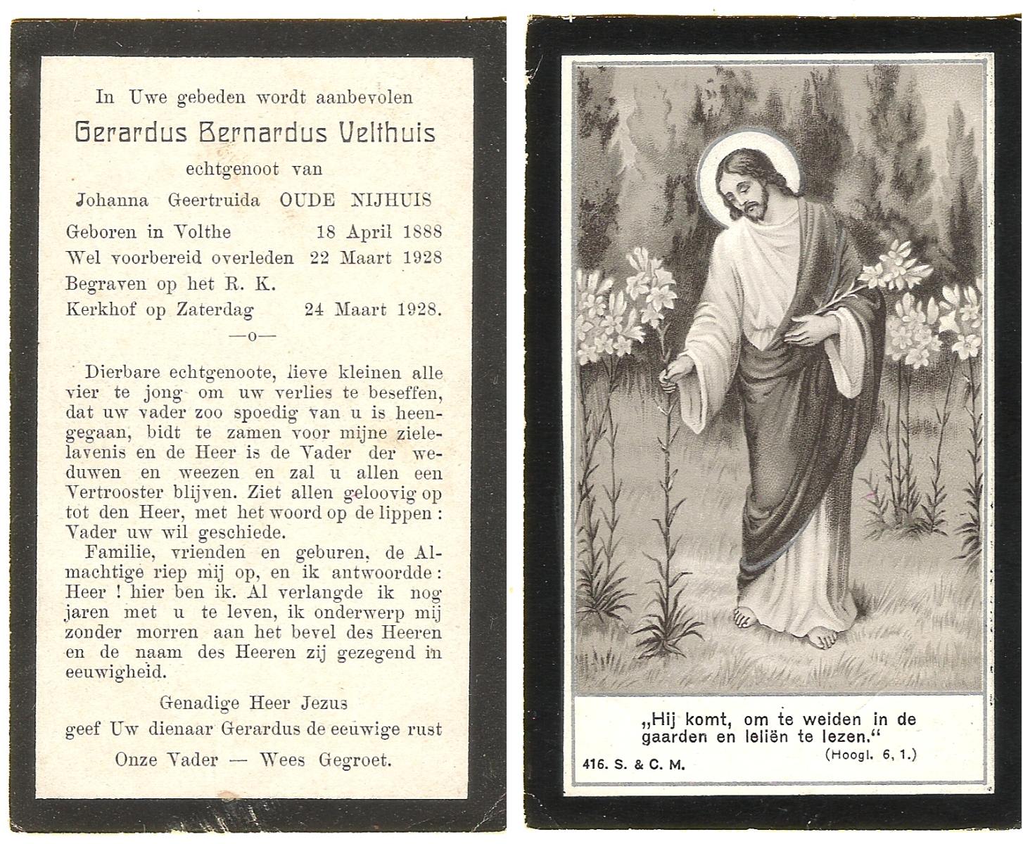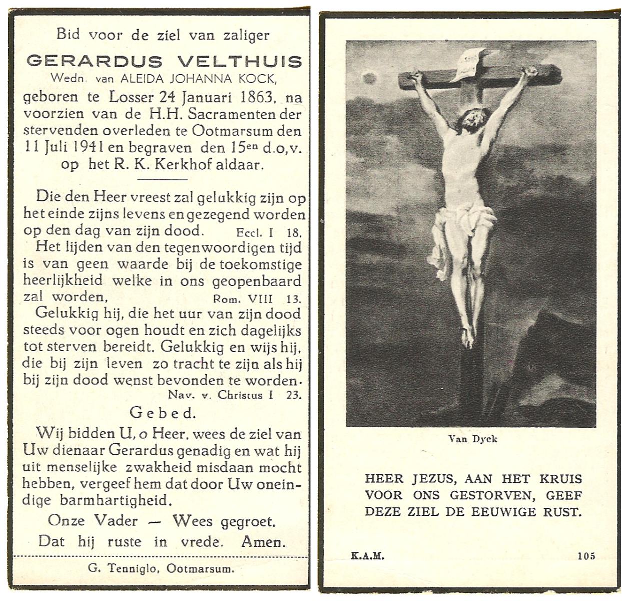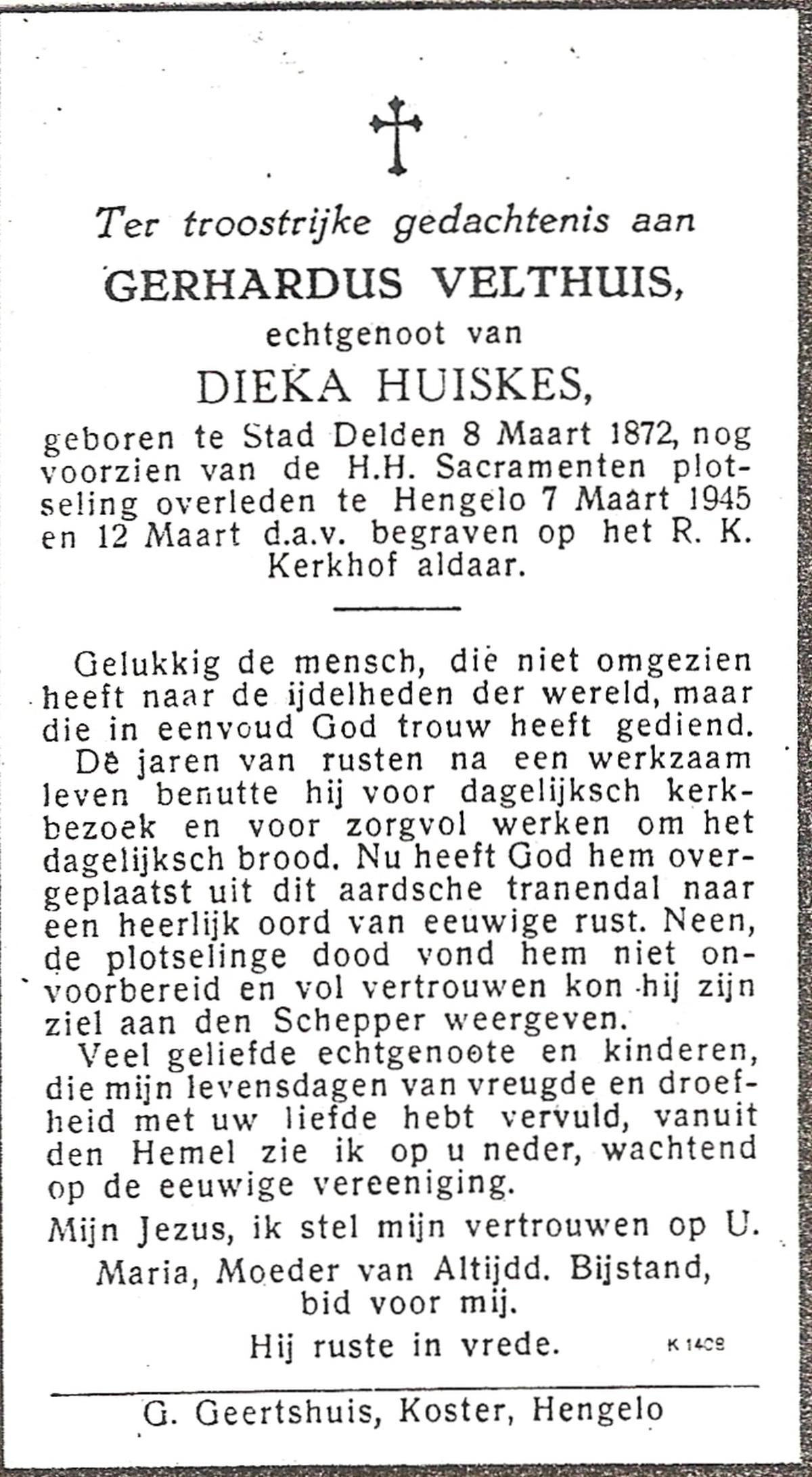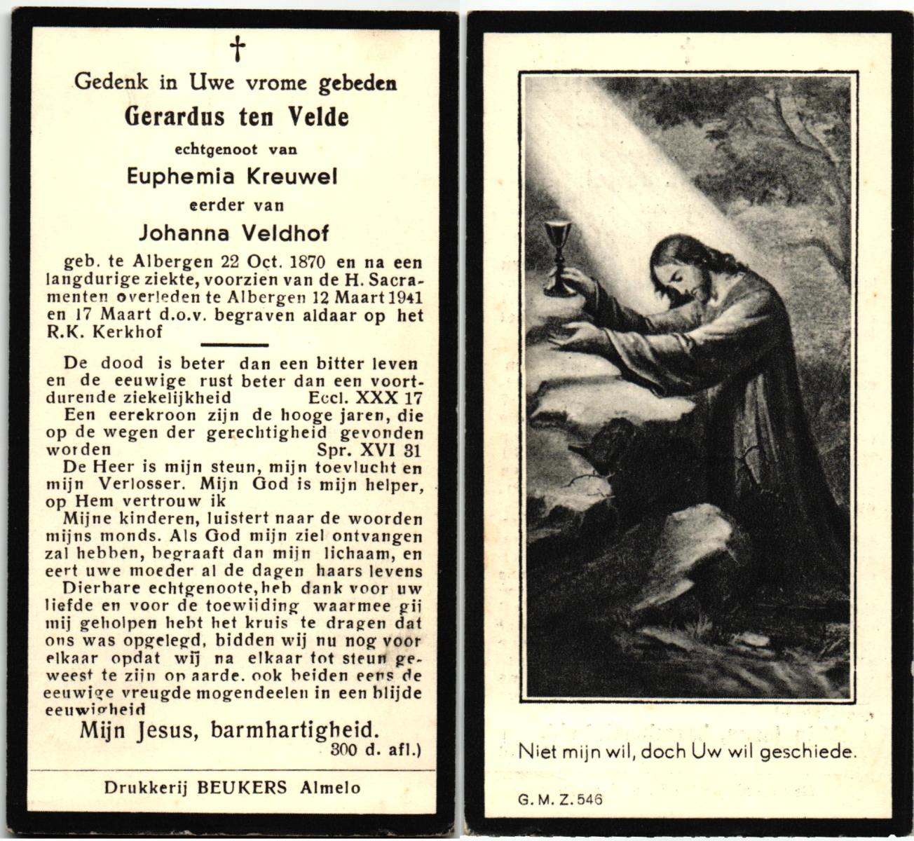 VELDE, ten, Gerardus, geboren op 22-10-1870 te Albergen, overleden op 12-3-1941 te Albergen op 70-jarige leeftijd, begraven op 17-3-1941 te Albergen.