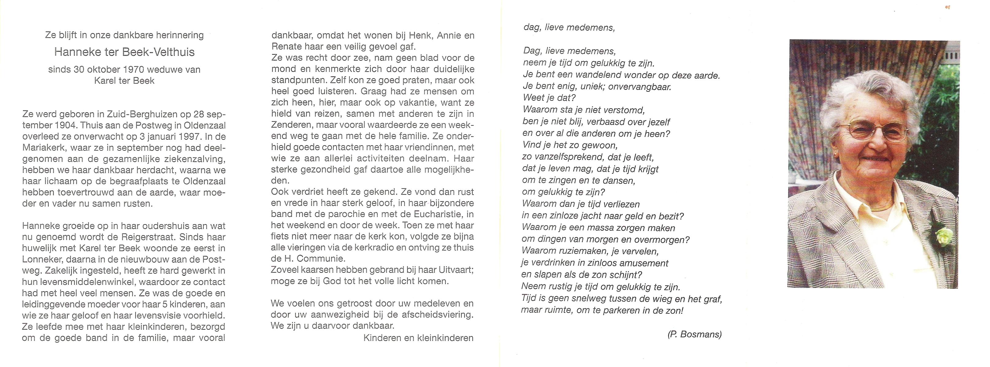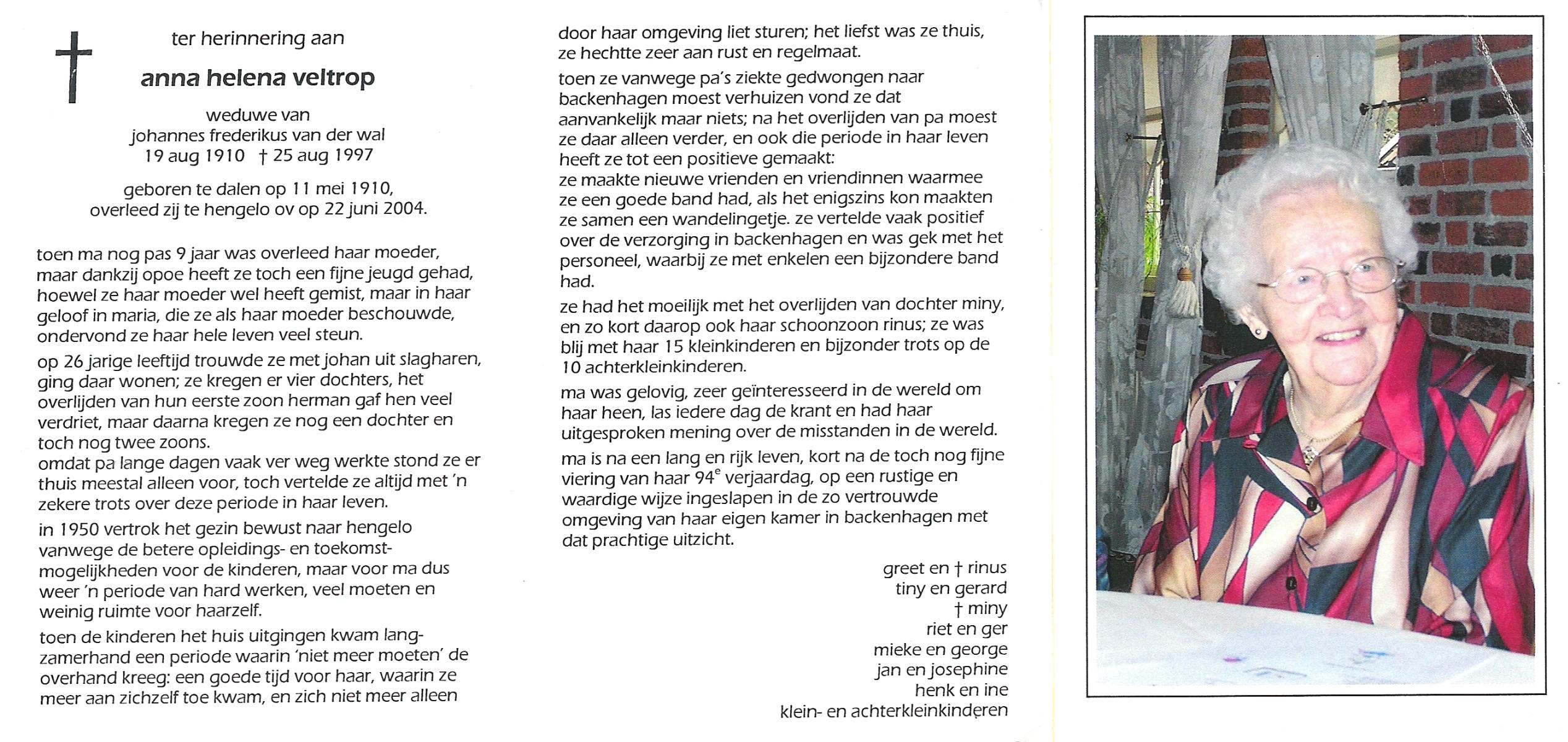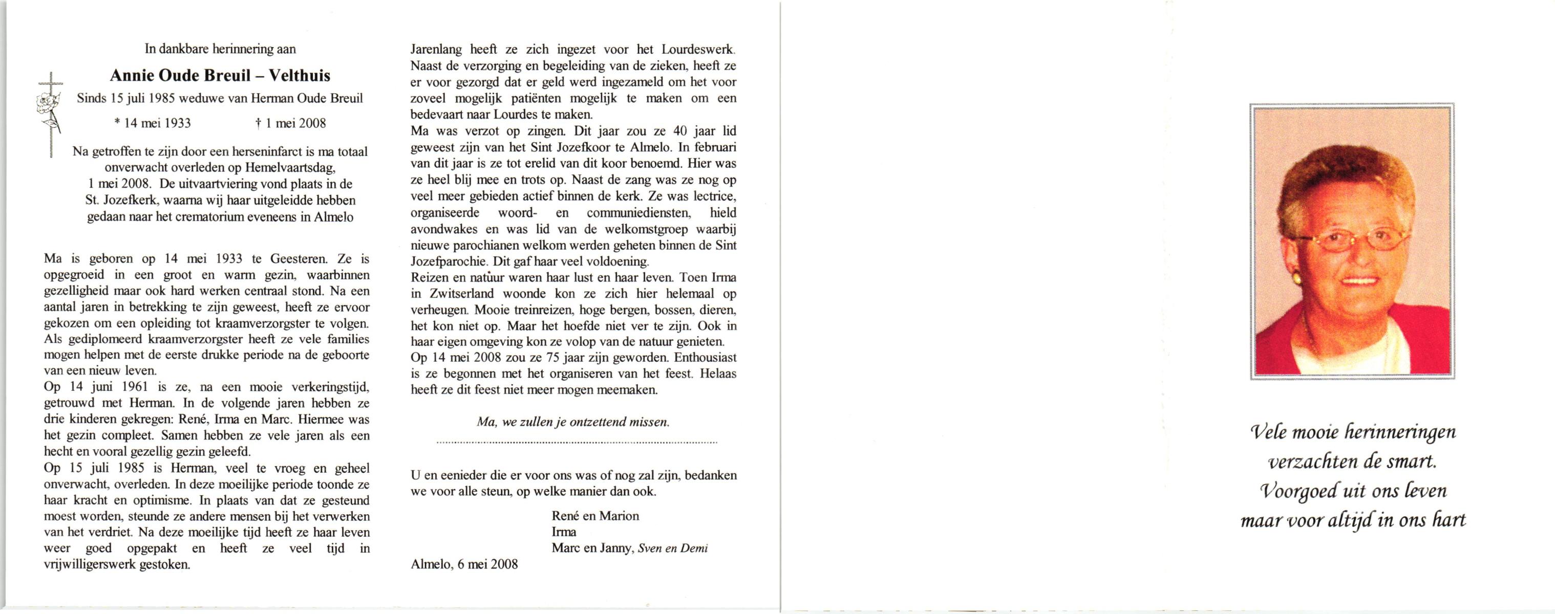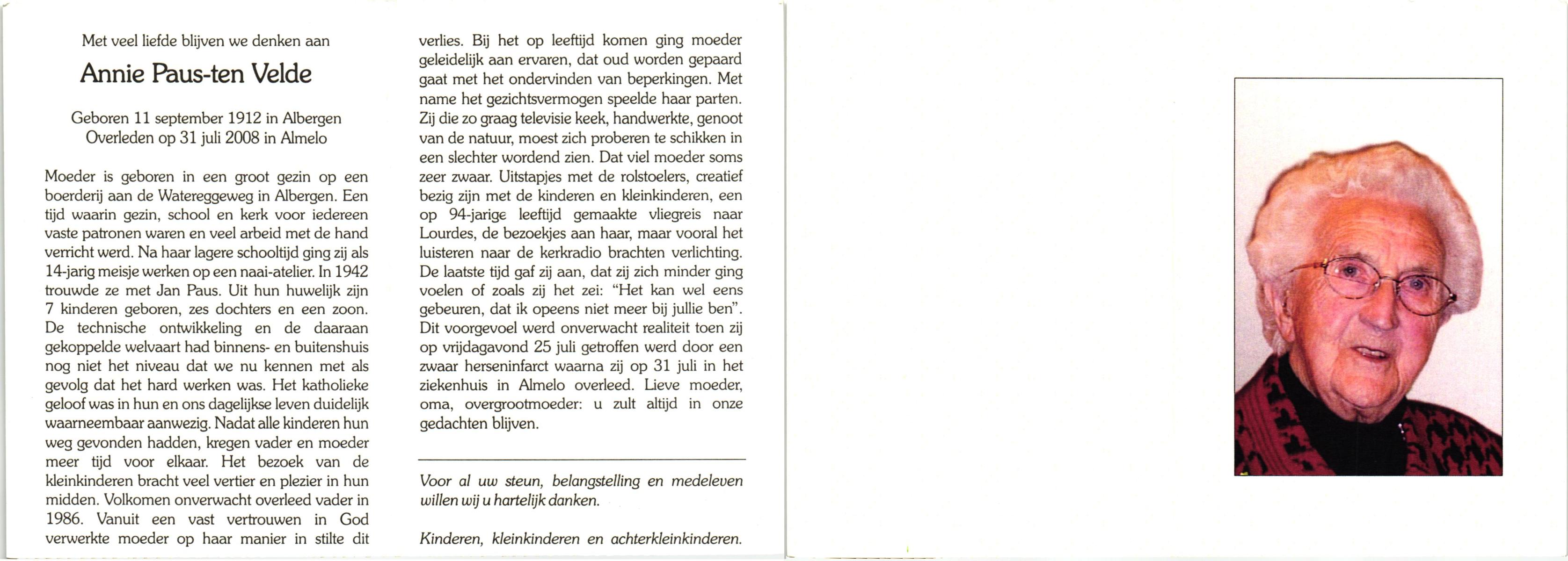 VELDE, ten, Annie, geboren op 11-9-1912 te Albergen, overleden op 31-7-2008 te Almelo op 95-jarige leeftijd.