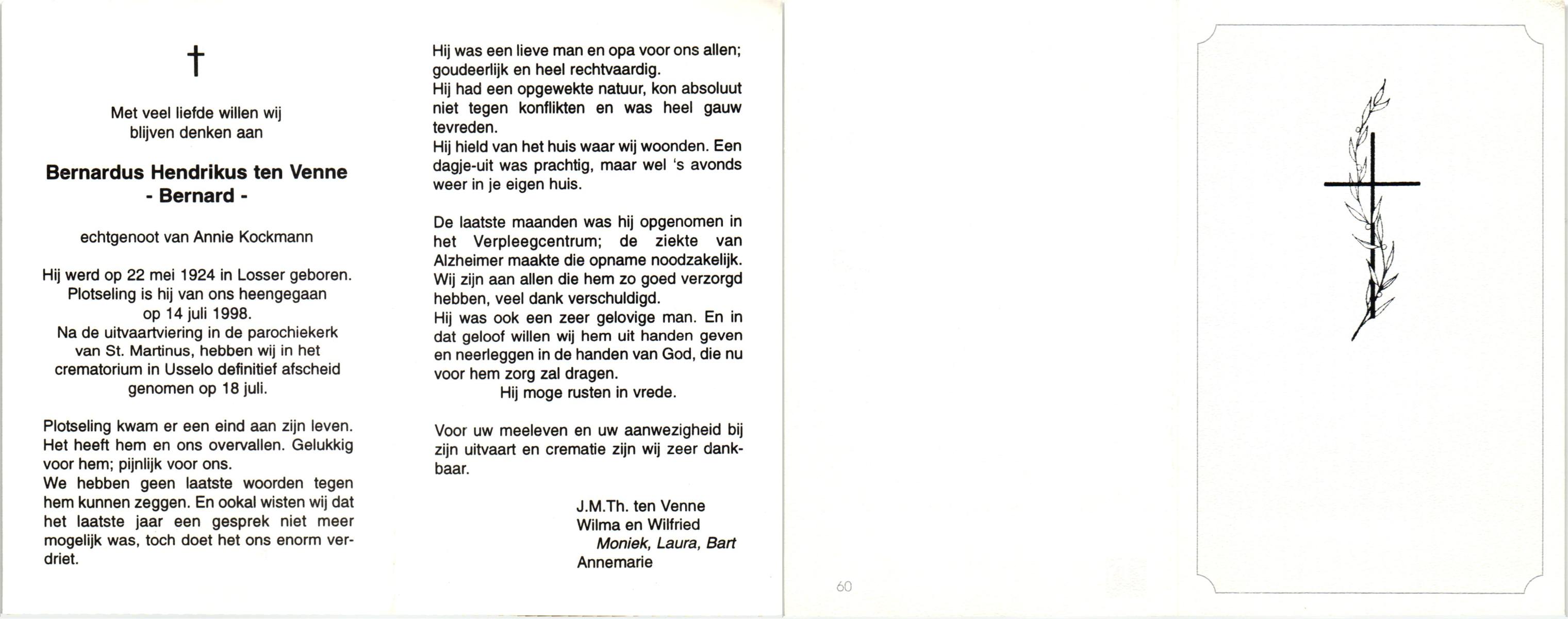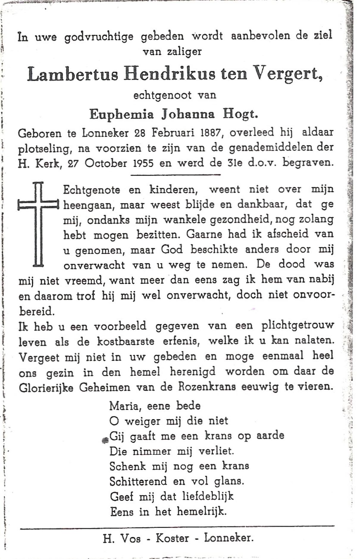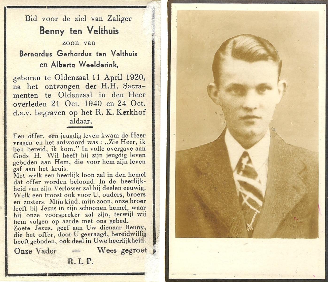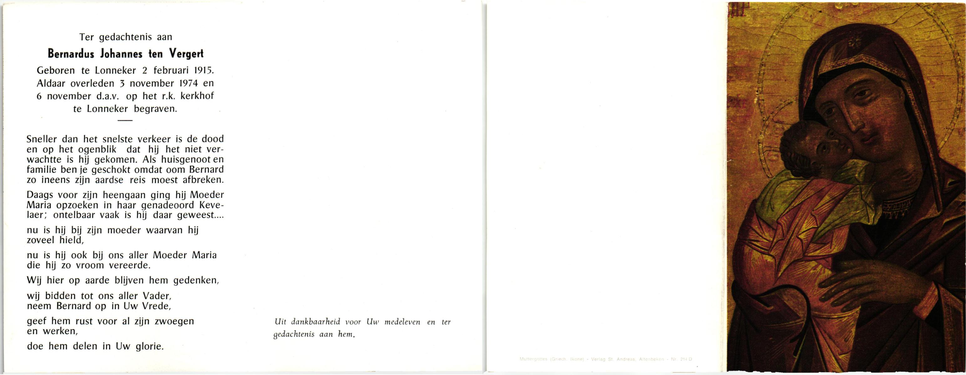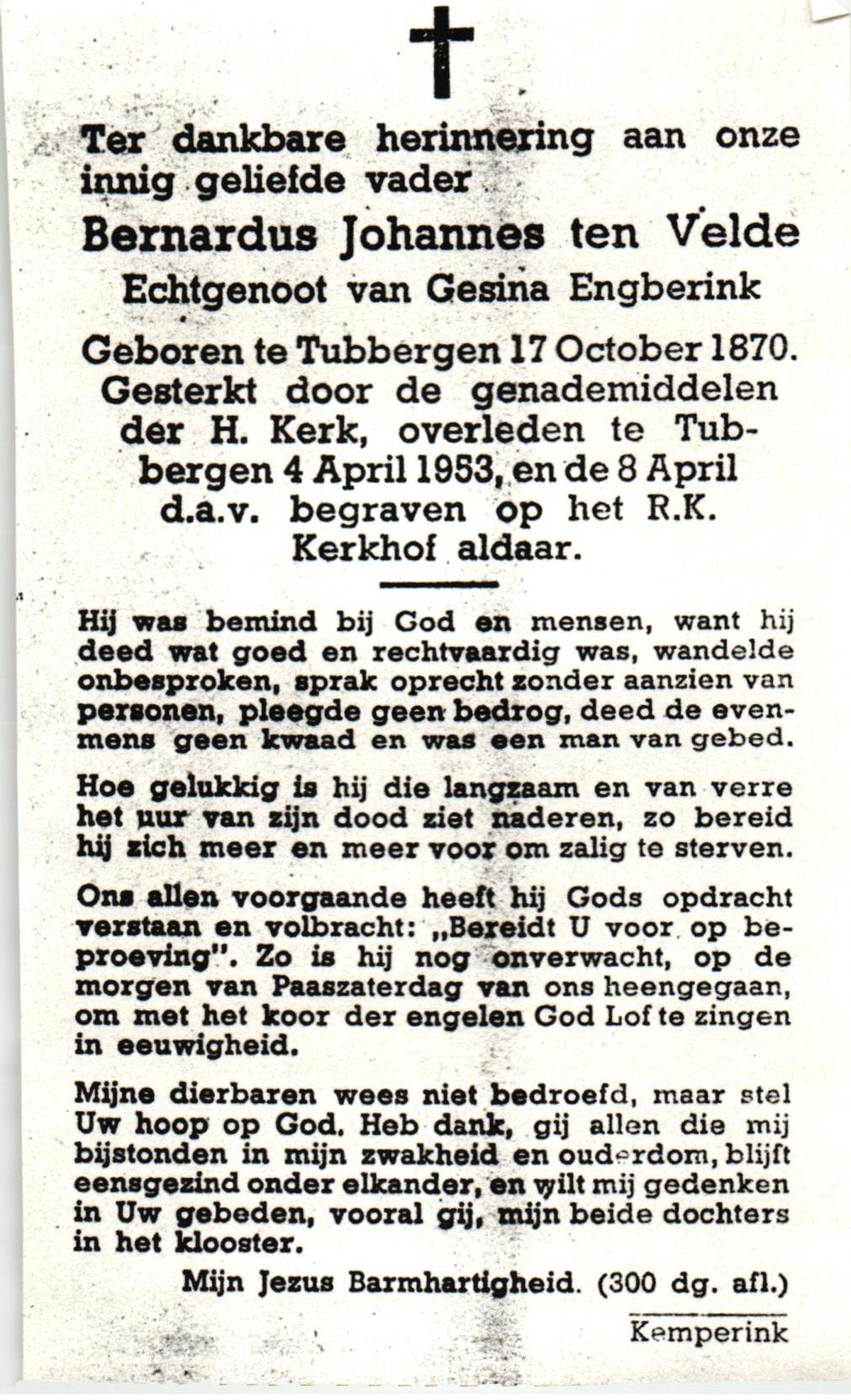 VELDE, ten, Bernardus Johannes, geboren op 17-10-1870 te Tubbergen, overleden op 4-4-1953 te Tubbergen, begraven op 8-4-1953 te Tubbergen.