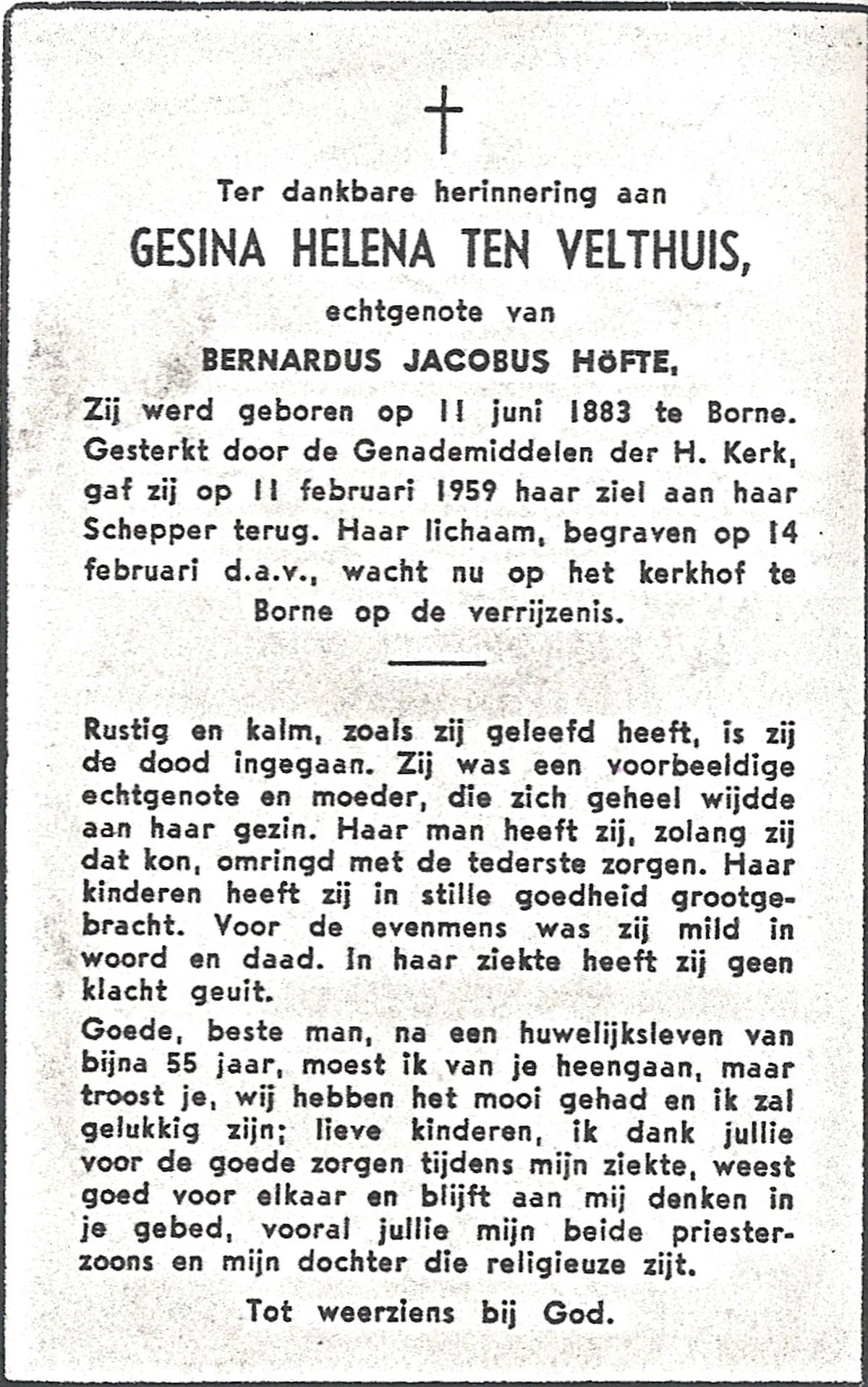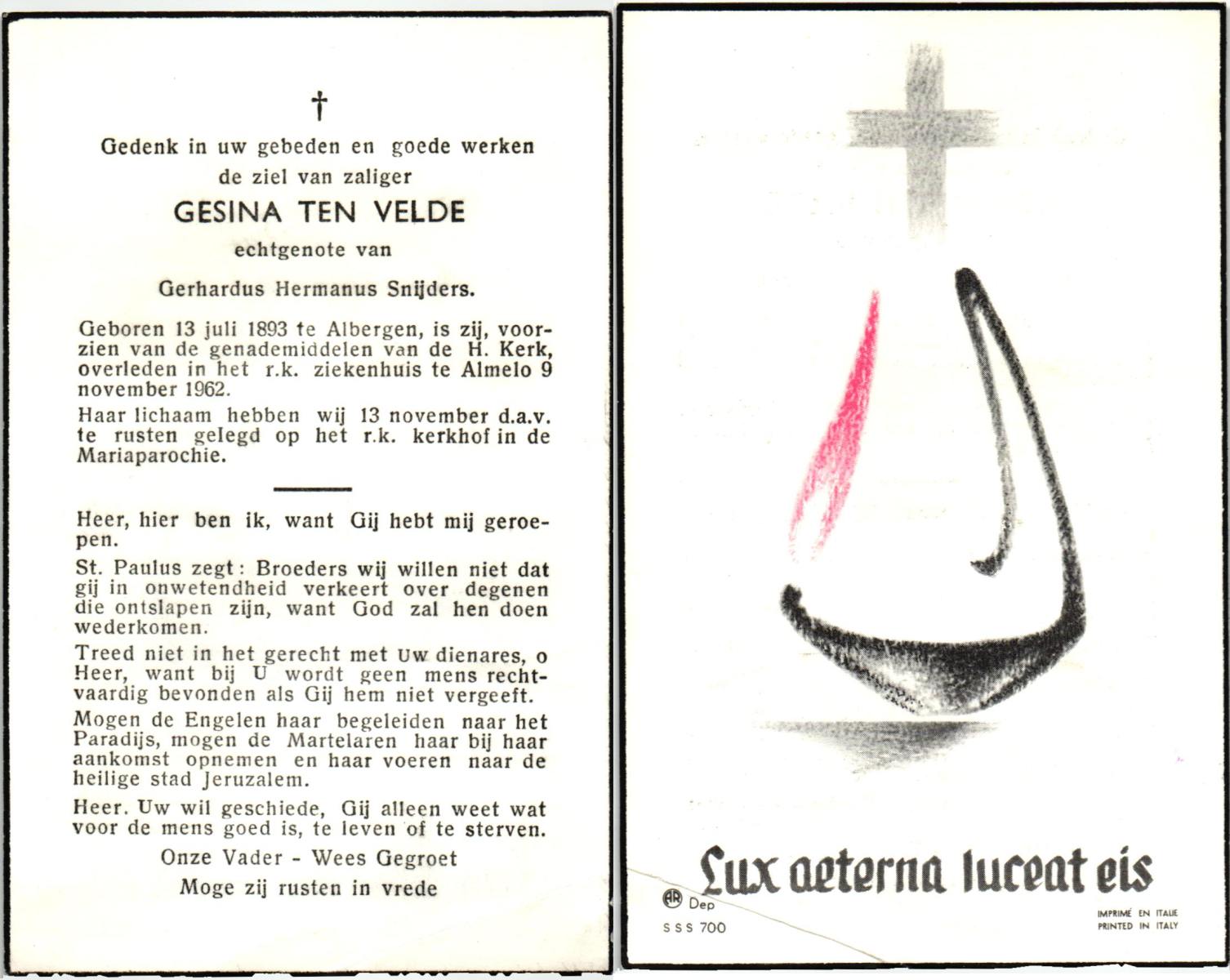 VELDE, ten, Gesina, geboren op 13-07-1893 te Albergen, overleden op 9-11-1962 te Almelo, ziekenhuis op 69-jarige leeftijd, begraven op 13-11-1962 te Mariaparochie.