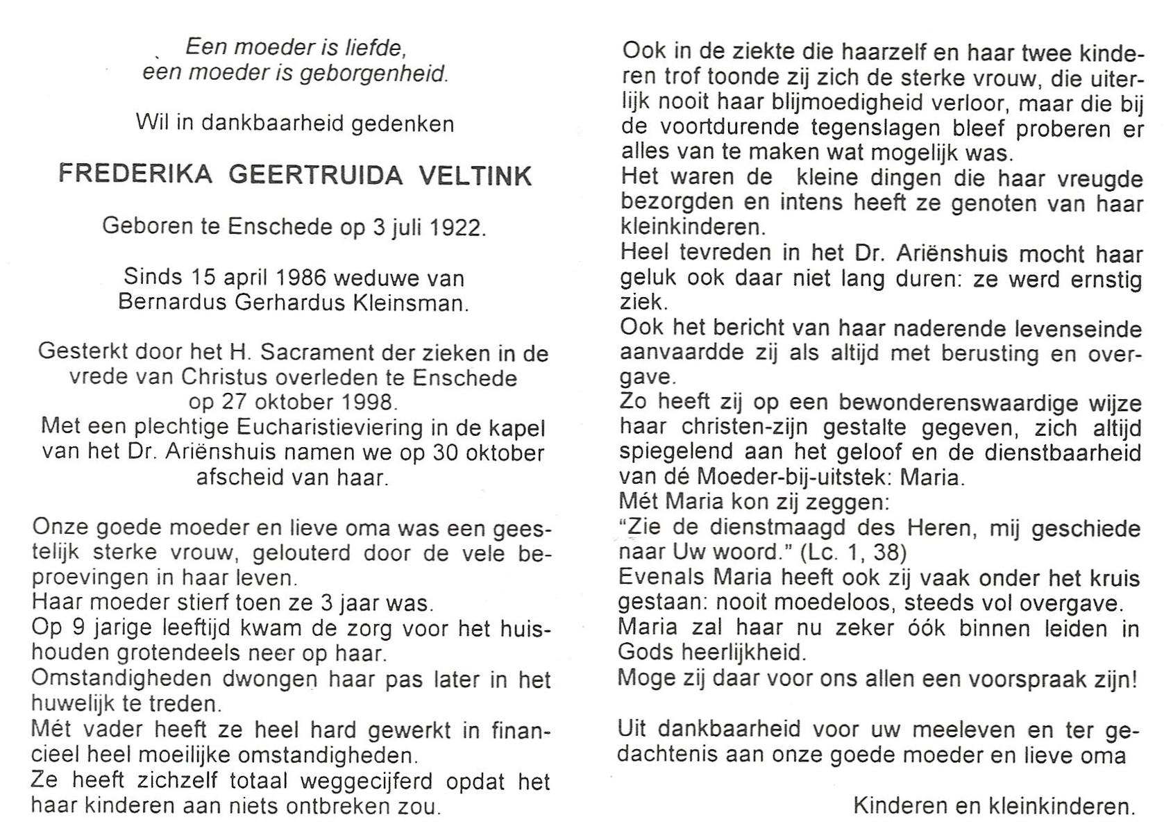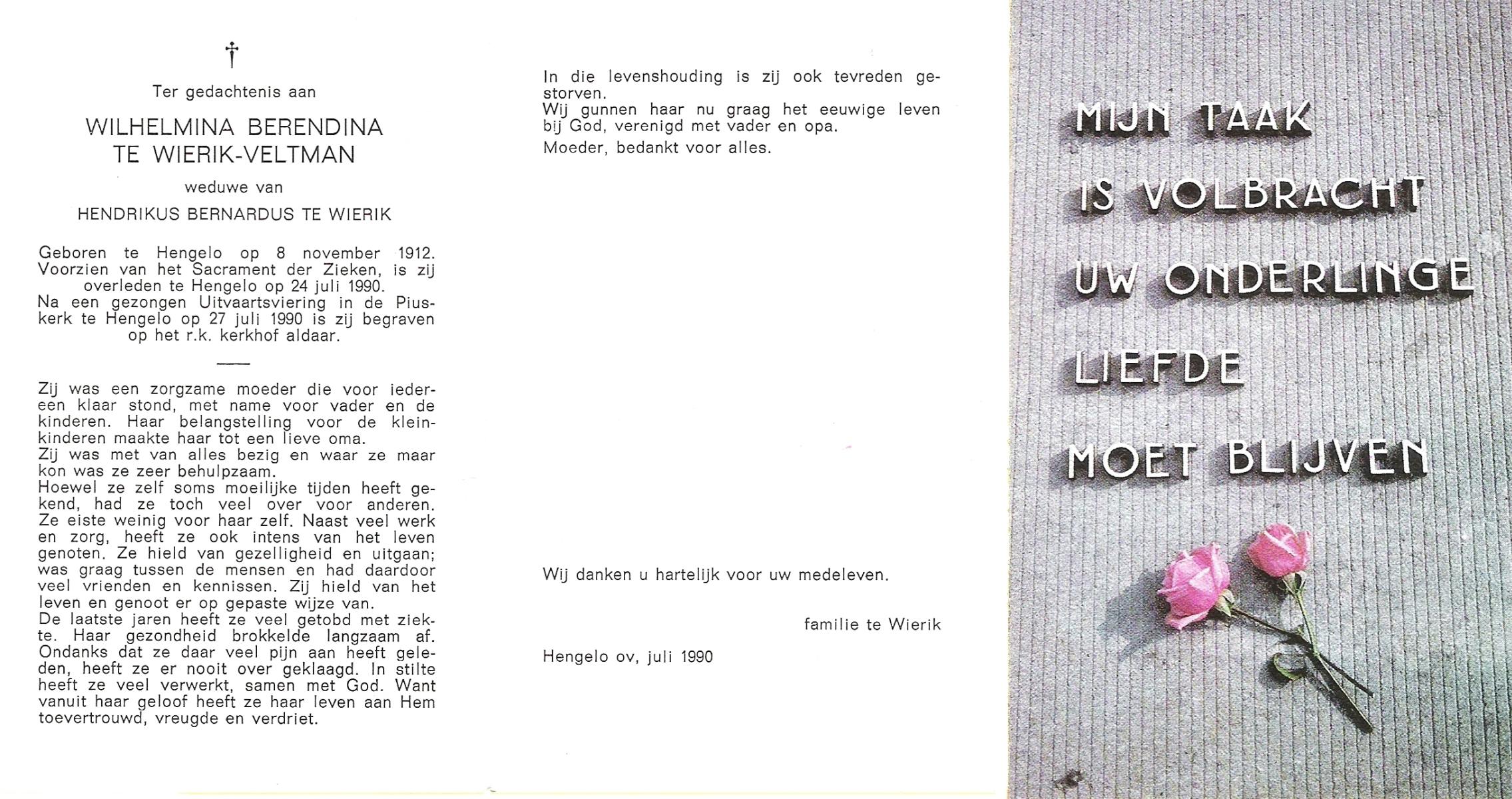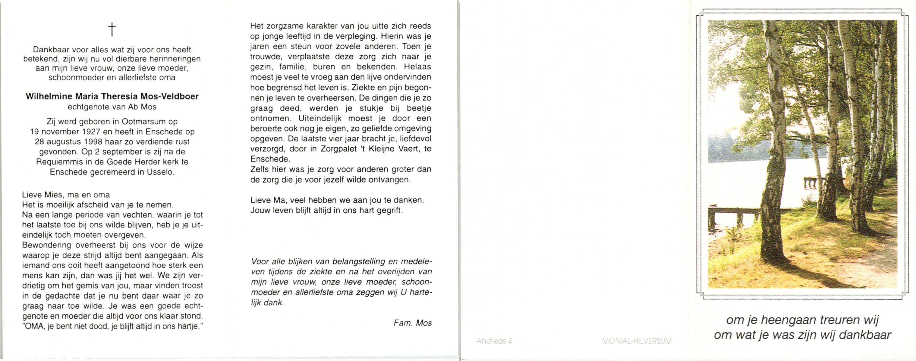 VELDBOER, , Wilhelmine Maria Theresia, geboren op 19-11-1927 te Ootmarsum, overleden op 28-8-1998 te Enschede op 70-jarige leeftijd, gecremeerd op 2-9-1998 te Usselo.