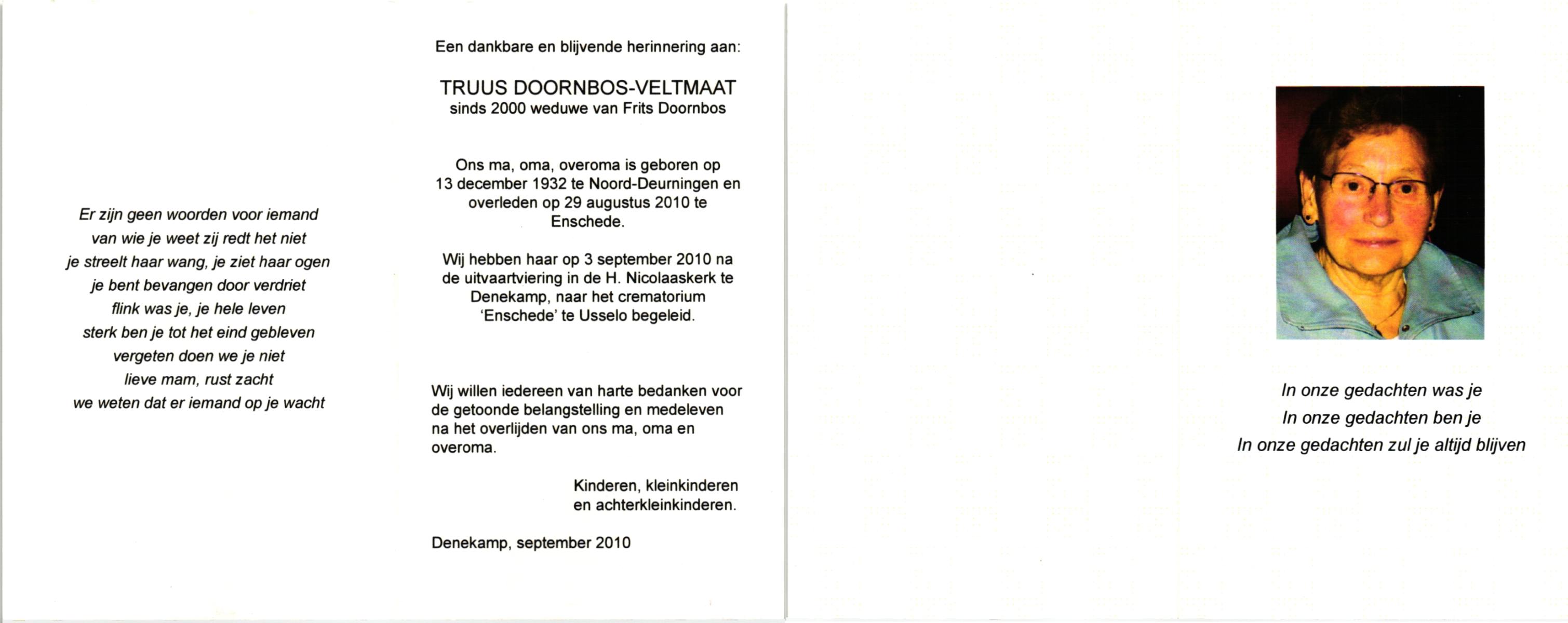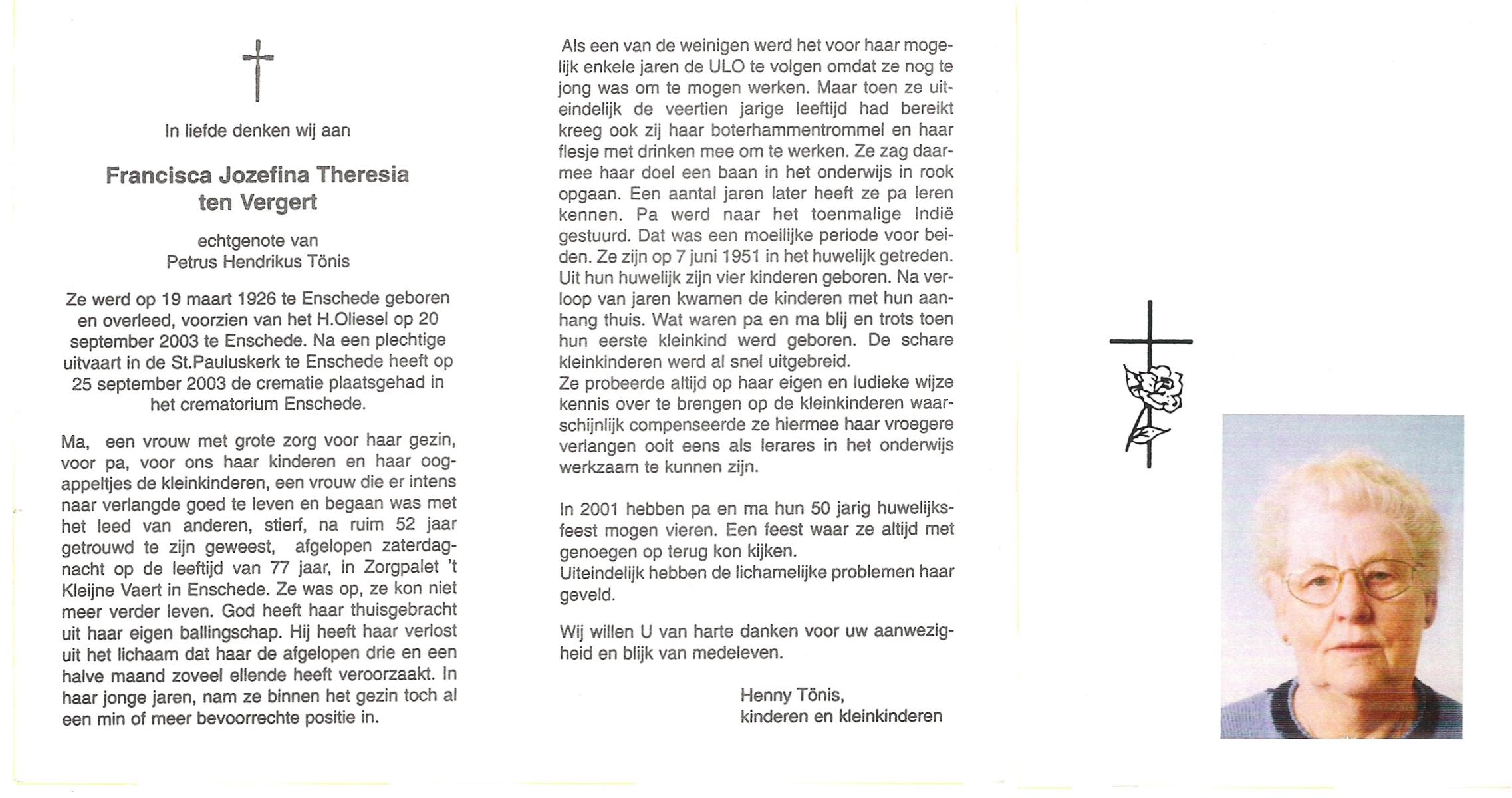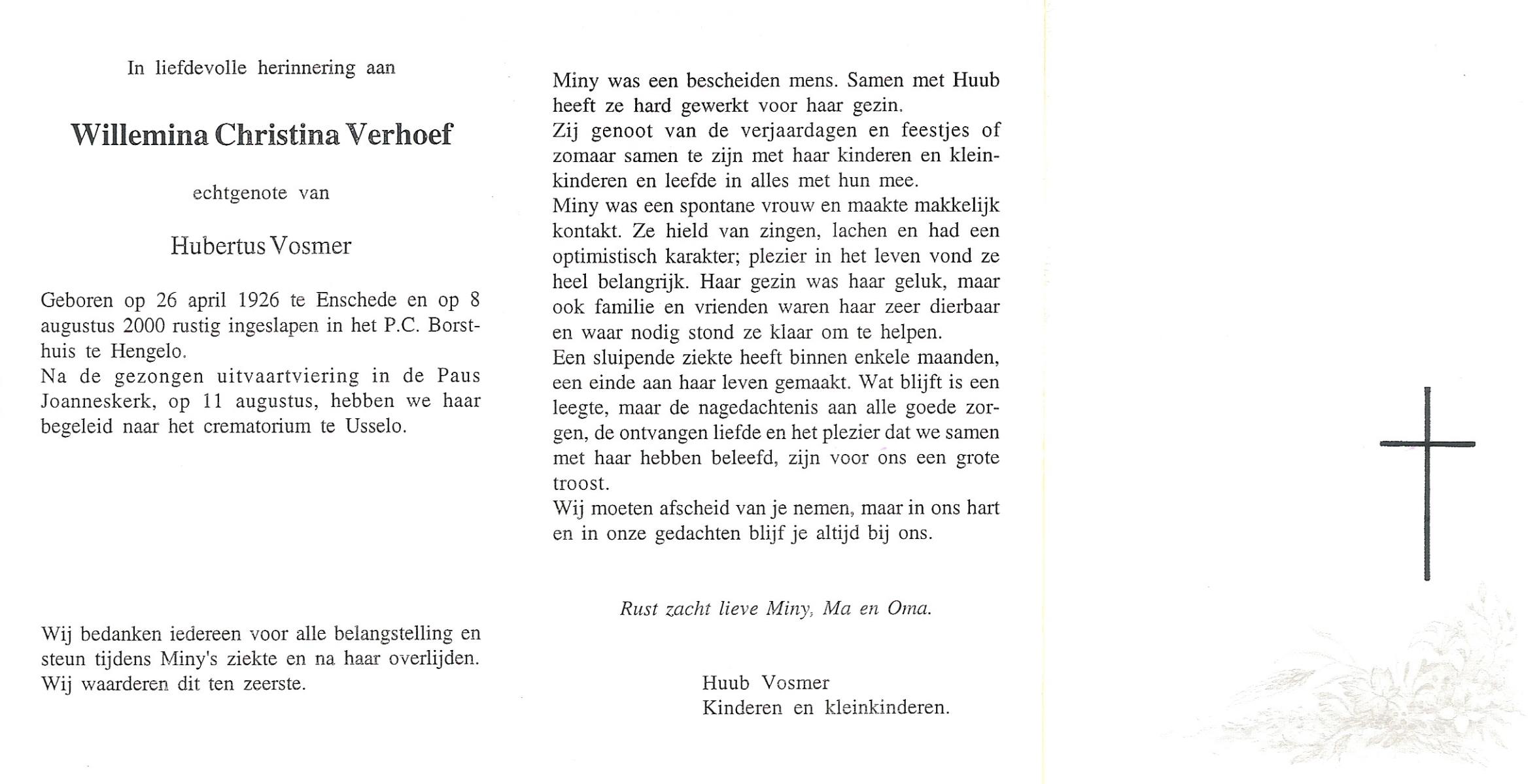 VELDBOER, , Wilhelmine Maria Theresia, geboren op 19-11-1927 te Ootmarsum, overleden op 28-8-1998 te Enschede op 70-jarige leeftijd, gecremeerd op 2-9-1998 te Usselo.
