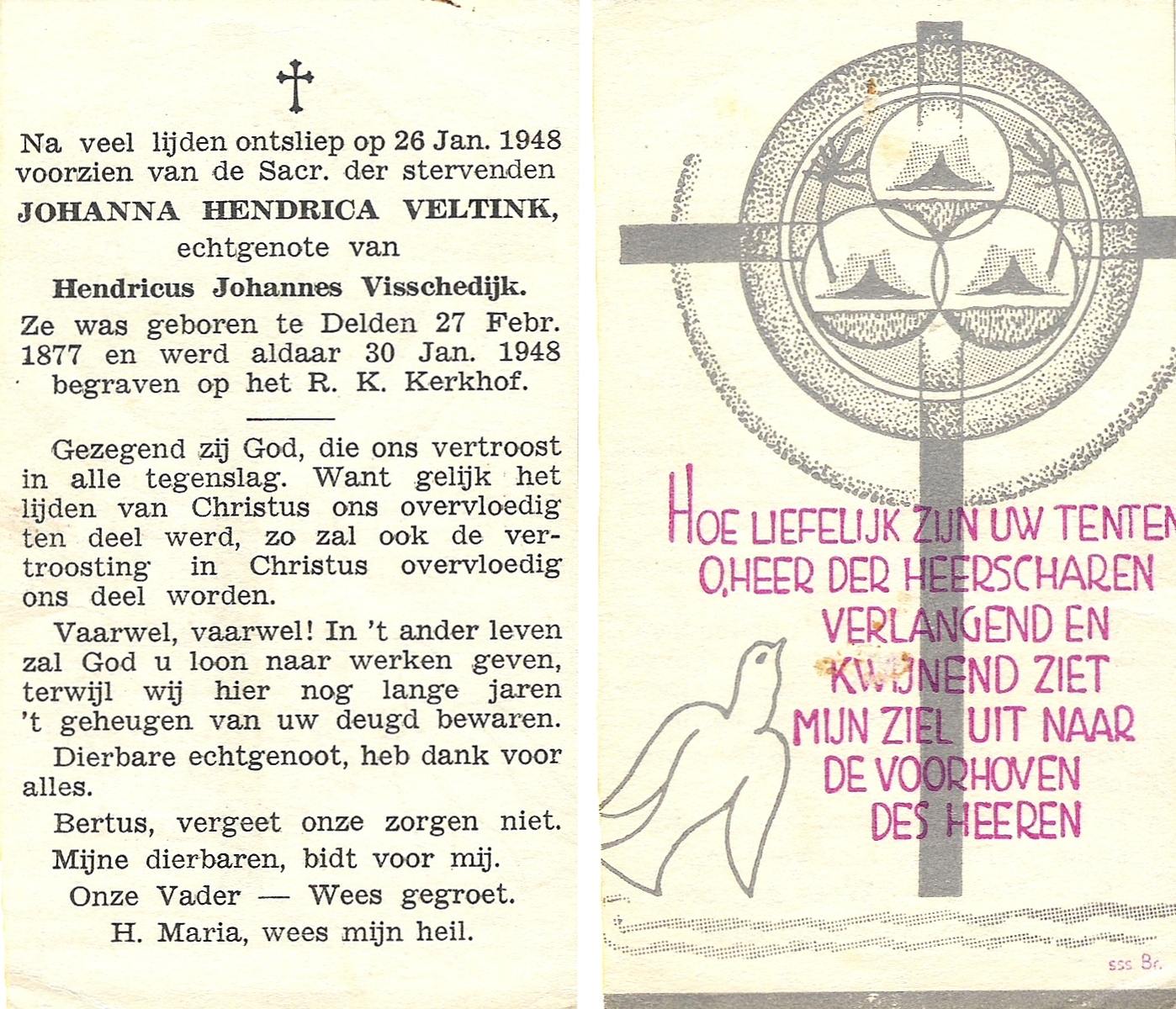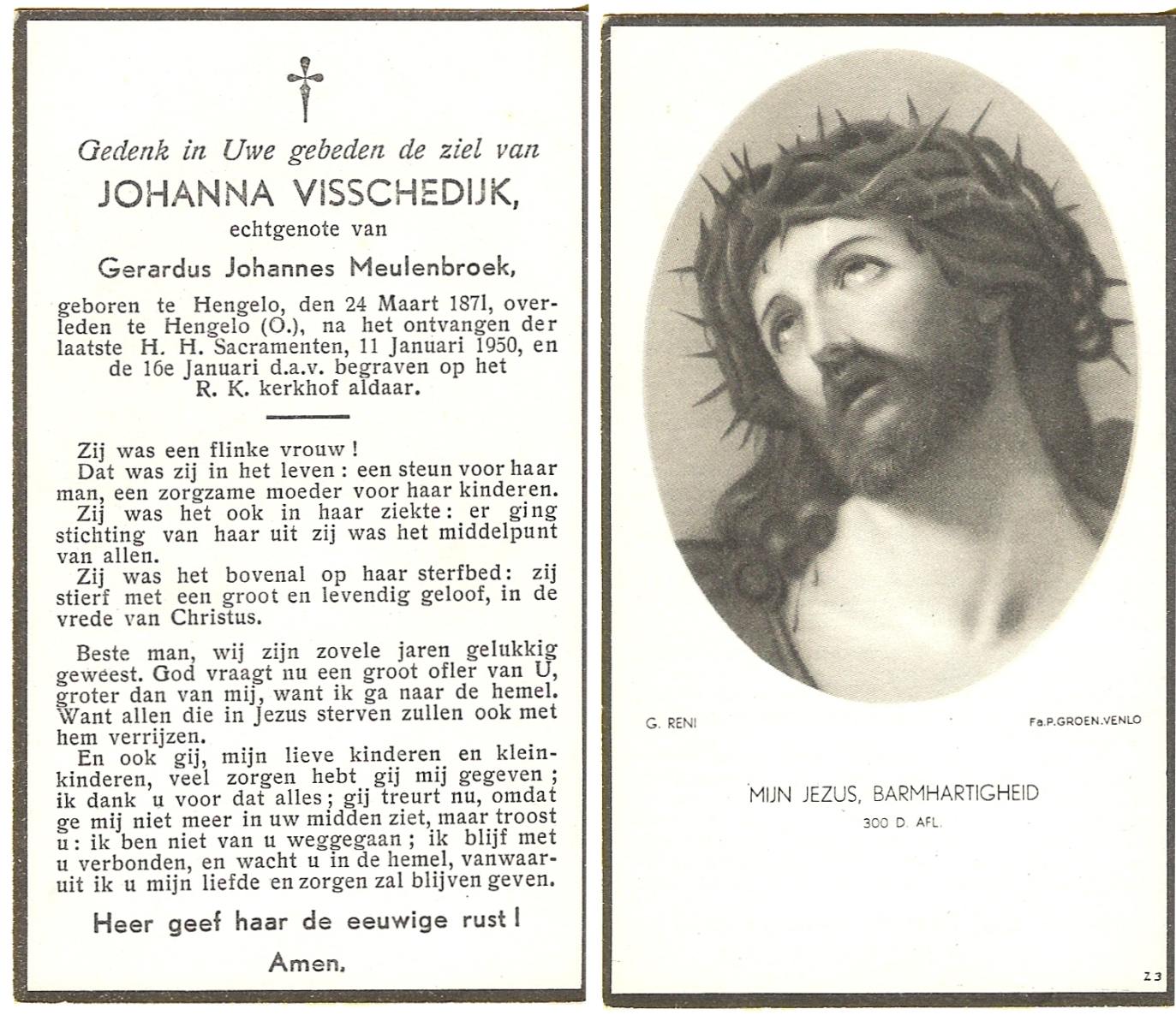 VISSCHEDIJK, Johanna, geboren op 24-03-1871 te Hengelo (O), overleden op 11-1-1950 op 78-jarige leeftijd, begraven op 16-1-1950 te Hengelo (Ov.).