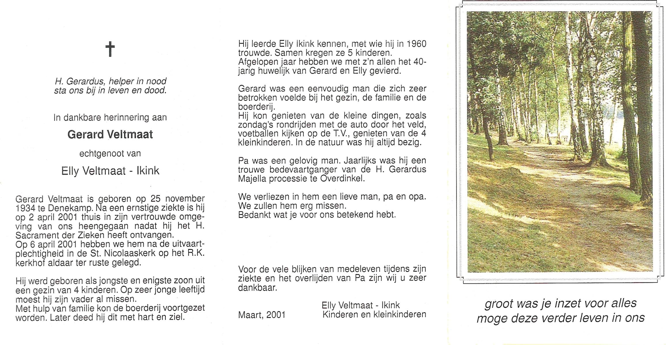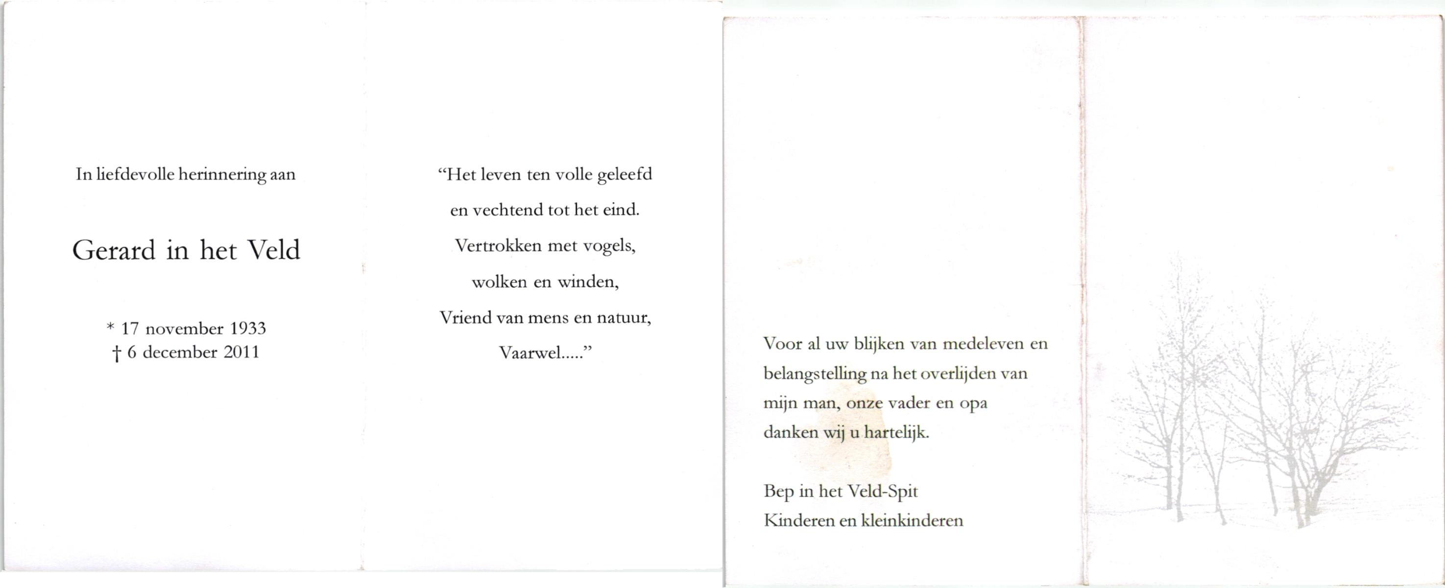 VELD, in het, Gerard, geboren op 17-11-1933, overleden op 6-12-2011 op 78-jarige leeftijd.