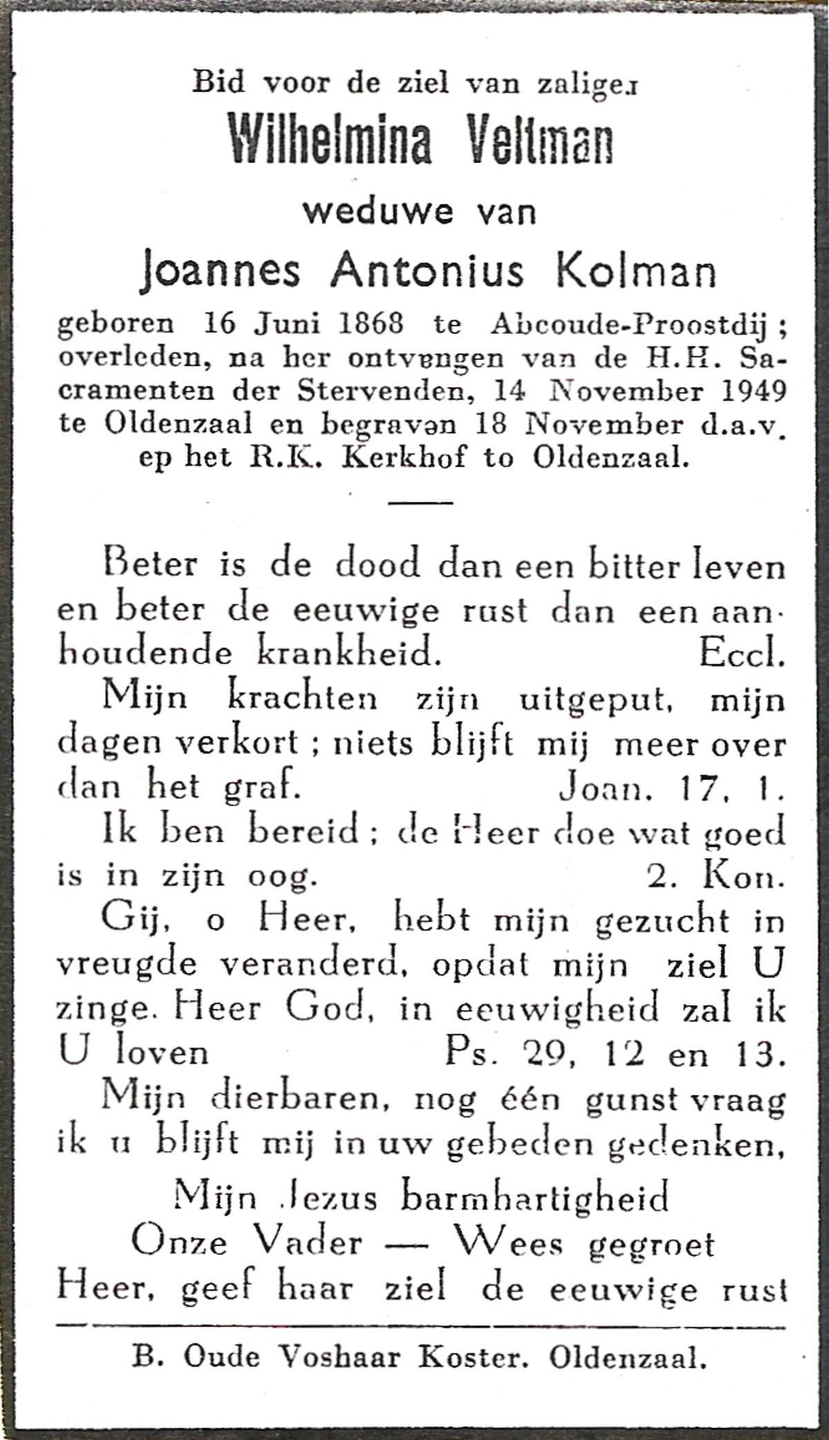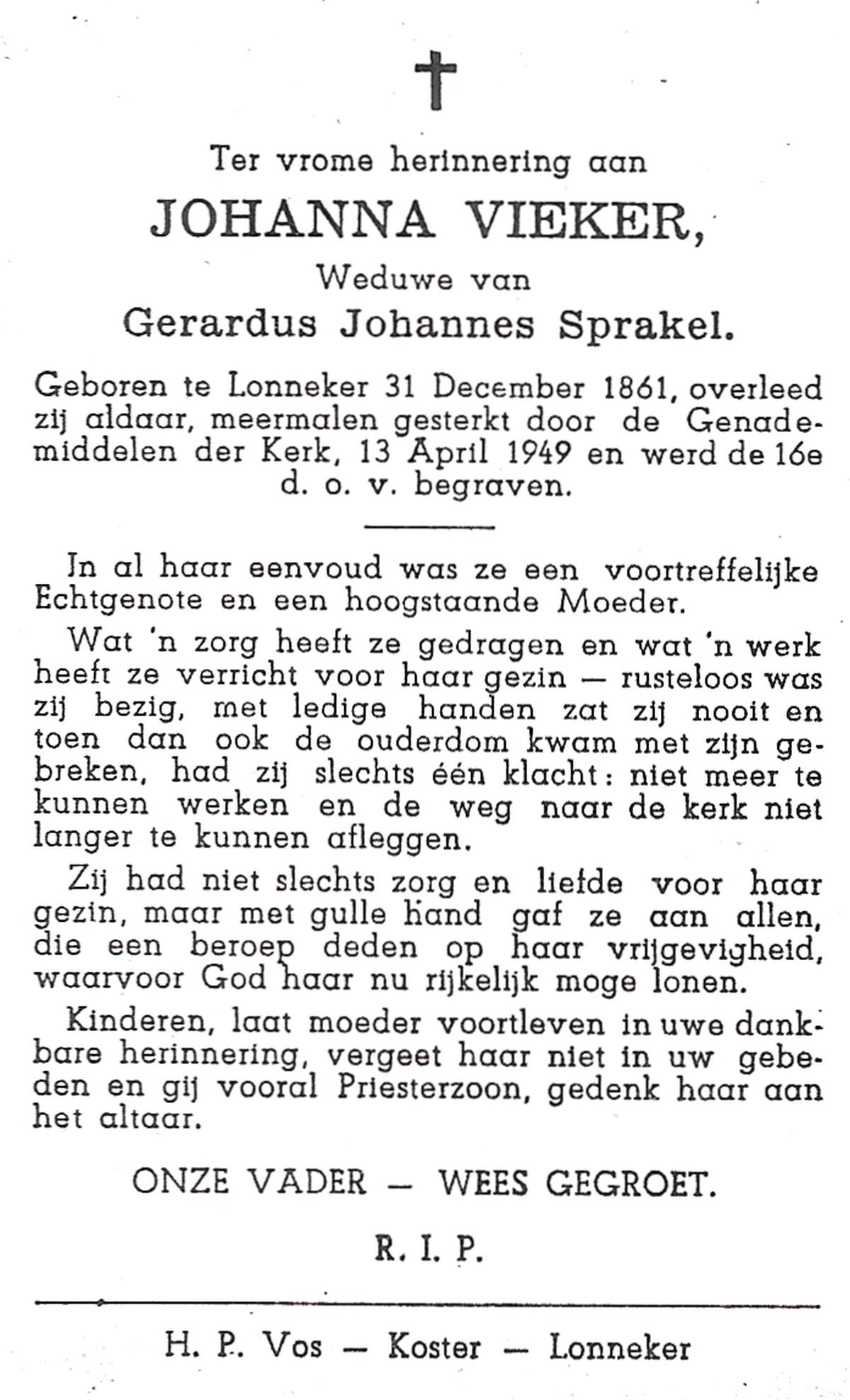 VIEKER, Johanna, geboren op 31-12-1861 te Lonneker, overleden op 13-4-1949 te Lonneker op 87-jarige leeftijd, begraven op 16-4-1949.