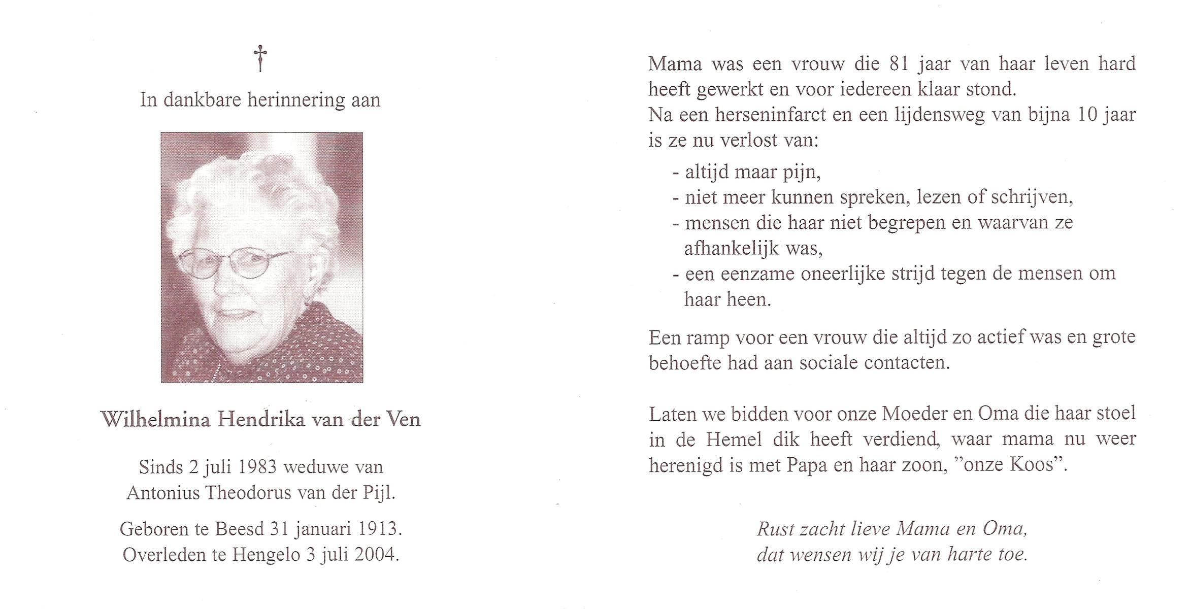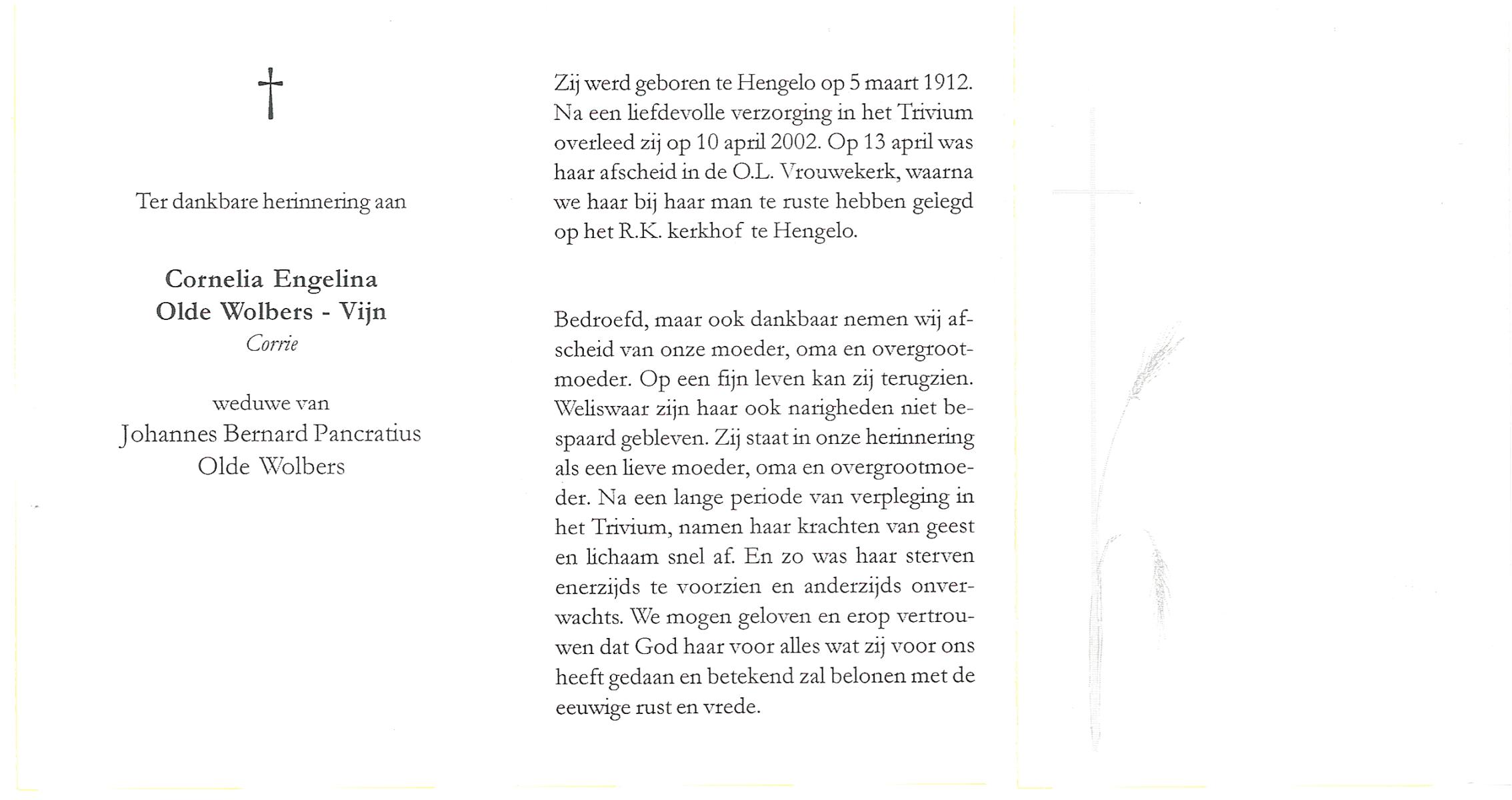 VIJN, Cornelia Engelina (Corrie), geboren op 5-3-1912 te Hengelo (O), overleden op 10-4-2002 op 90-jarige leeftijd, begraven op 13-4-2002 te Hengelo (Ov.).