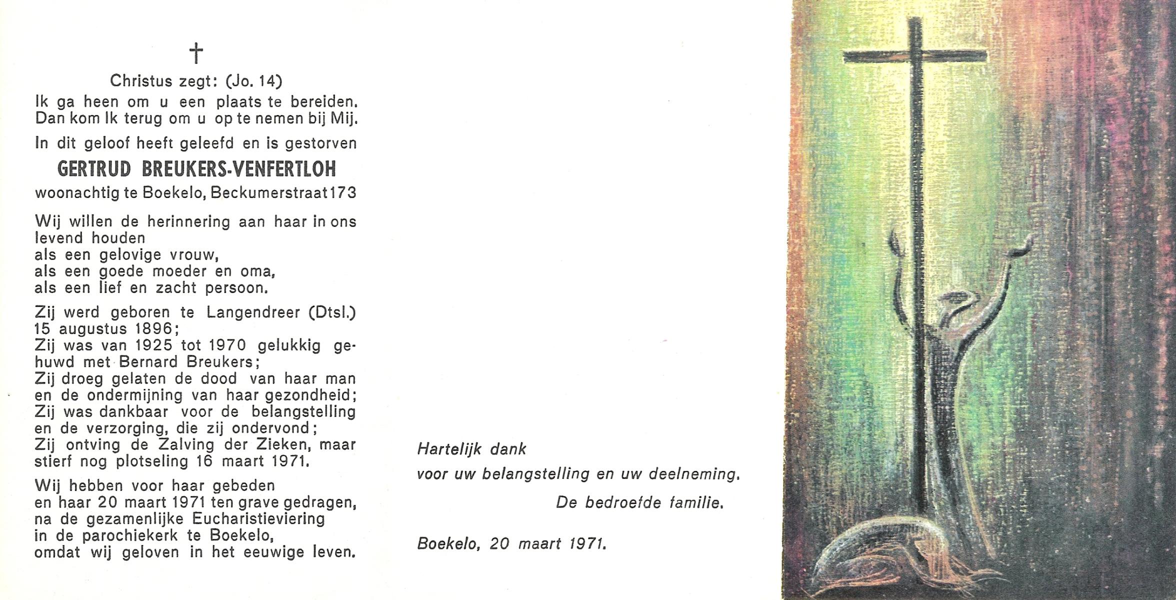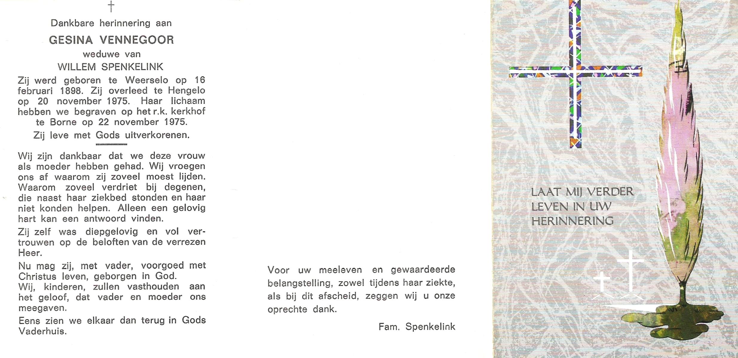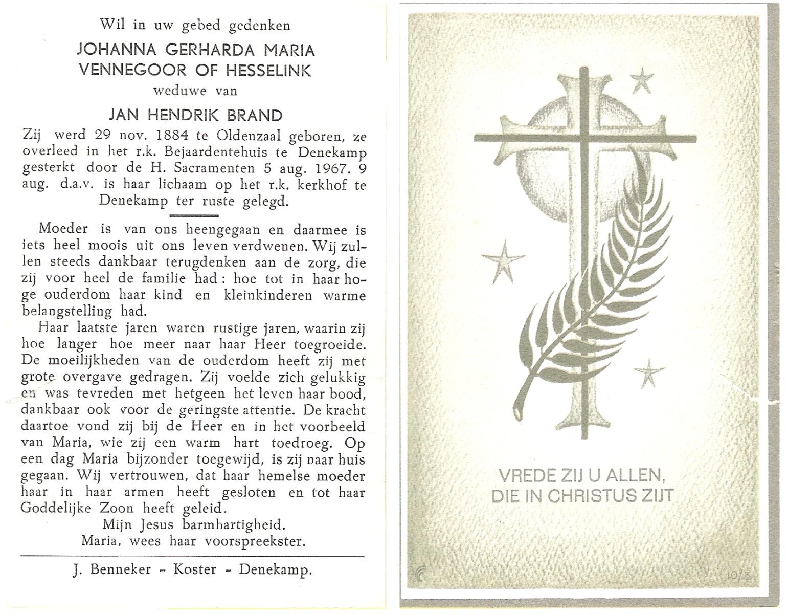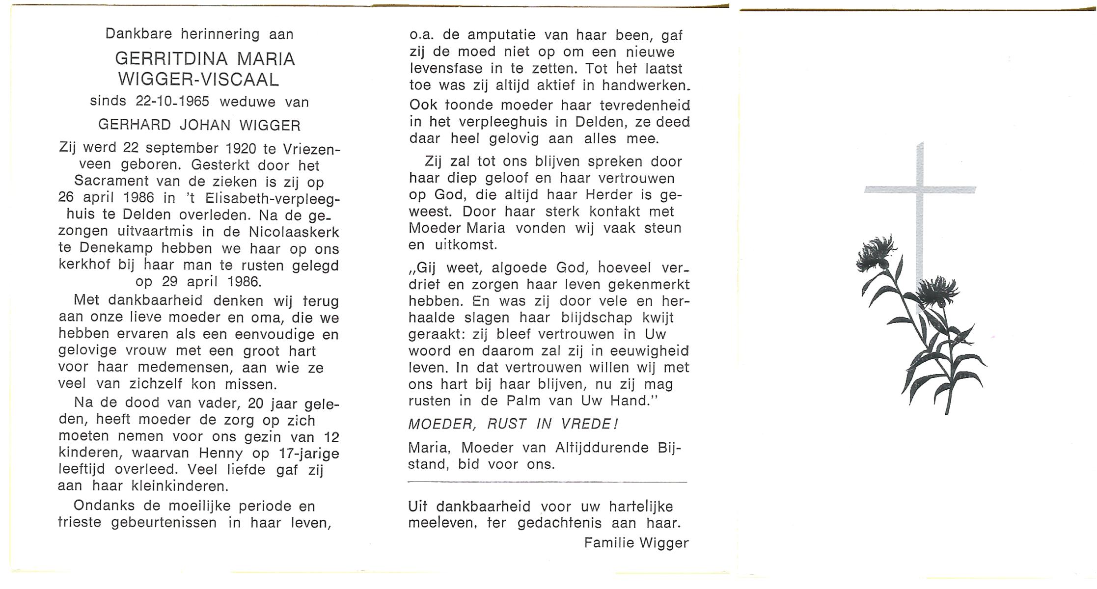 VISCAAL, Gerritdina Maria, geboren op 22-9-1920 te Vriezenveen, overleden op 26-4-1986 te Delden op 65-jarige leeftijd, begraven op 29-4-1986.