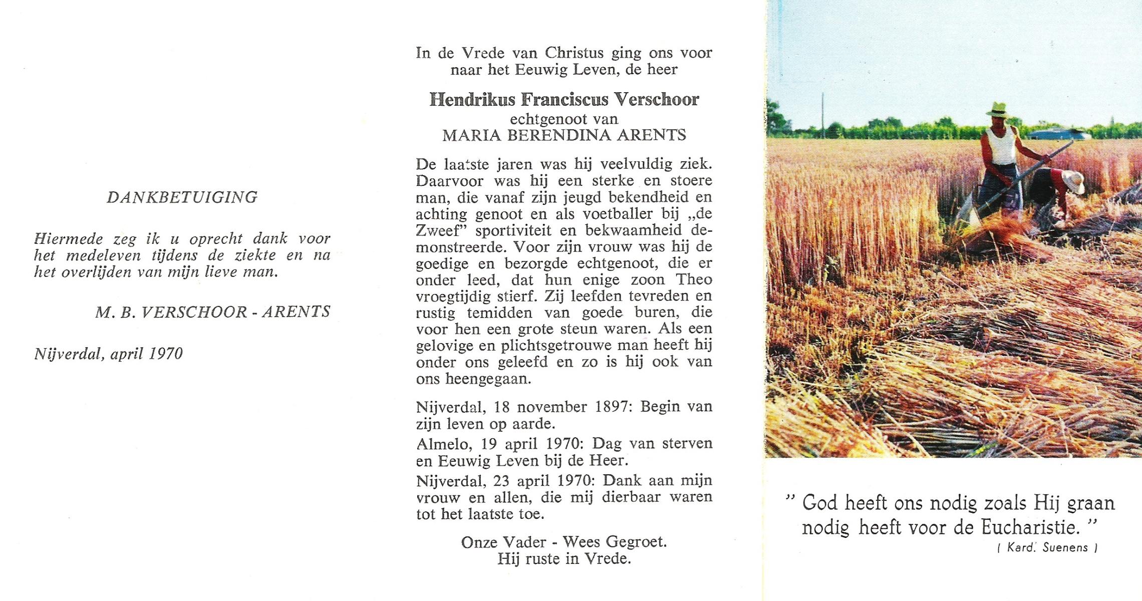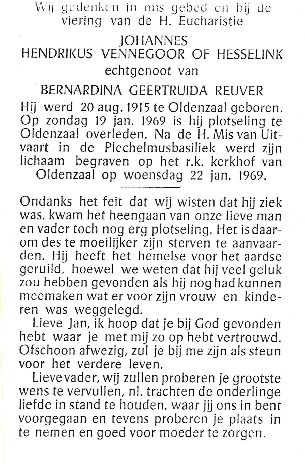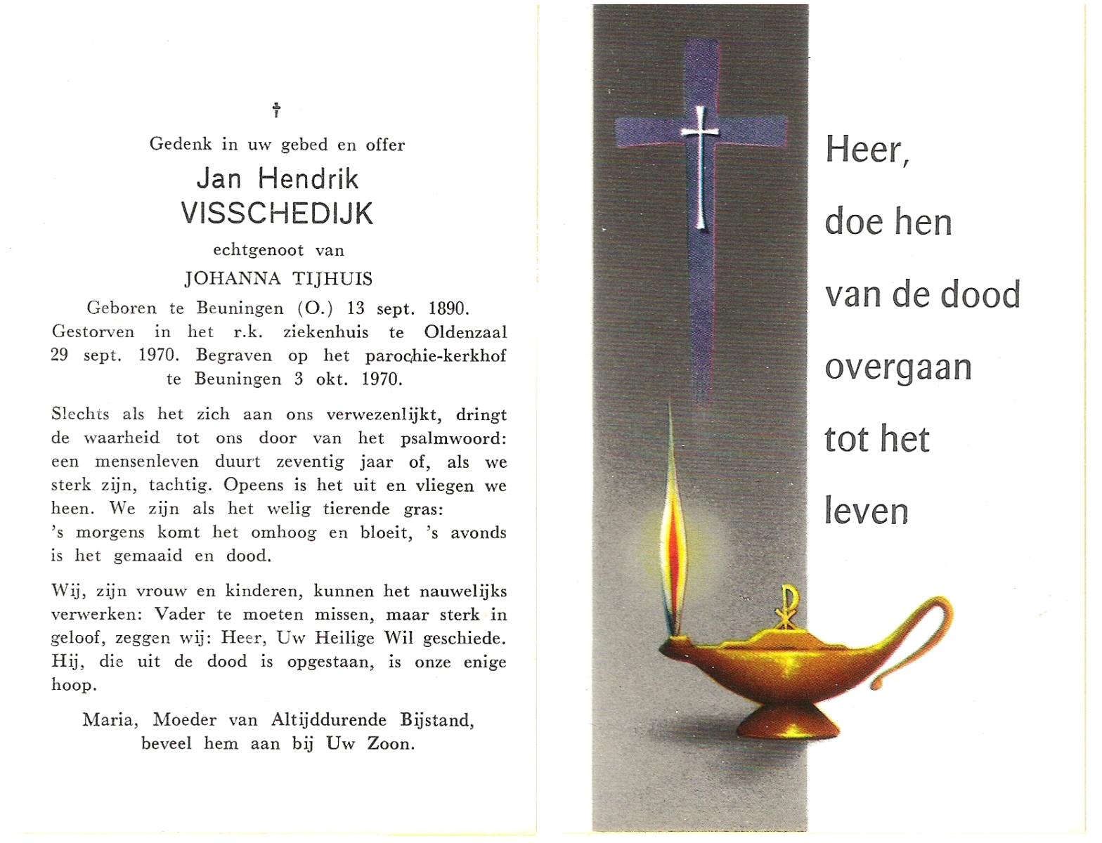 VISSCHEDIJK, Jan Hendrik, geboren op 13-09-1890 te Beuningen (Ov.), overleden op 29-9-1970 te Oldenzaal op 80-jarige leeftijd, begraven op 3-10-1970 te Beuningen R.K.kerkhof.