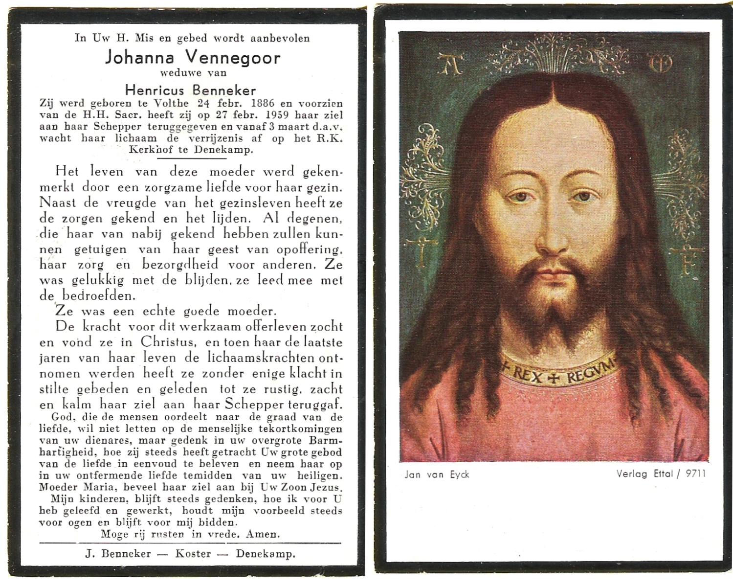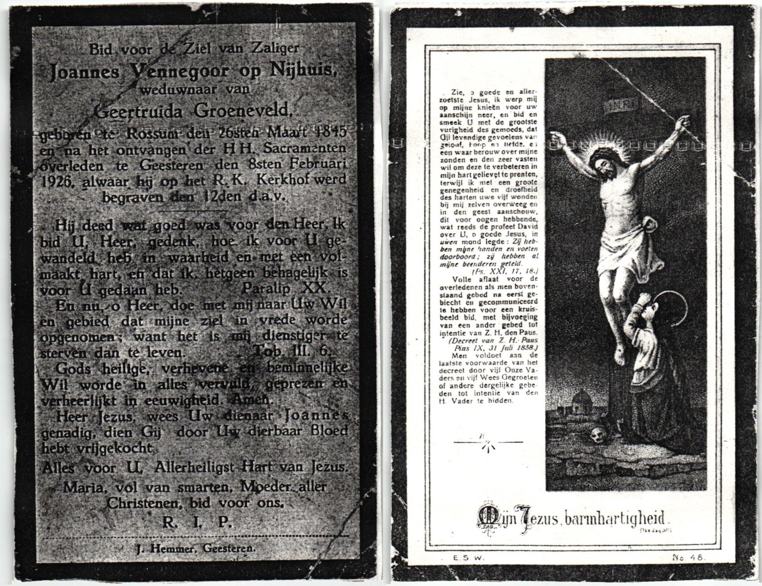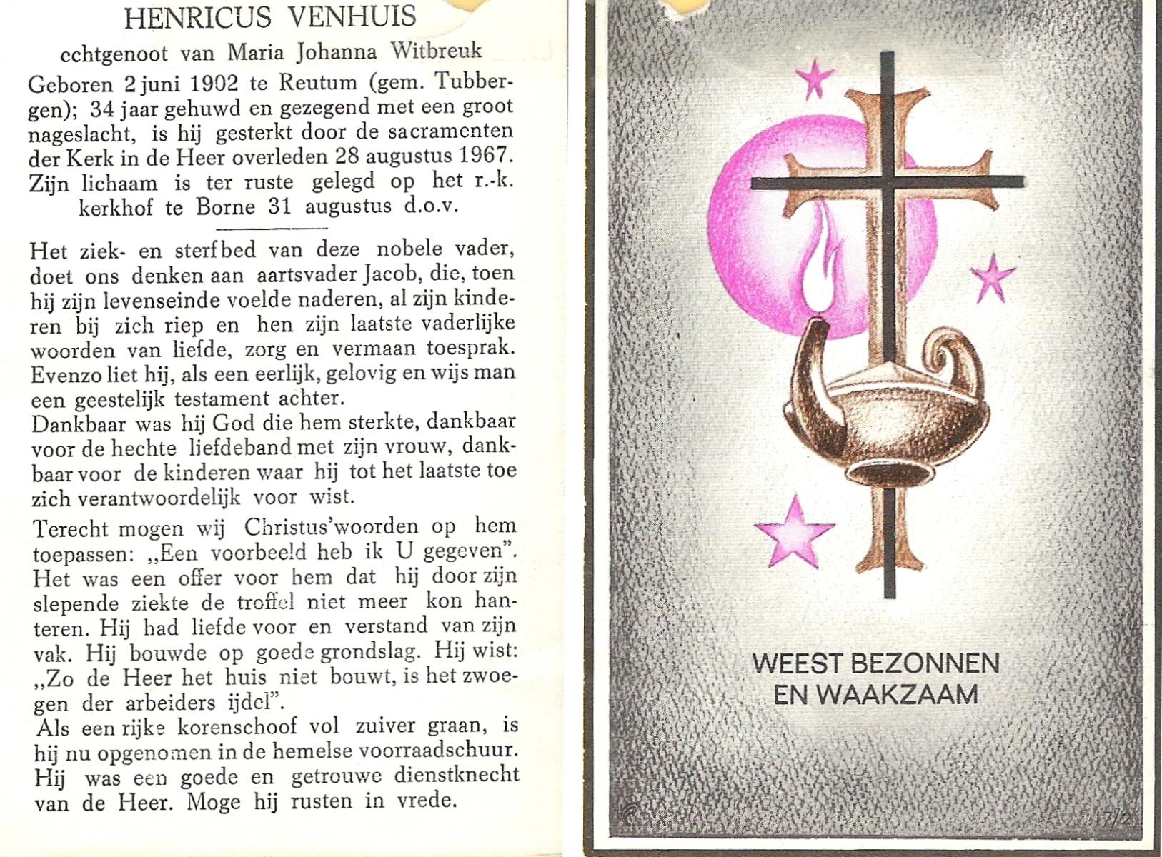 VISSCHEDIJK, Jan Hendrik, geboren op 13-09-1890 te Beuningen (Ov.), overleden op 29-9-1970 te Oldenzaal op 80-jarige leeftijd, begraven op 3-10-1970 te Beuningen R.K.kerkhof.