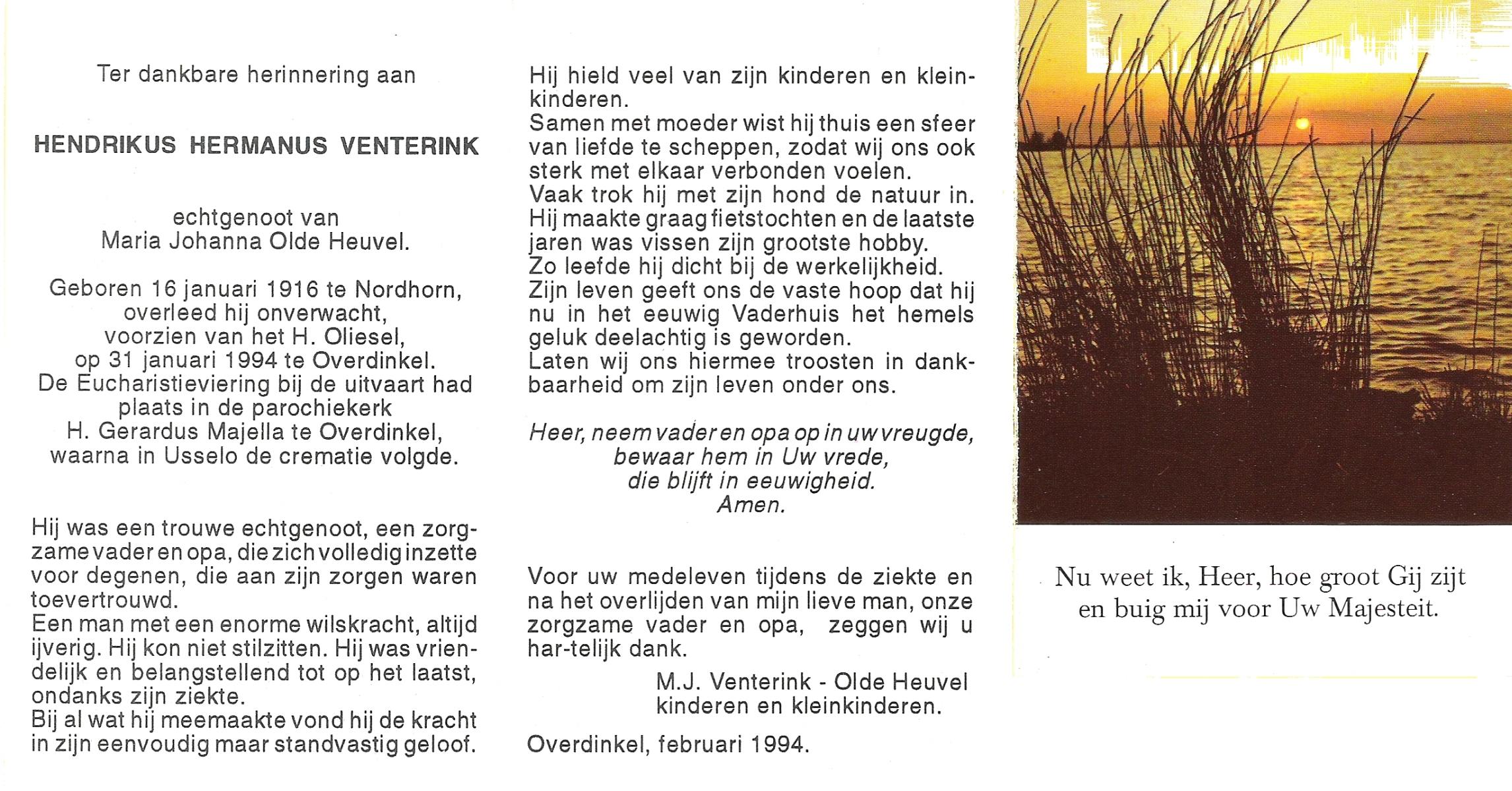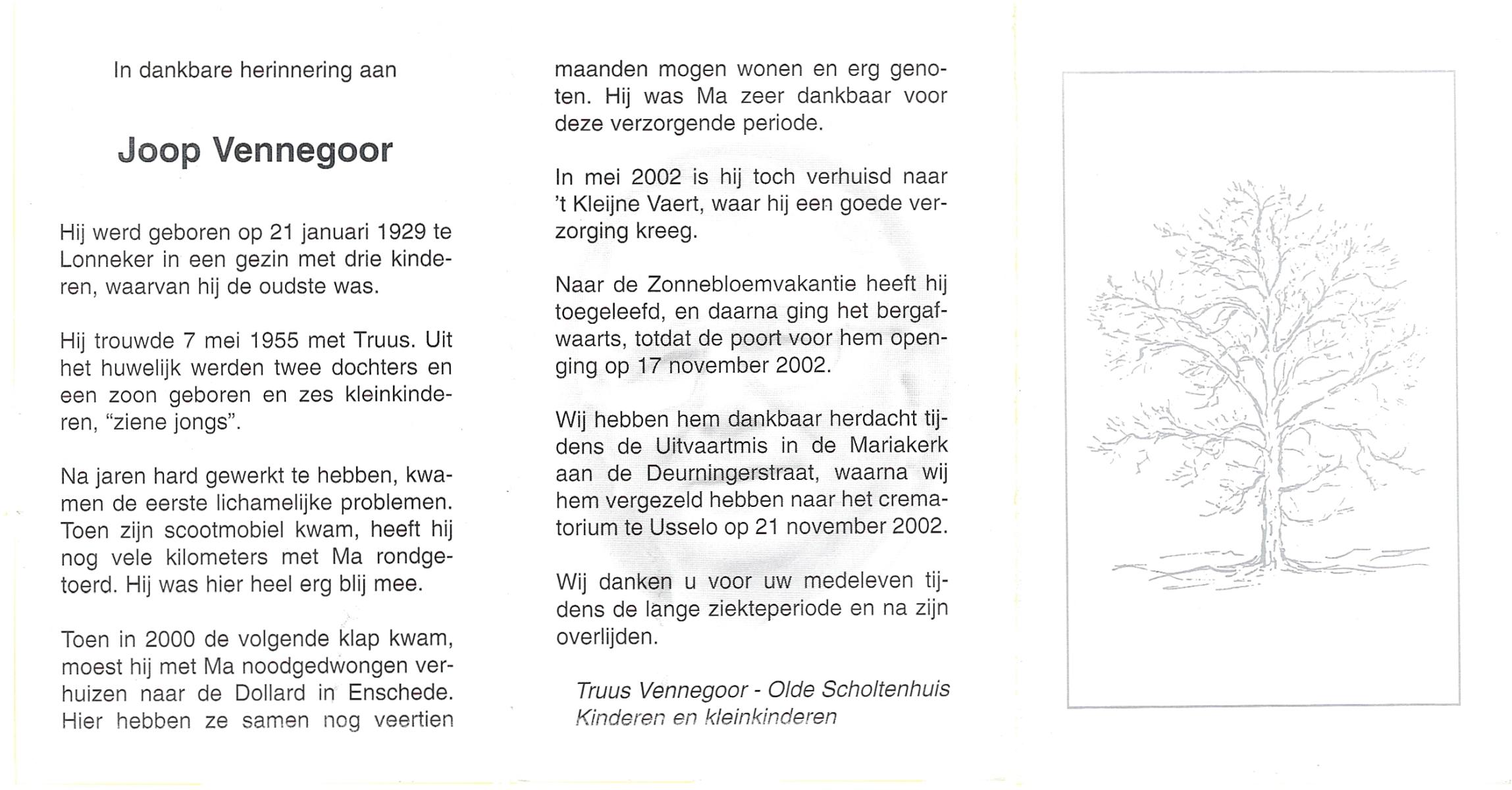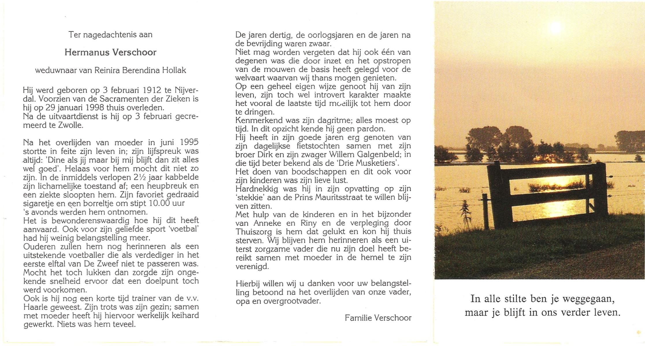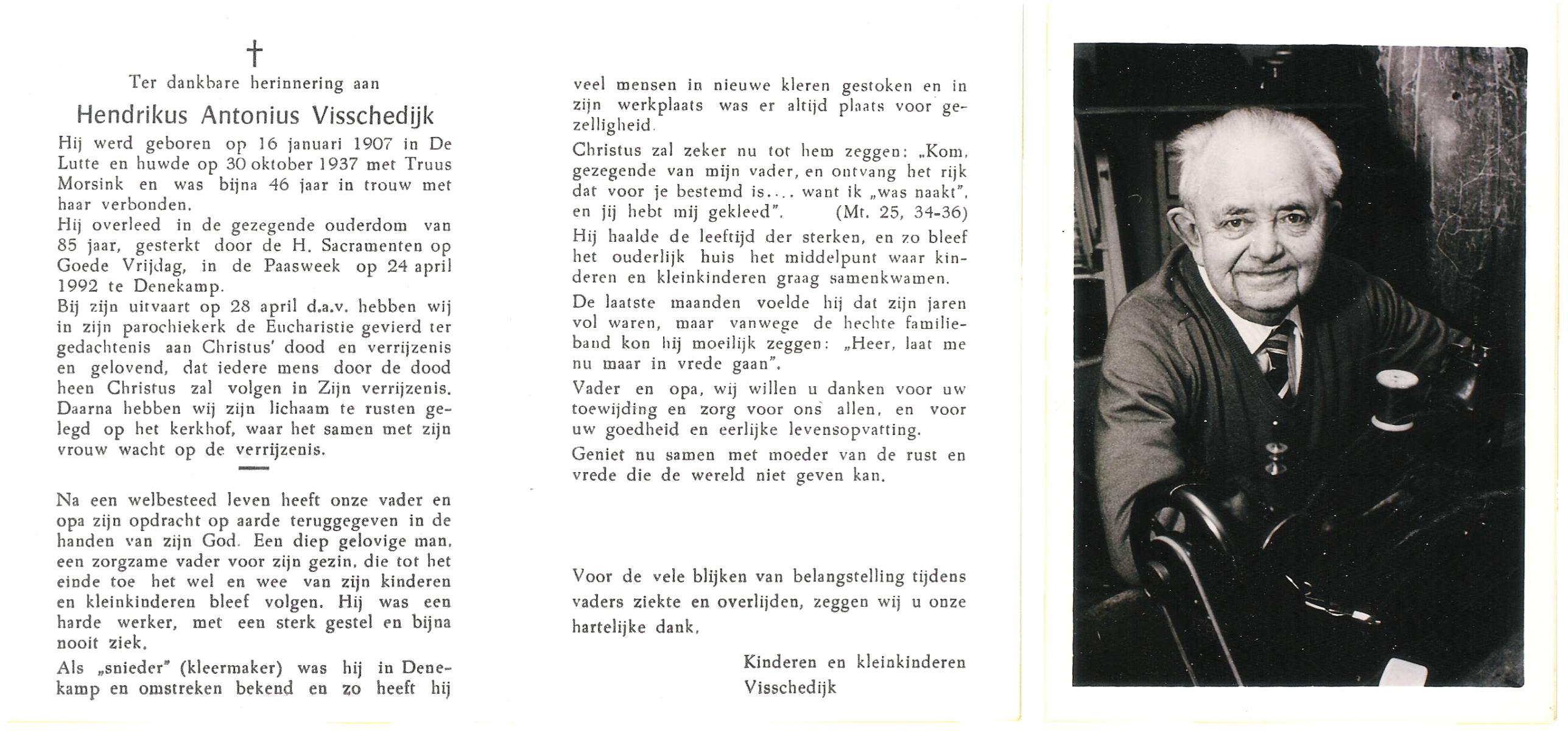 VISSCHEDIJK, Hendrikus Antonius, geboren op 16-1-1907 te De Lutte, overleden op 24-4-1992 te Denekamp op 85-jarige leeftijd, begraven op 28-4-1992 te Denekamp.