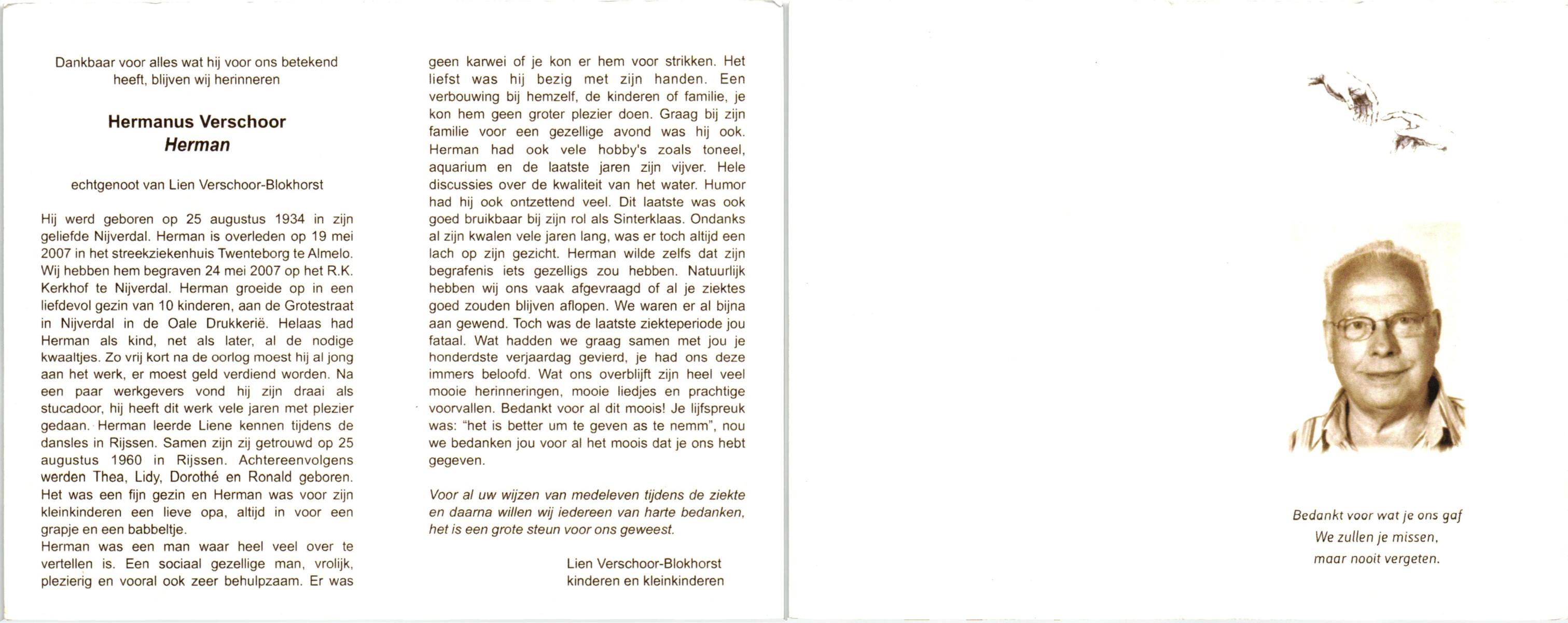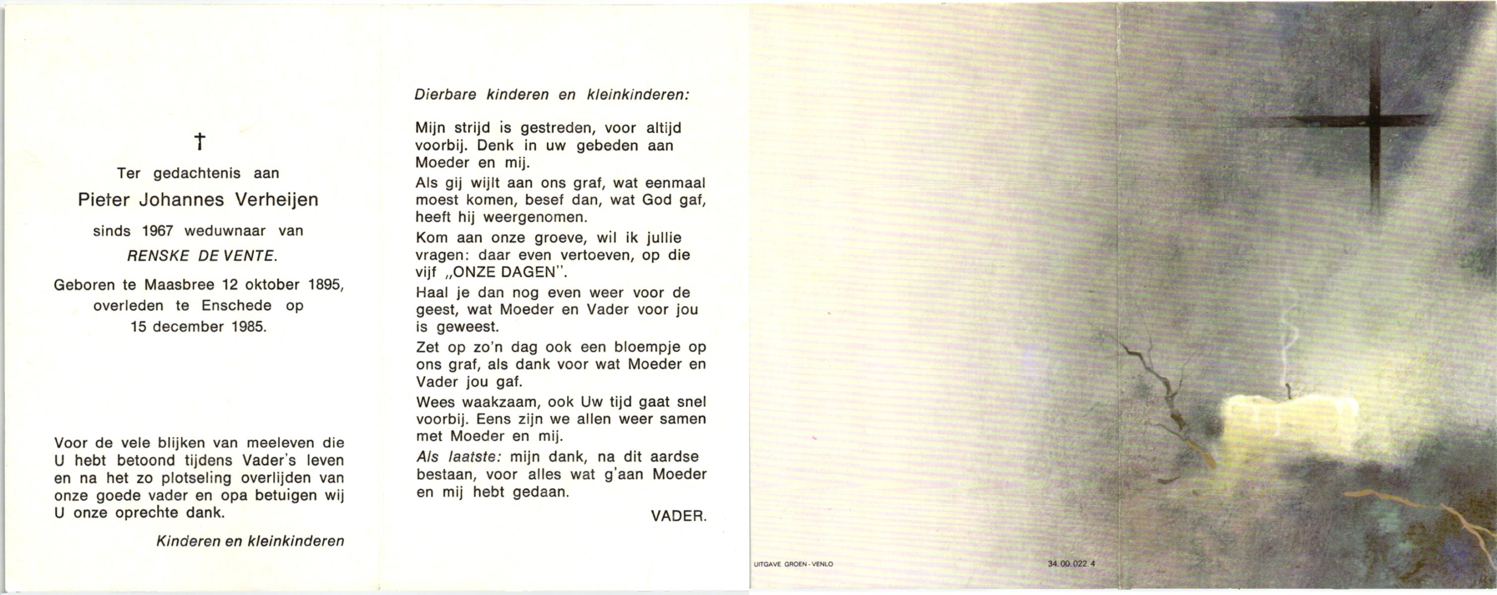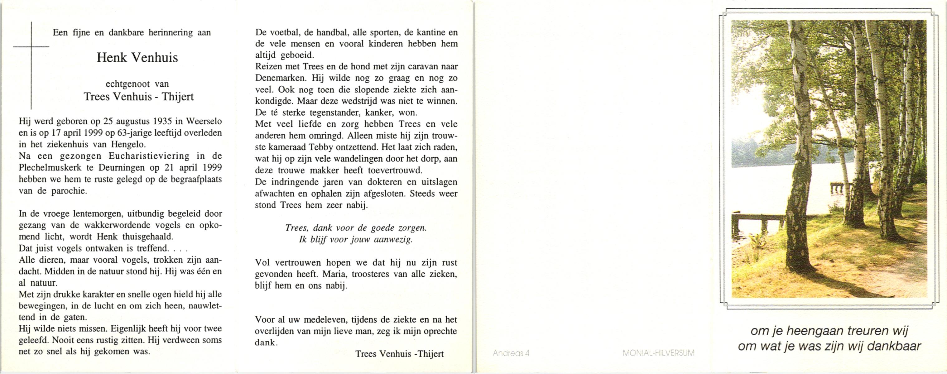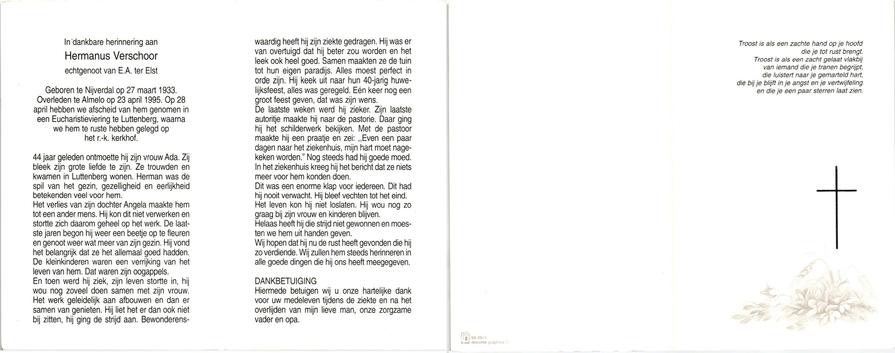 VISSCHEDIJK, Hendrikus Antonius, geboren op 16-1-1907 te De Lutte, overleden op 24-4-1992 te Denekamp op 85-jarige leeftijd, begraven op 28-4-1992 te Denekamp.