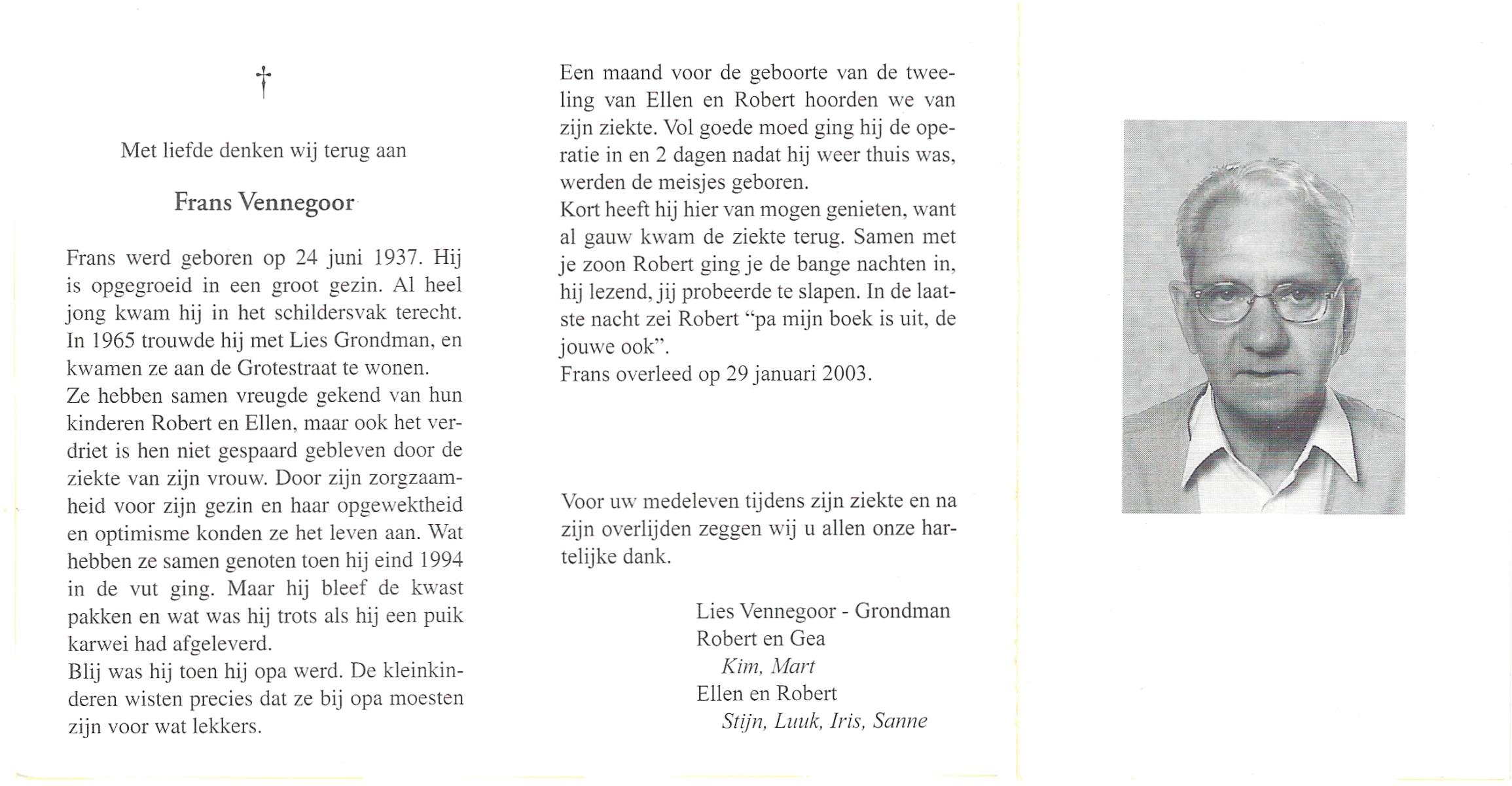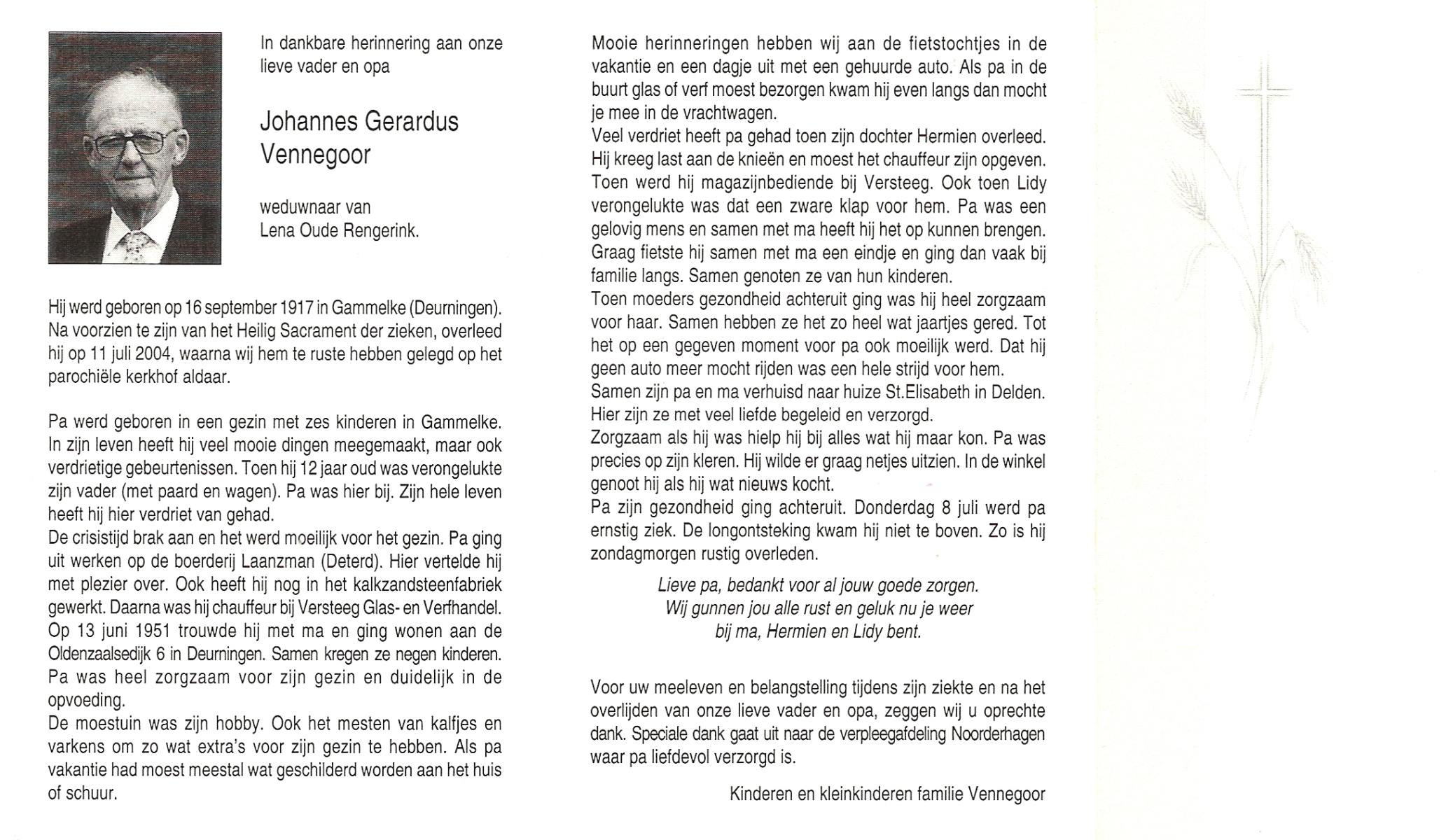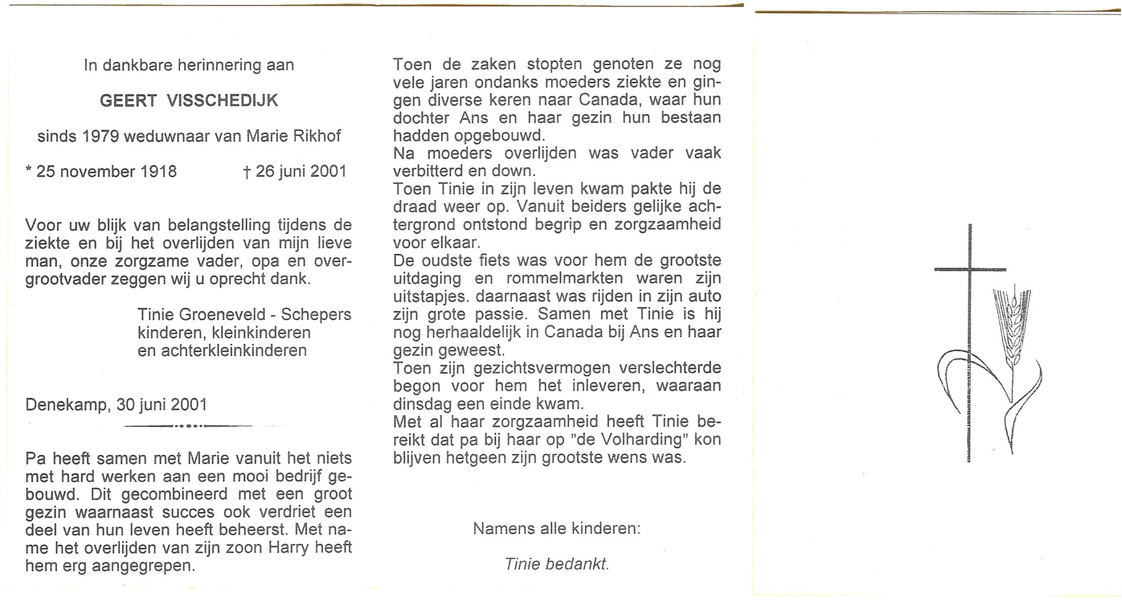 VISSCHEDIJK, Geert, geboren op 25-11-1918, overleden op 26-6-2001 op 82-jarige leeftijd, begraven op 30-6-2001 te Denekamp.