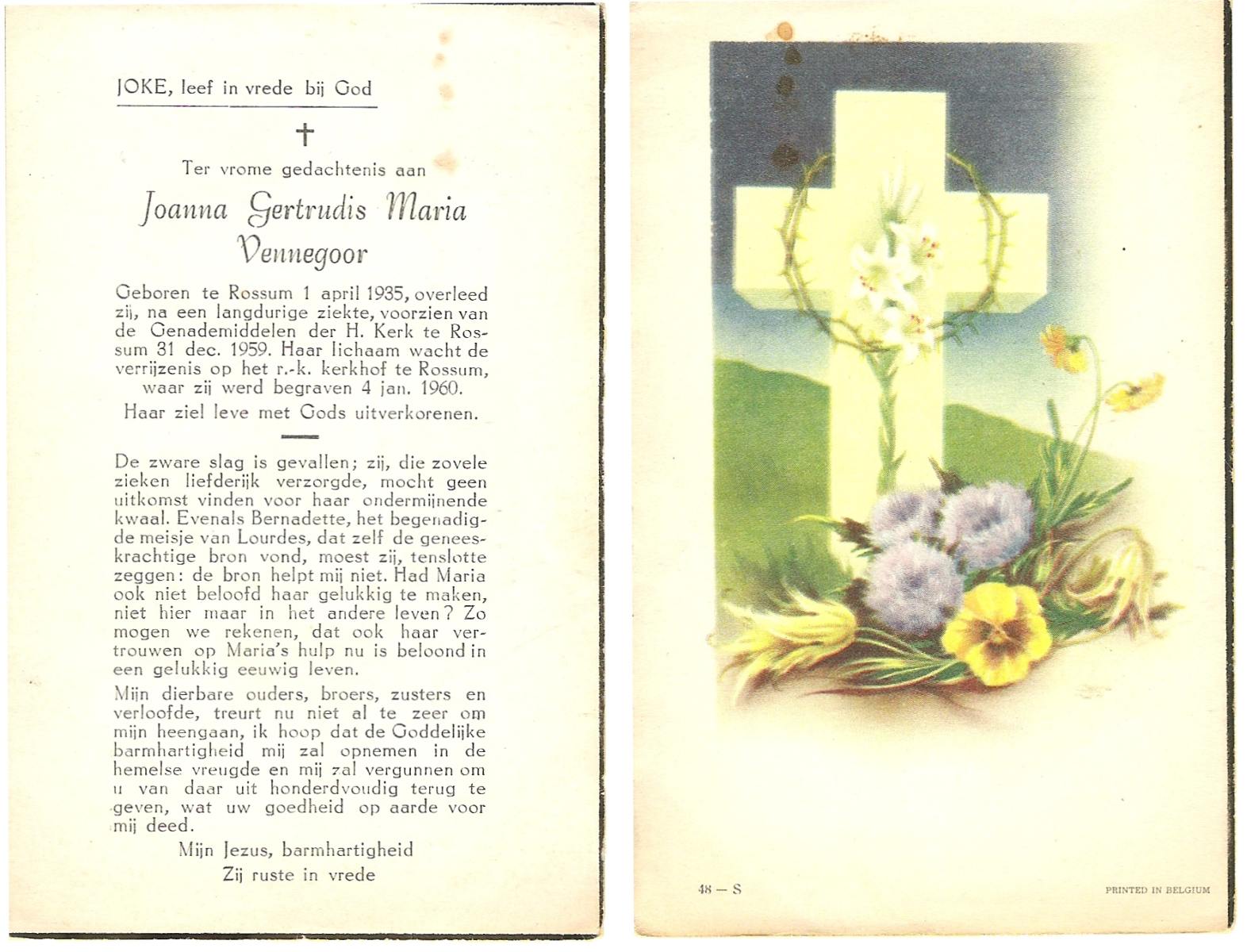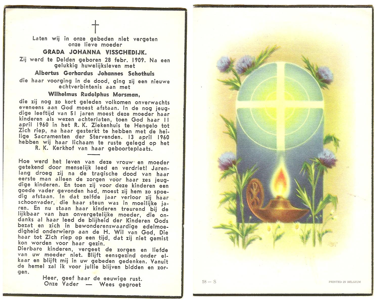 VISSCHEDIJK, Grada Johanna, geboren op 28-2-1909 te Delden, overleden op 11-4-1960 te Hengelo (Ov.) op 51-jarige leeftijd, begraven op 13-4-1960 te Delden parochie-kerkhof H.Blasius.