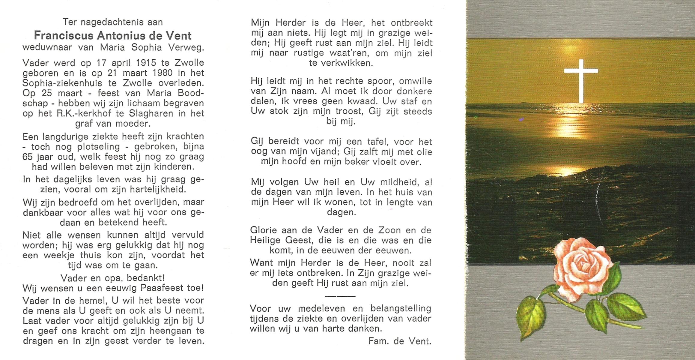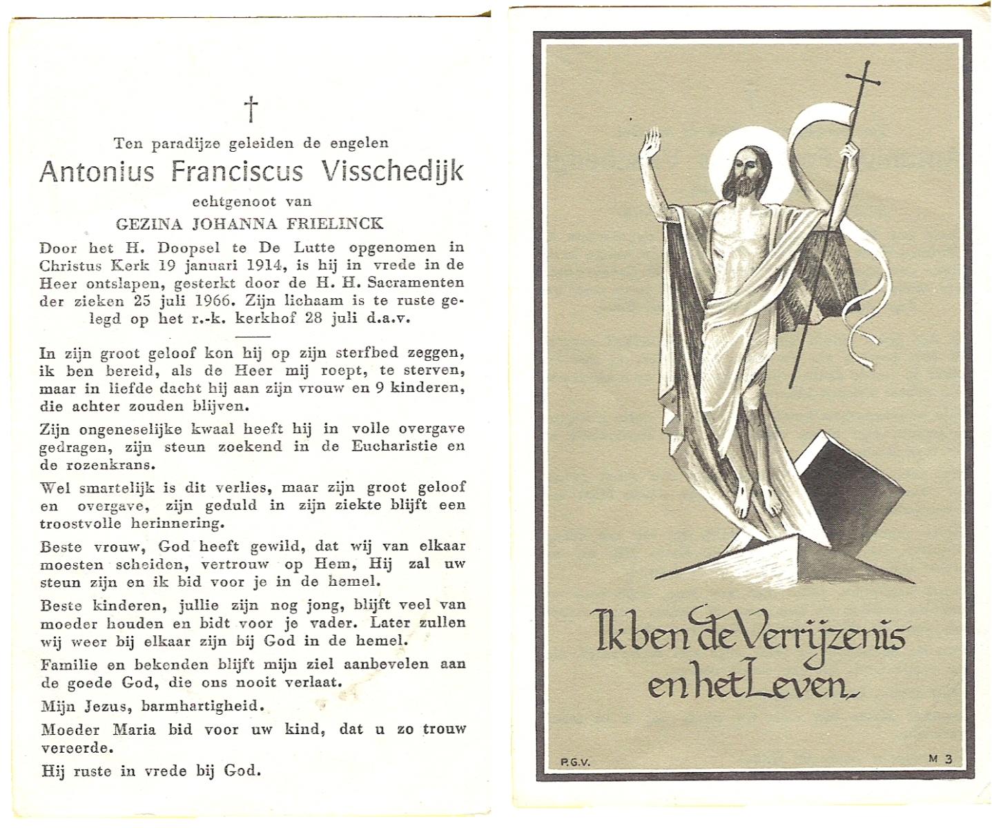 VISSCHEDIJK, Antonius Franciscus, geboren op 19-1-1914 te De Lutte, overleden op 25-7-1966 op 52-jarige leeftijd, begraven op 28-7-1966.