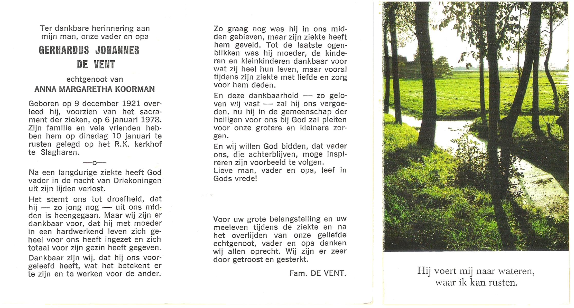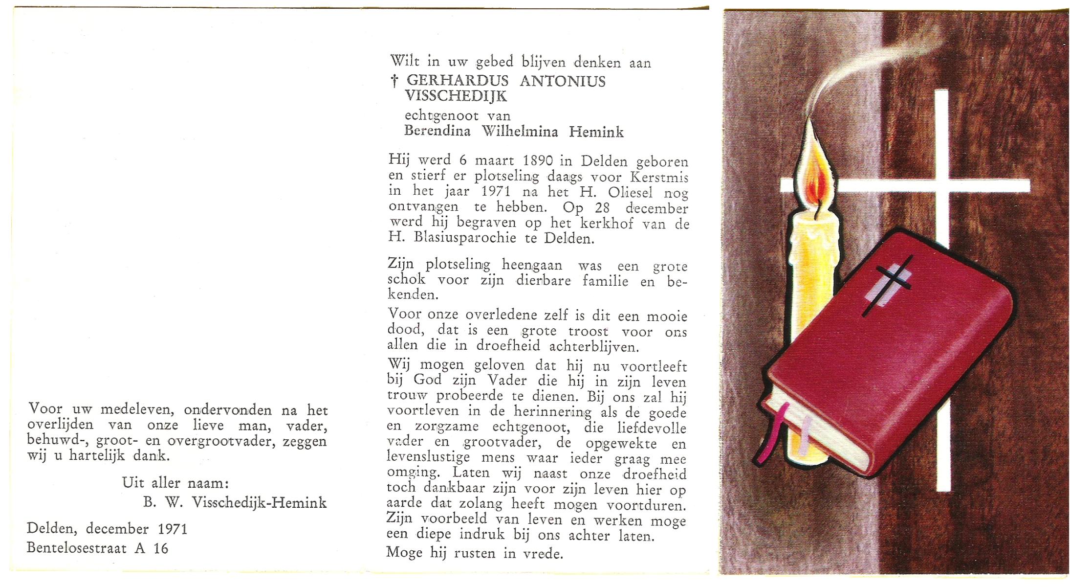 VISSCHEDIJK, Gerhardus Antonius, geboren op 06-03-1890 te Delden, overleden op 24-12-1971 te Delden op 81-jarige leeftijd, begraven op 28-12-1971 te Delden.