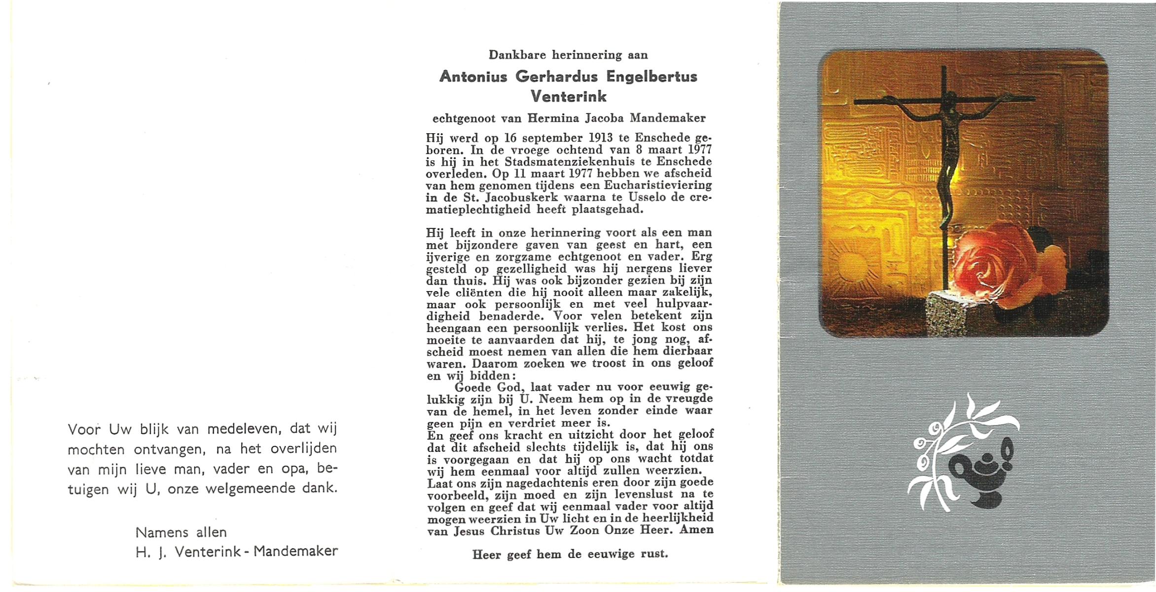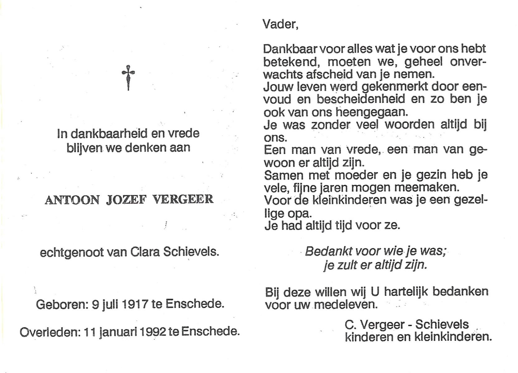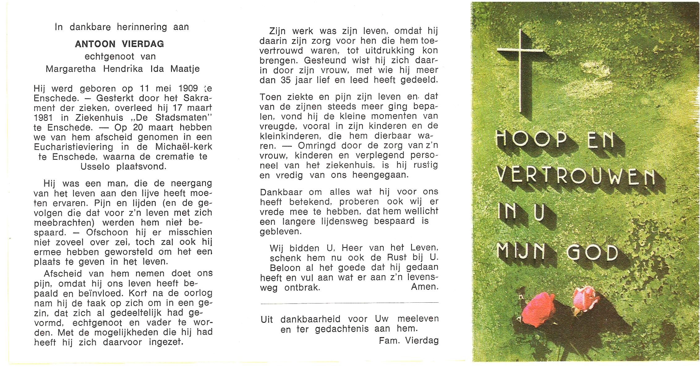 VIERDAG, Antoon, geboren op 11-5-1909 te Enschede, overleden op 17-3-1981 te Enschede op 71-jarige leeftijd, gecremeerd op 20-3-1981 te Usselo.